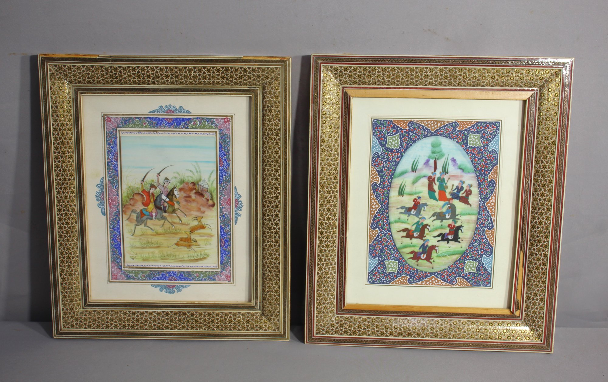 Two original paintings depicting lively Middle Eastern scenes, alive with color and action.