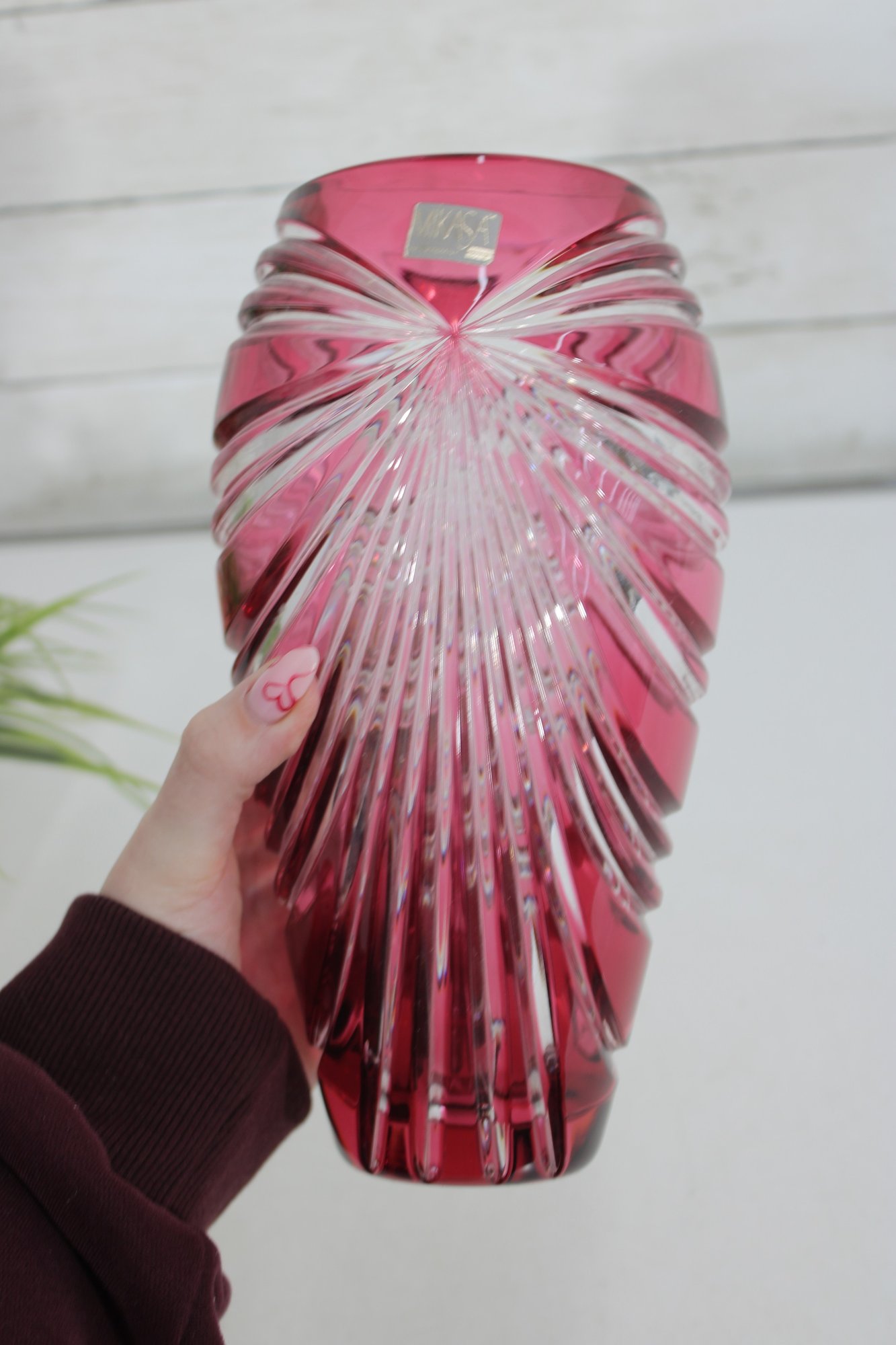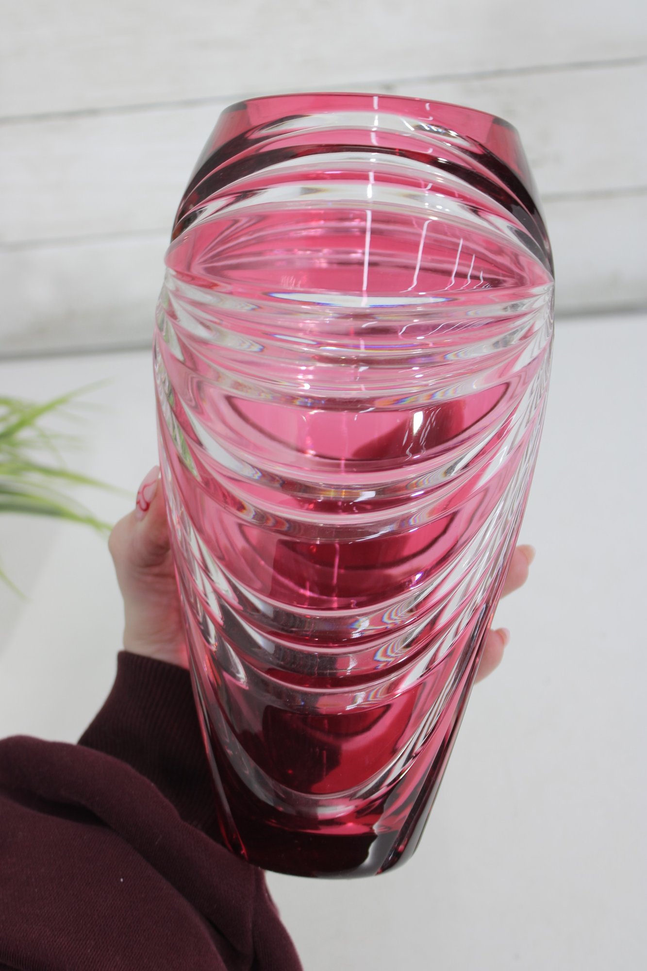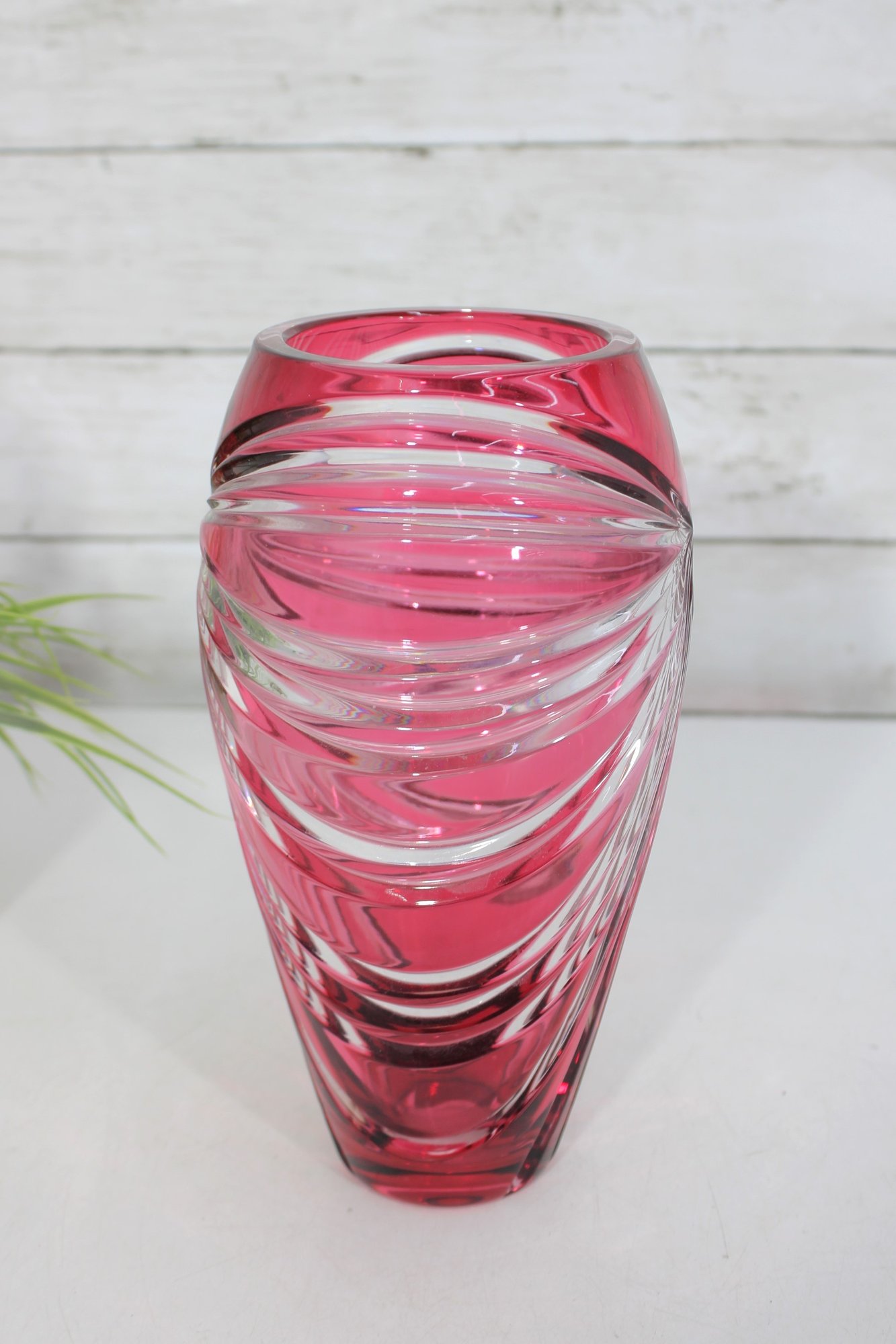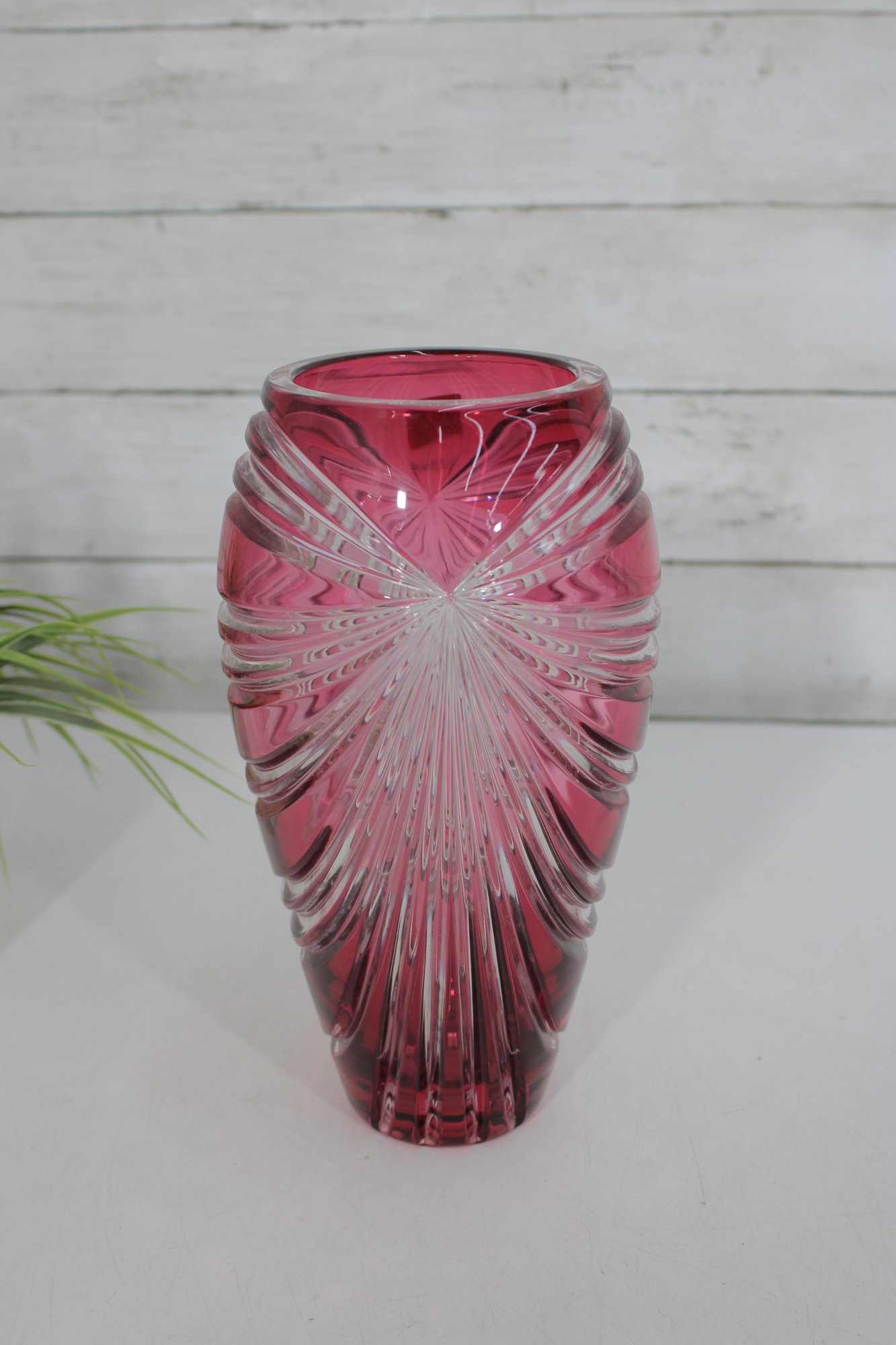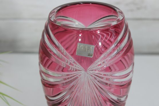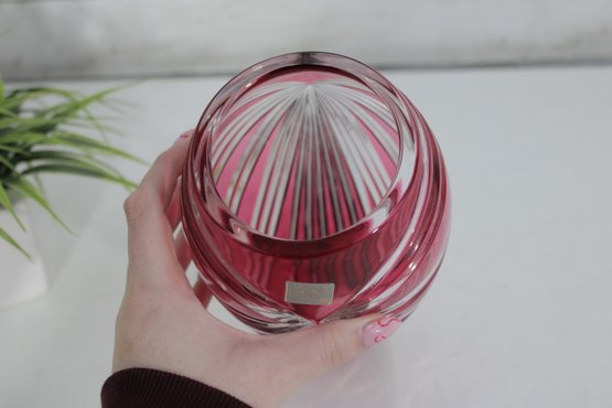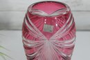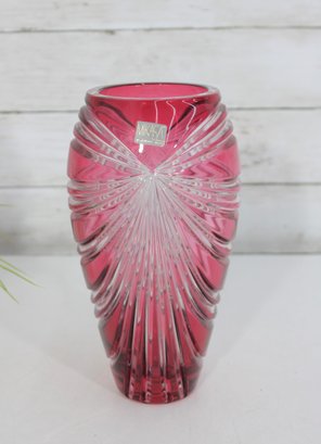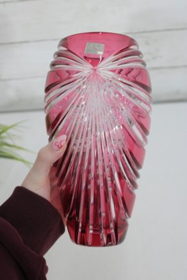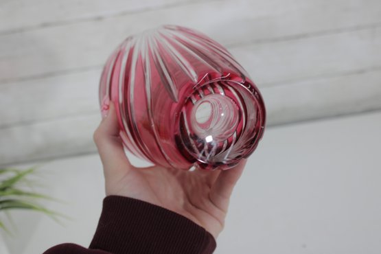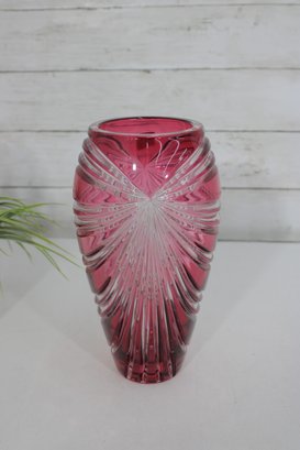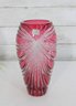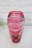 Make a bold decorative statement with this striking 9.5-inch tall ruby red art glass vase featuring dramatic cut and faceted detailing. The rich, vibrant red color combined with sweeping clear cut patterns creates a dazzling light-catching effect from every angle.
