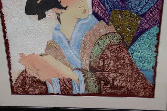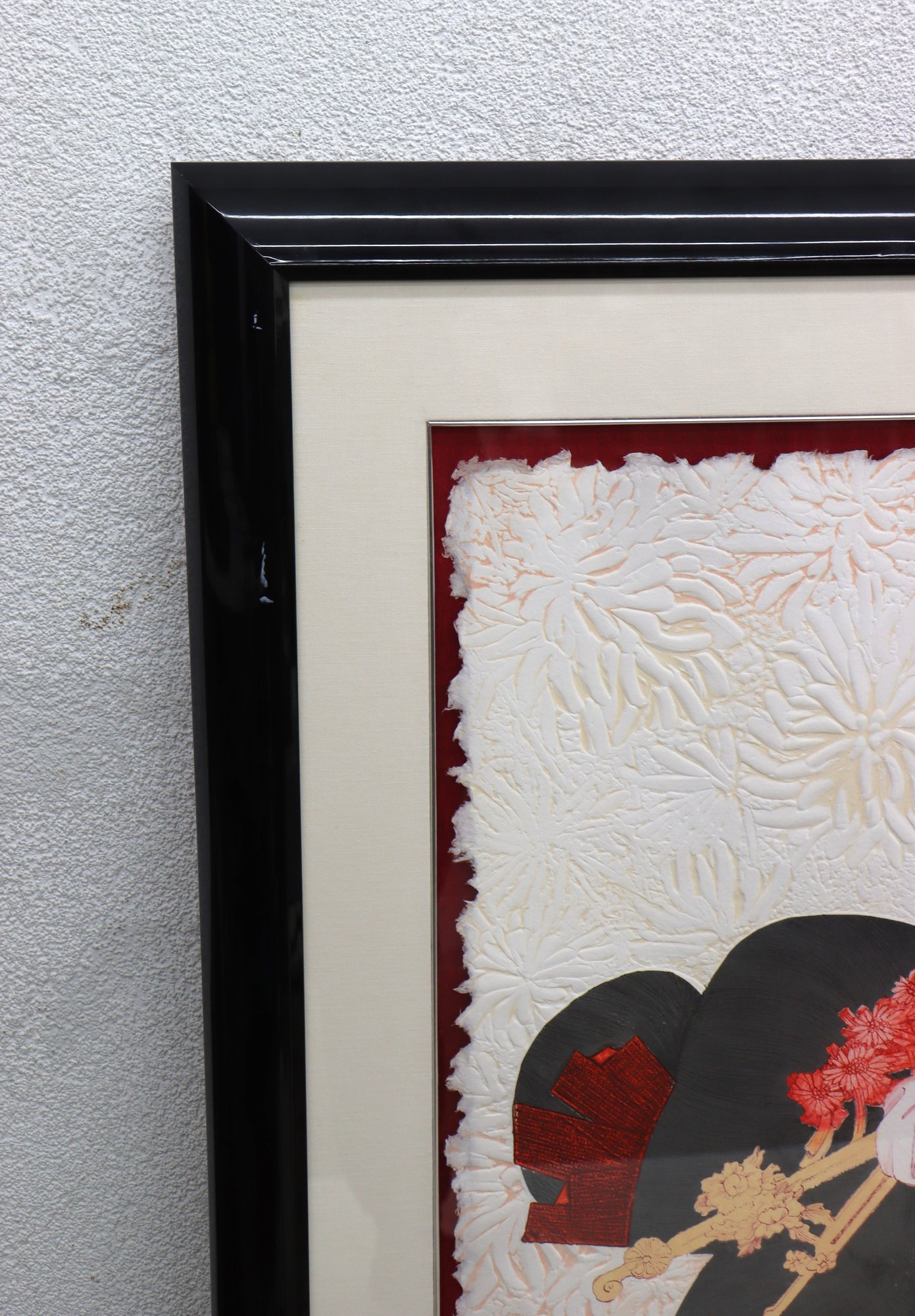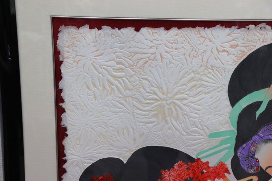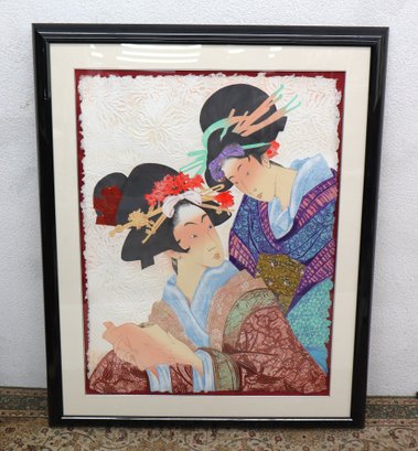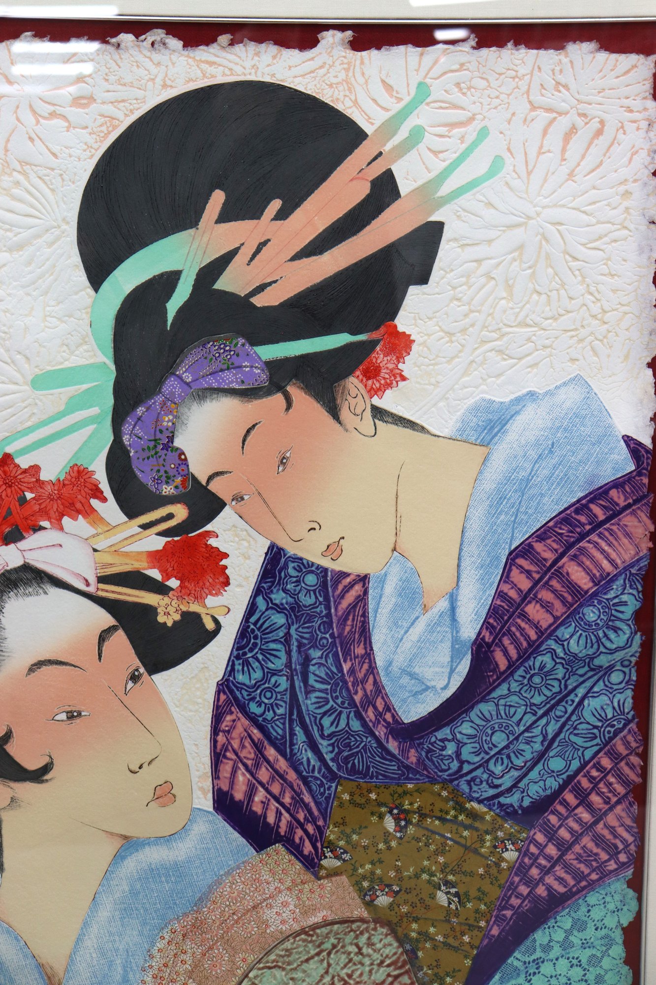 The artwork portrays two elegant women in traditional Japanese attire, rendered with graceful lines and intricate textile patterns. The embossed floral background adds stunning three-dimensional detail, enhancing the delicate and intimate mood of the scene.