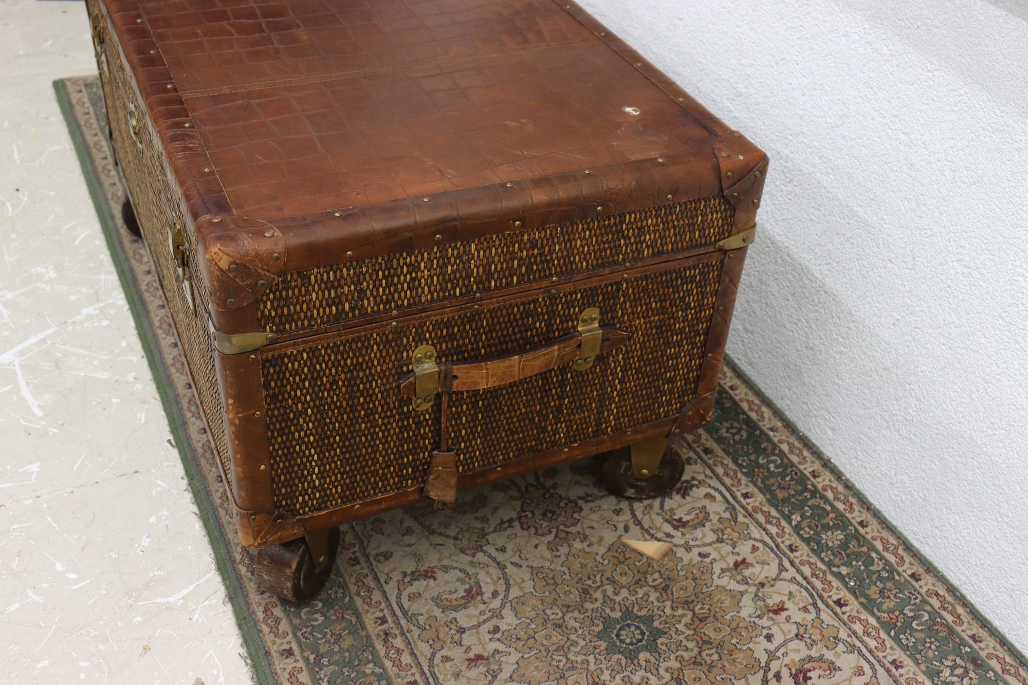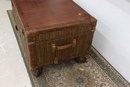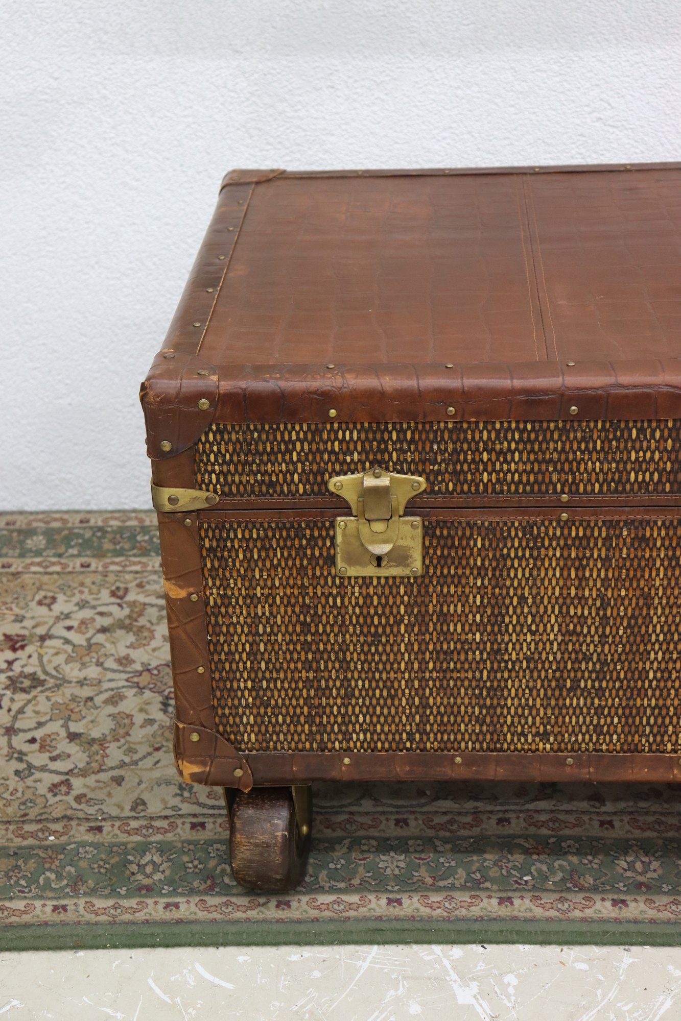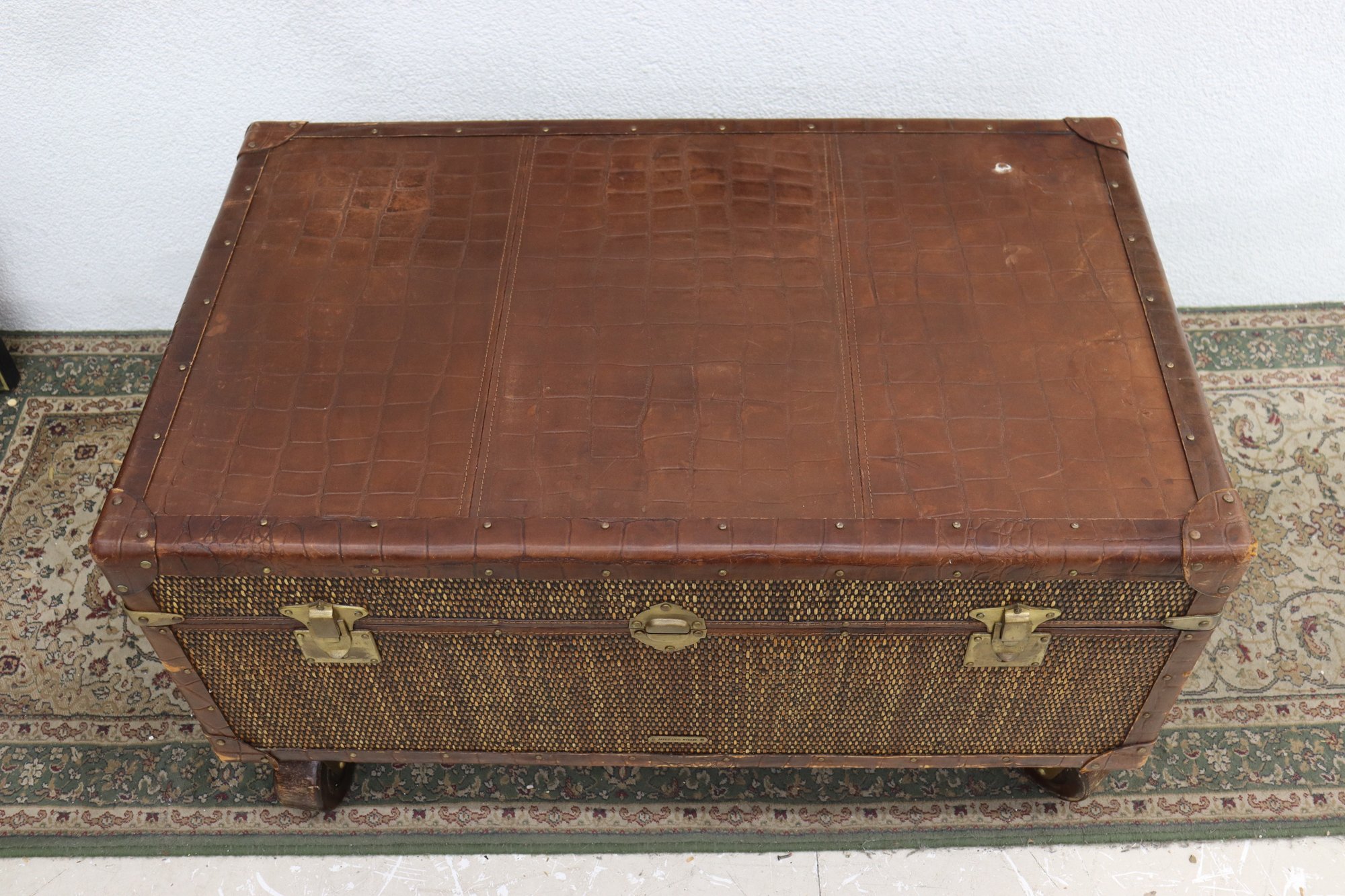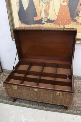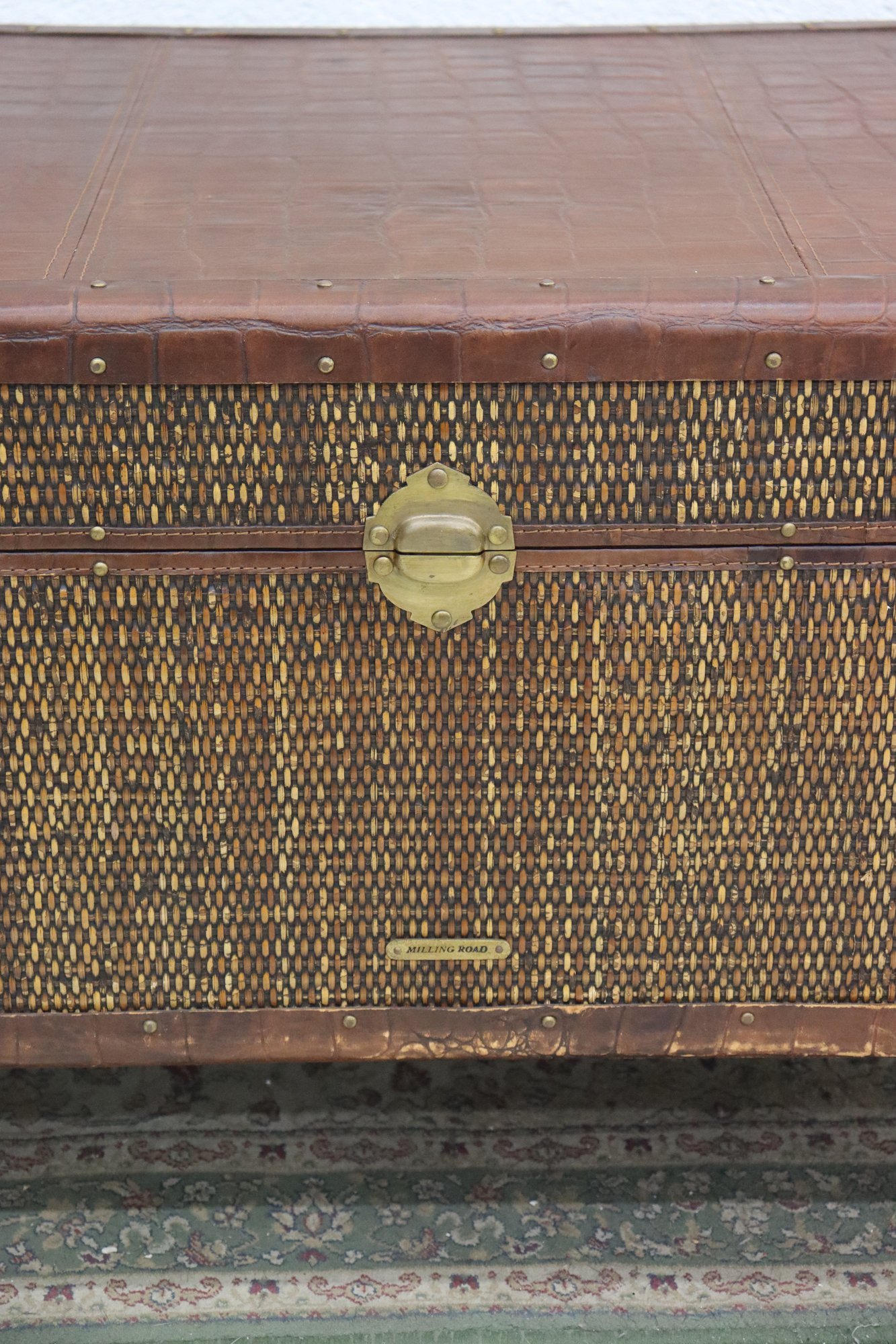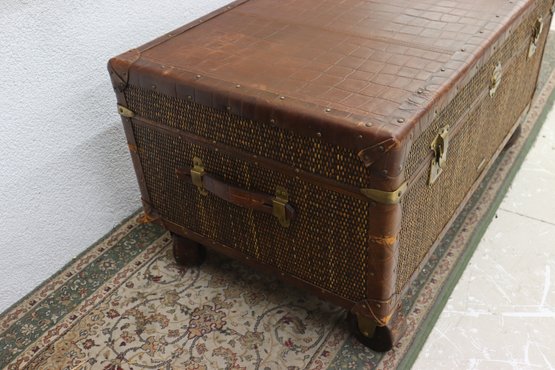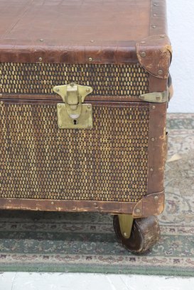 Beautifully crafted and full of timeless character, this Milling Road by Baker Furniture trunk blends luxury craftsmanship with functional design. The trunk features woven wicker paneling framed by rich leather trim, accented with brass hardware and mounted on rolling casters for easy movement.