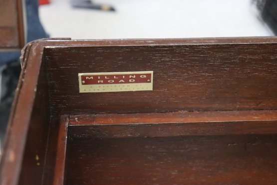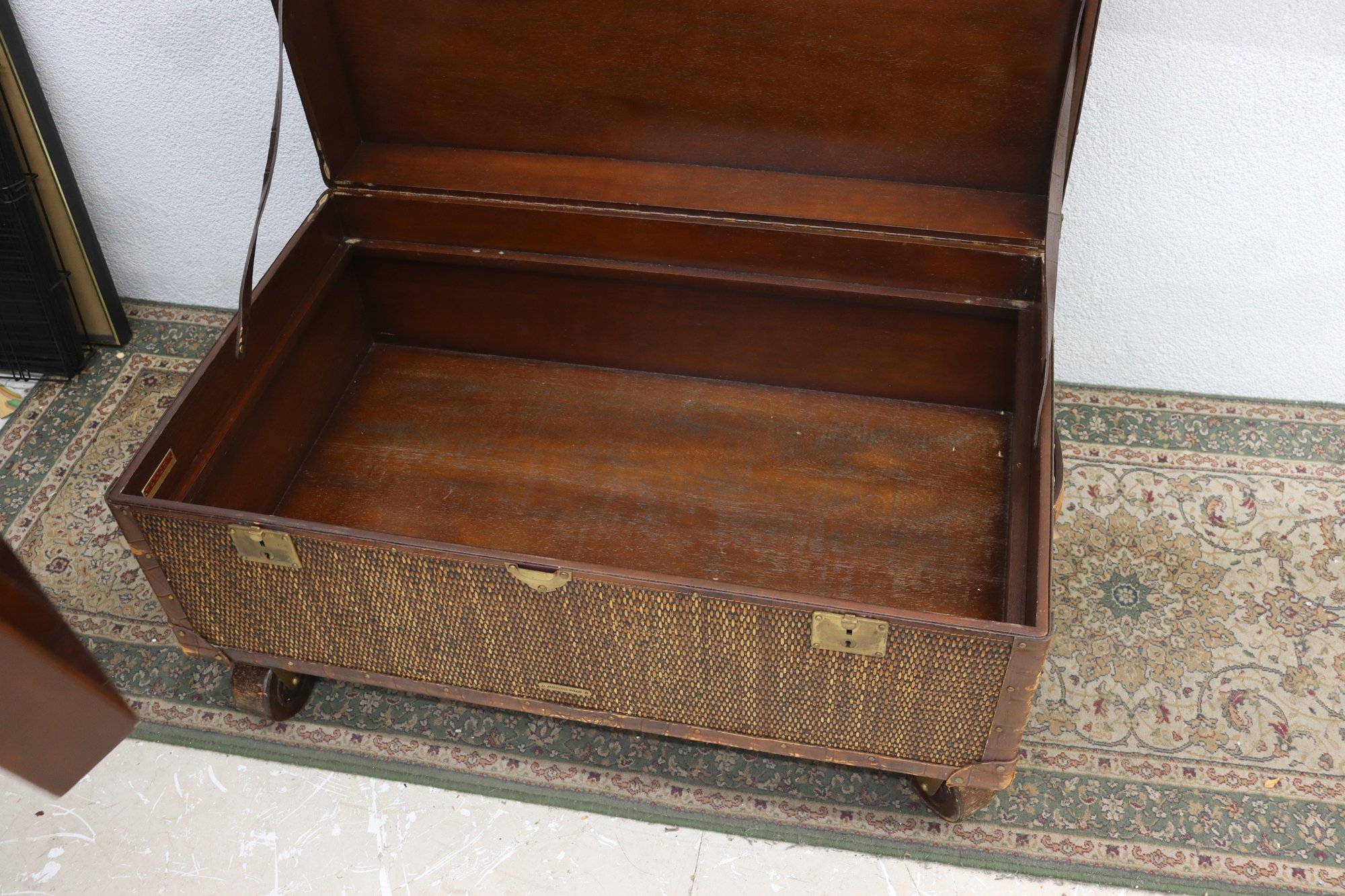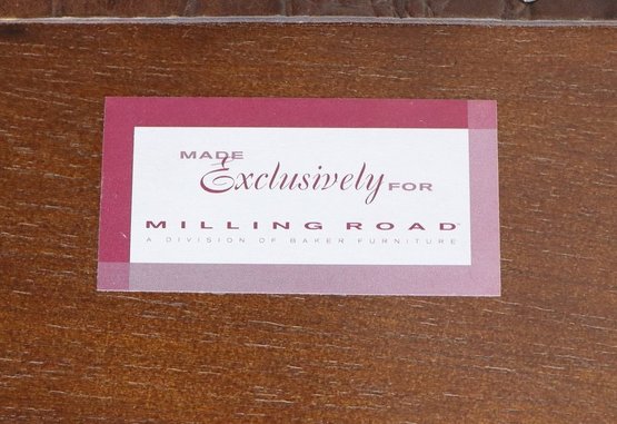 Inside, it reveals a fitted wooden interior with divided compartments, perfect for storing linens, accessories, or collectibles. The trunk retains its original Milling Road by Baker Furniture label, underscoring its quality and heritage.