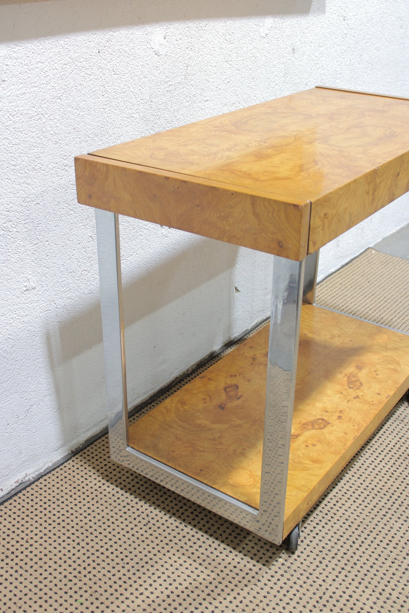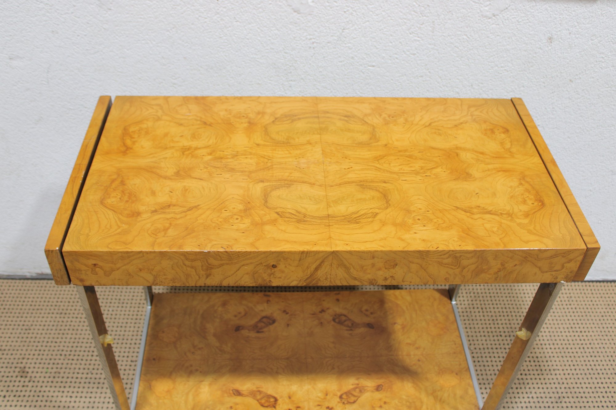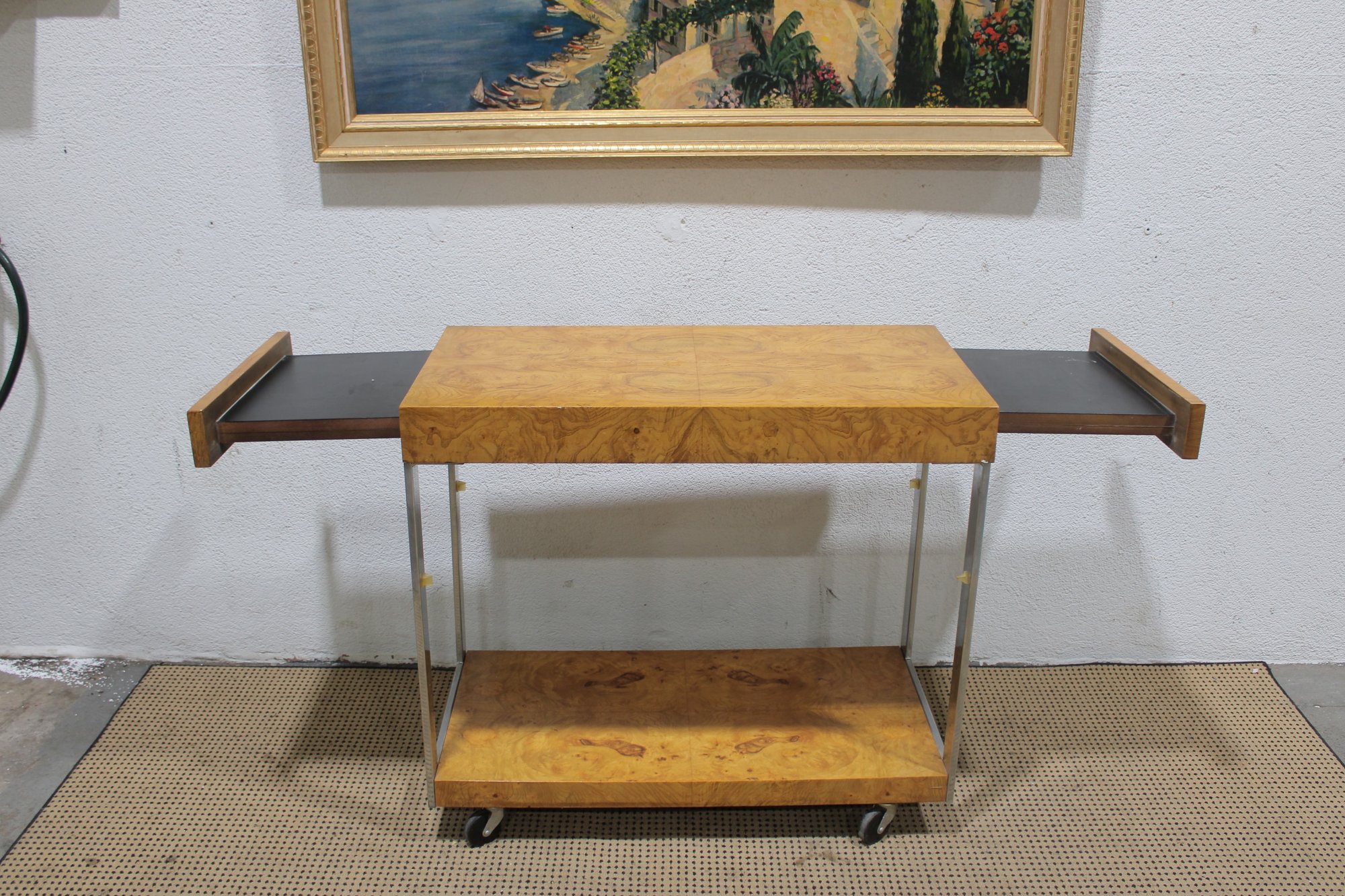 a vintage modern burl wood bar cart or serving cart featuring a beautiful figured veneer top and lower shelf. The cart includes pull-out side extensions that expand the serving surface, making it ideal for entertaining.