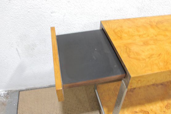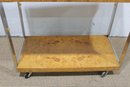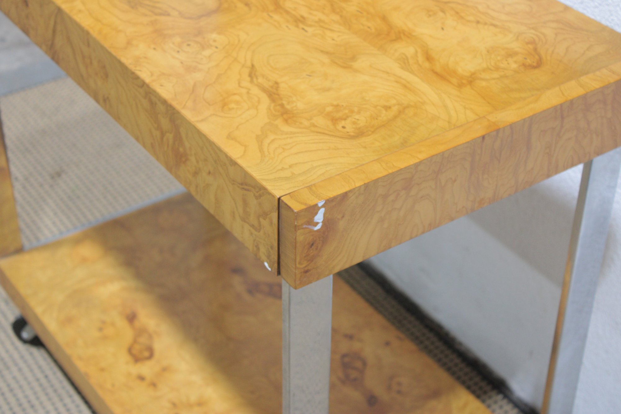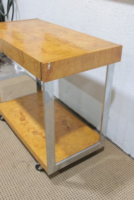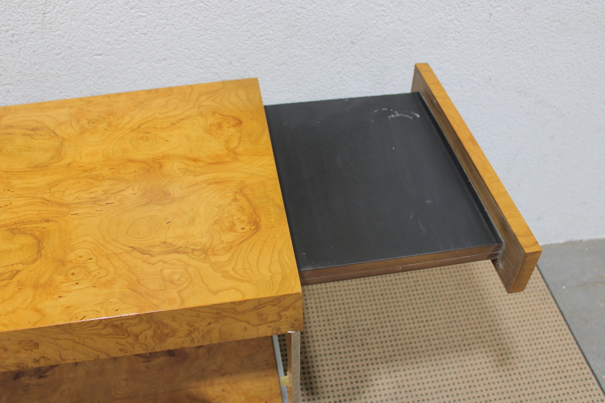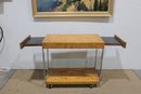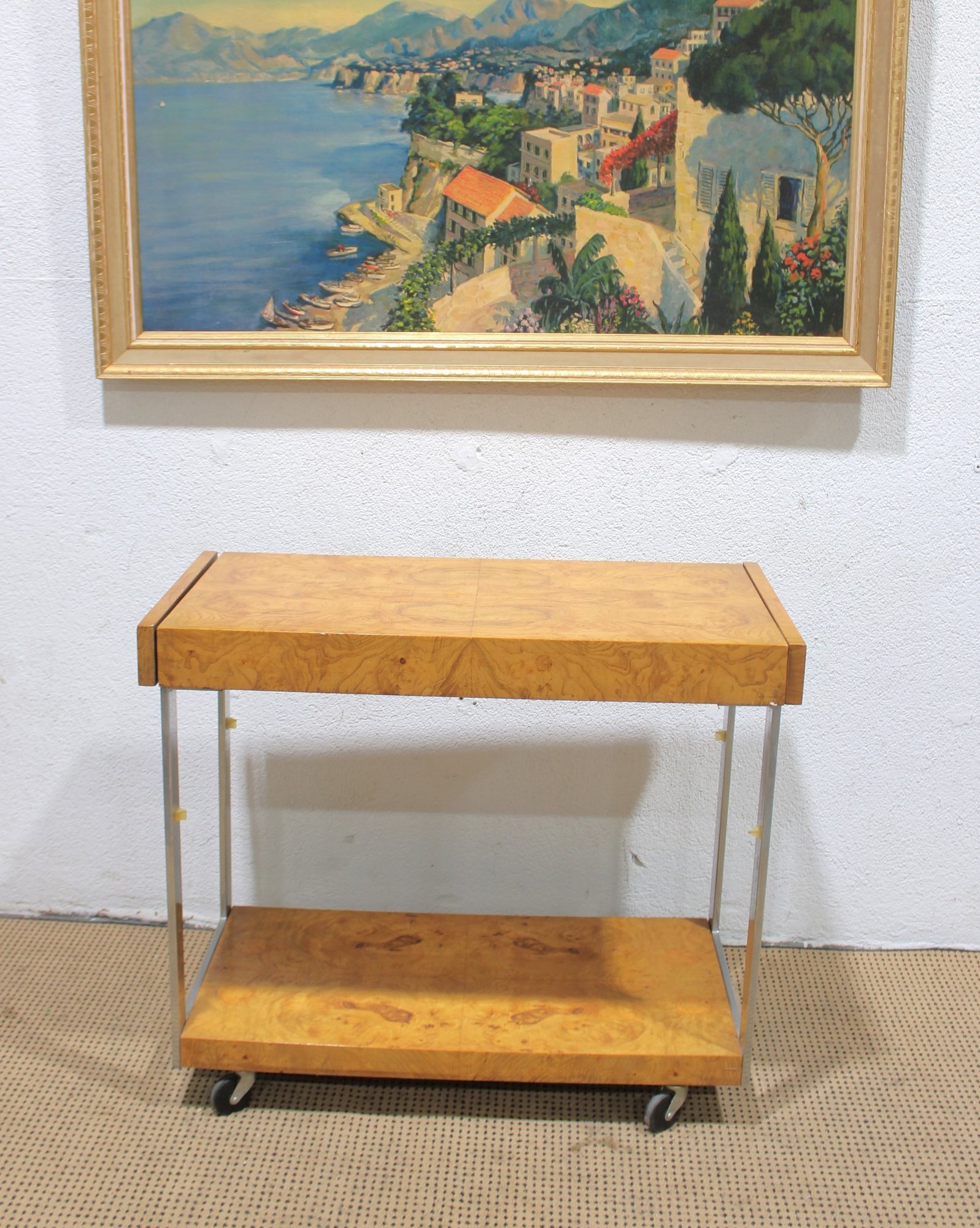 a vintage modern burl wood bar cart or serving cart featuring a beautiful figured veneer top and lower shelf. The cart includes pull-out side extensions that expand the serving surface, making it ideal for entertaining.