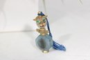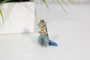 This charming piece showcases a faceted light blue crystal-style bottle base with gold-tone accents. The topper features a detailed cat figure with painted facial features, green eyes, and a small hat, accented with a blue cord tassel flowing from the back. The stopper includes a small plastic dauber insert.