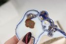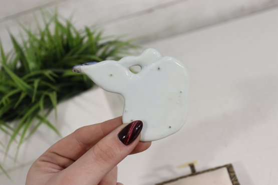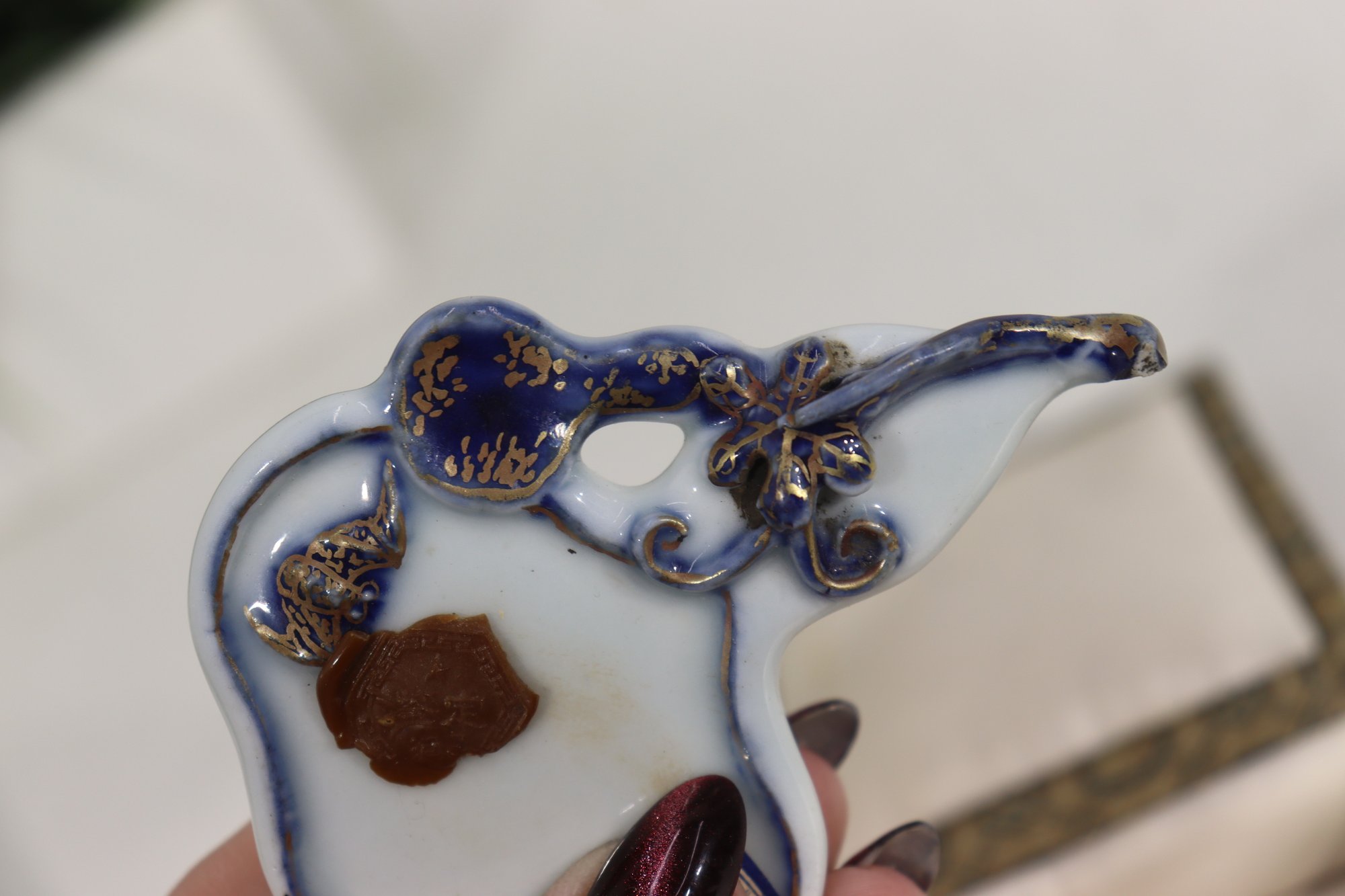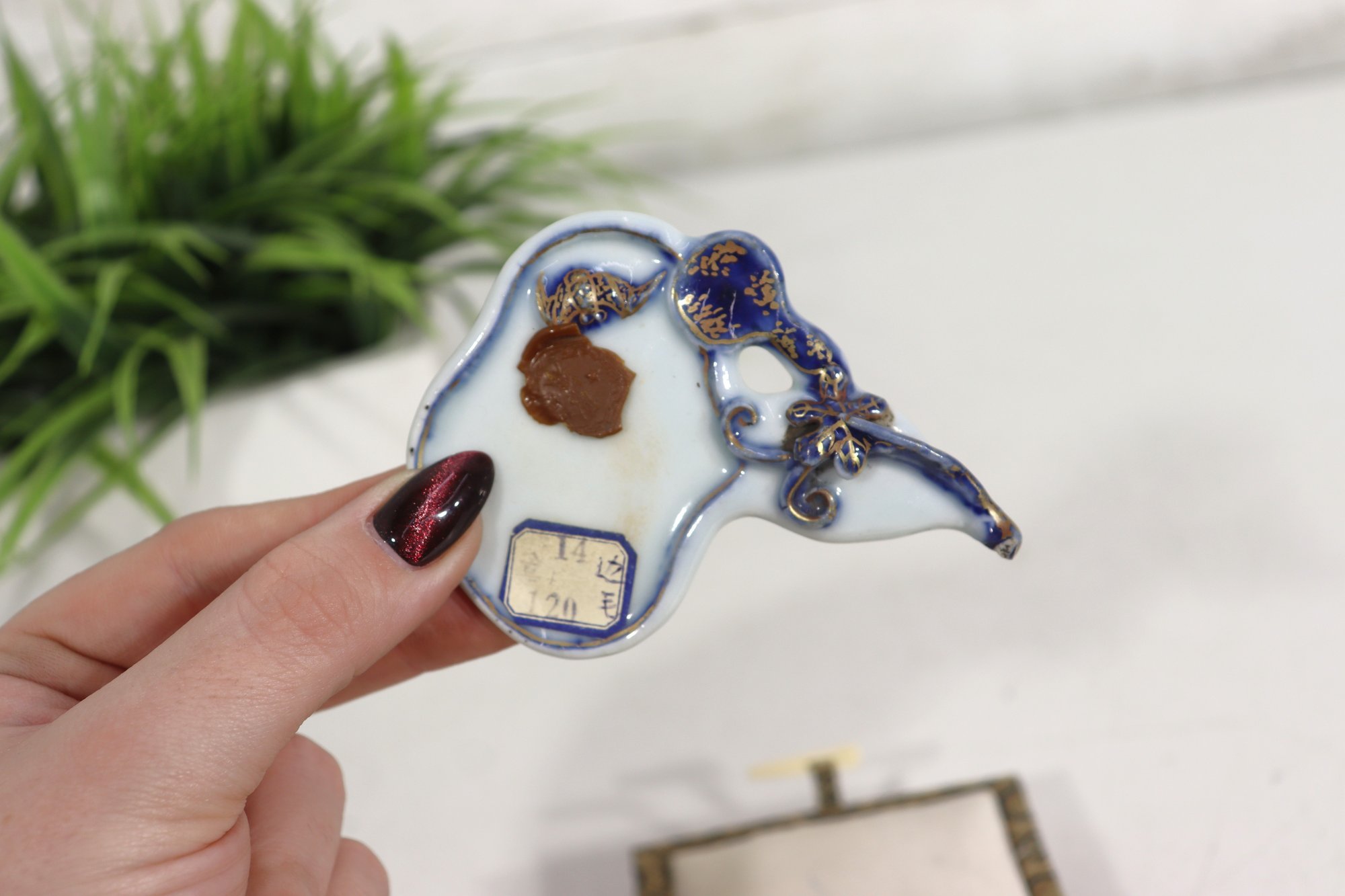 miniature hand-painted porcelain ornament or hanging plaque, decorated in classic cobalt blue and gold gilt accents. The organic, flowing form features raised decorative elements and fine detailing, giving it an elegant, Old World look.