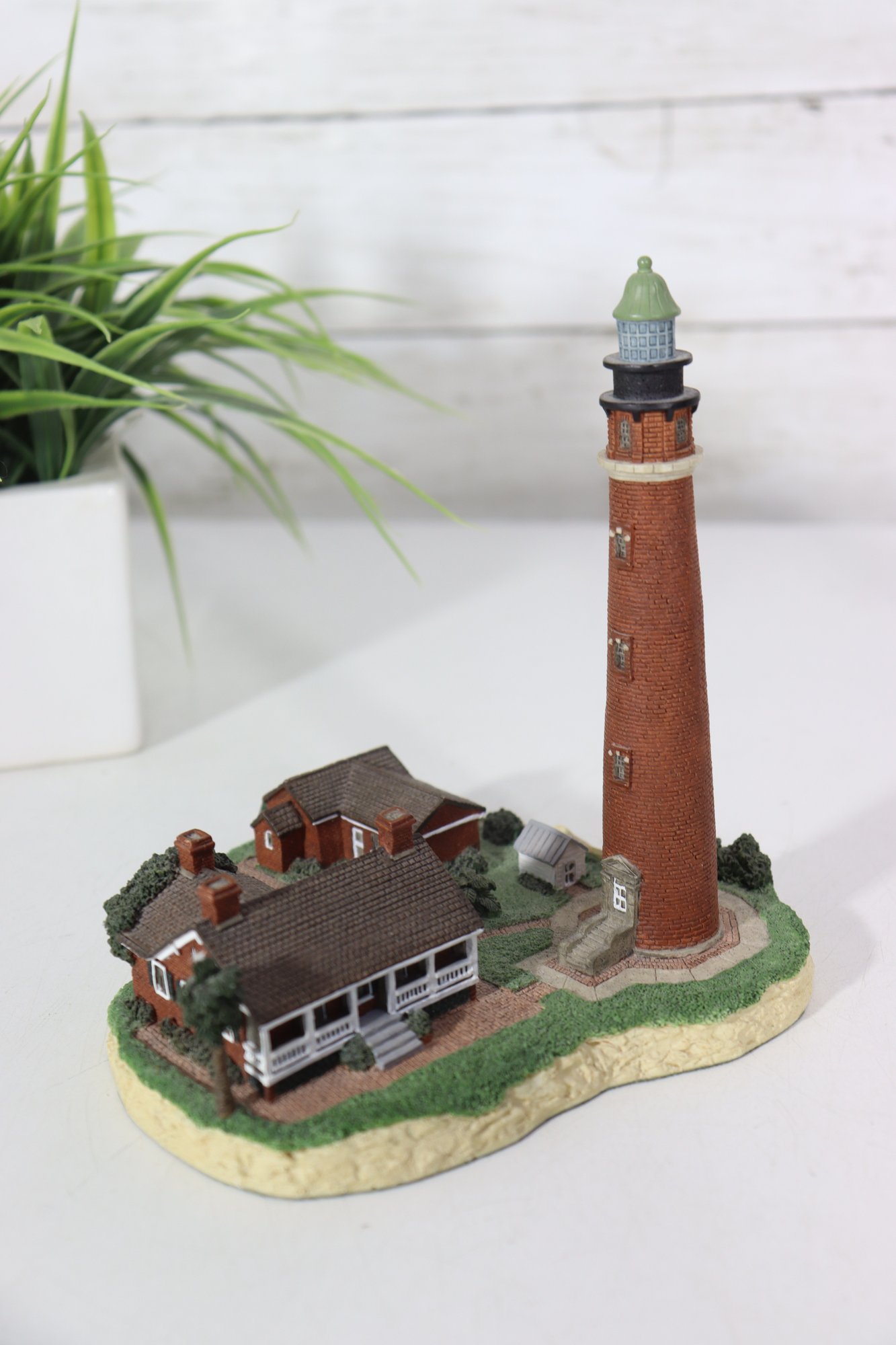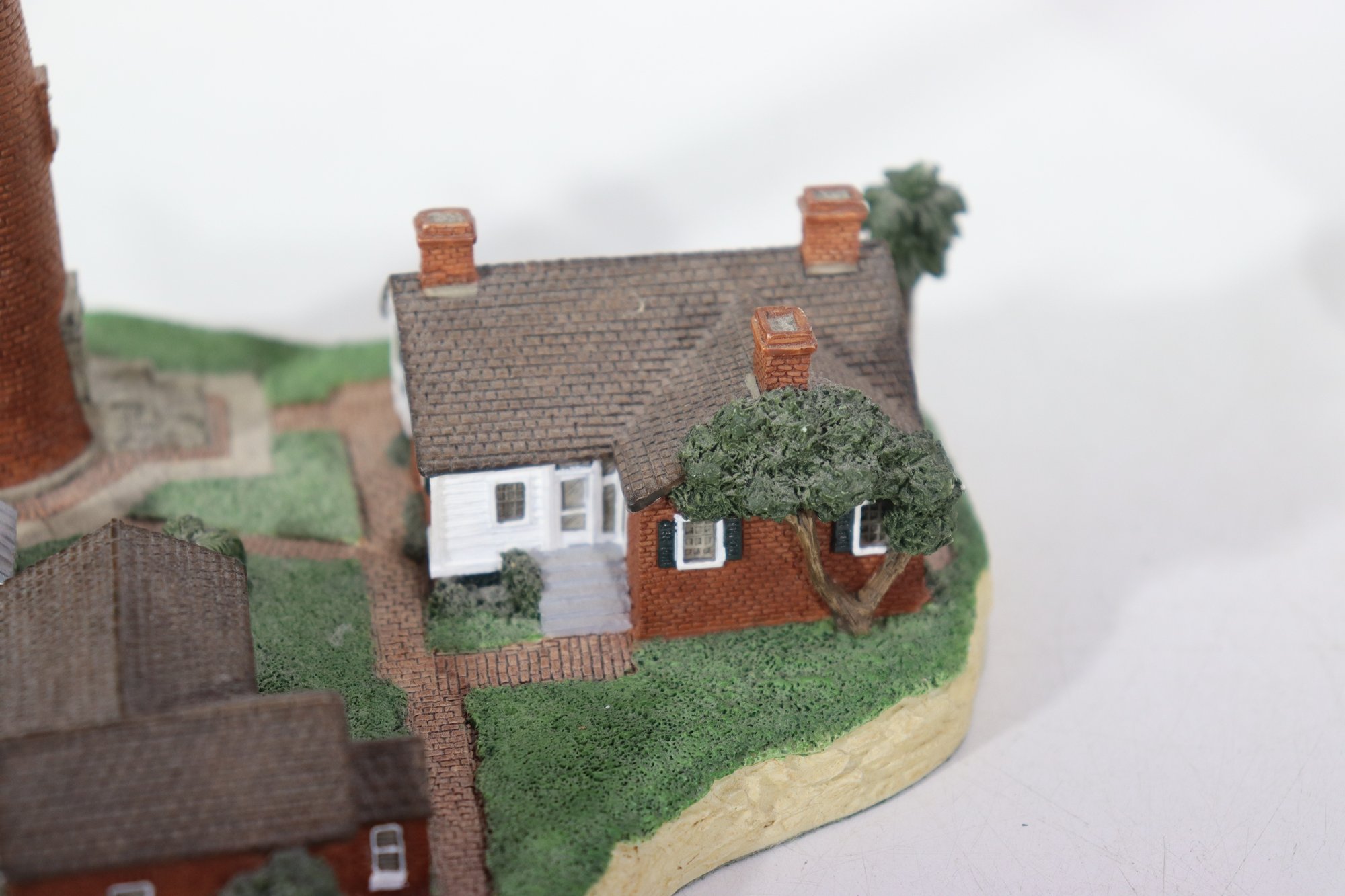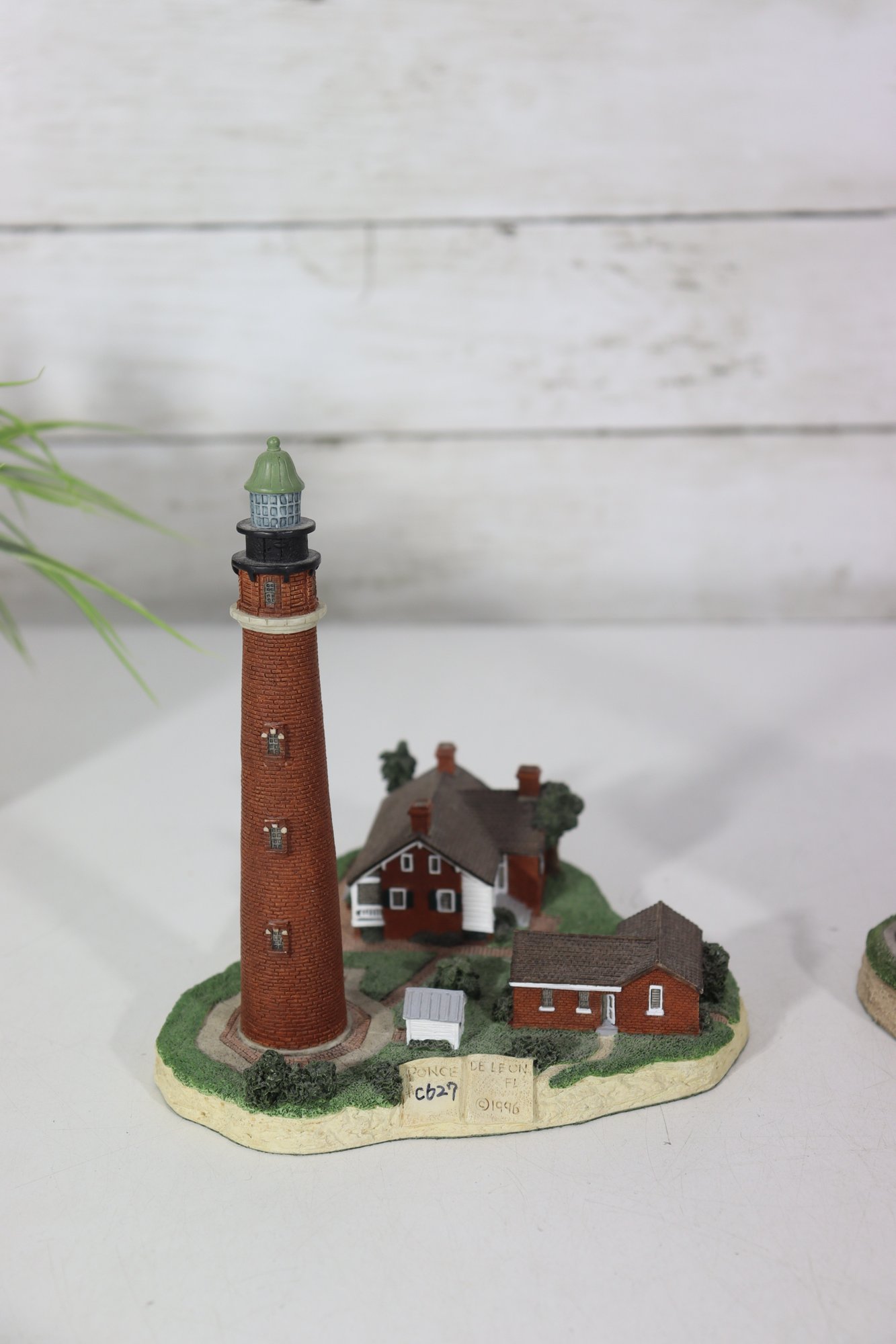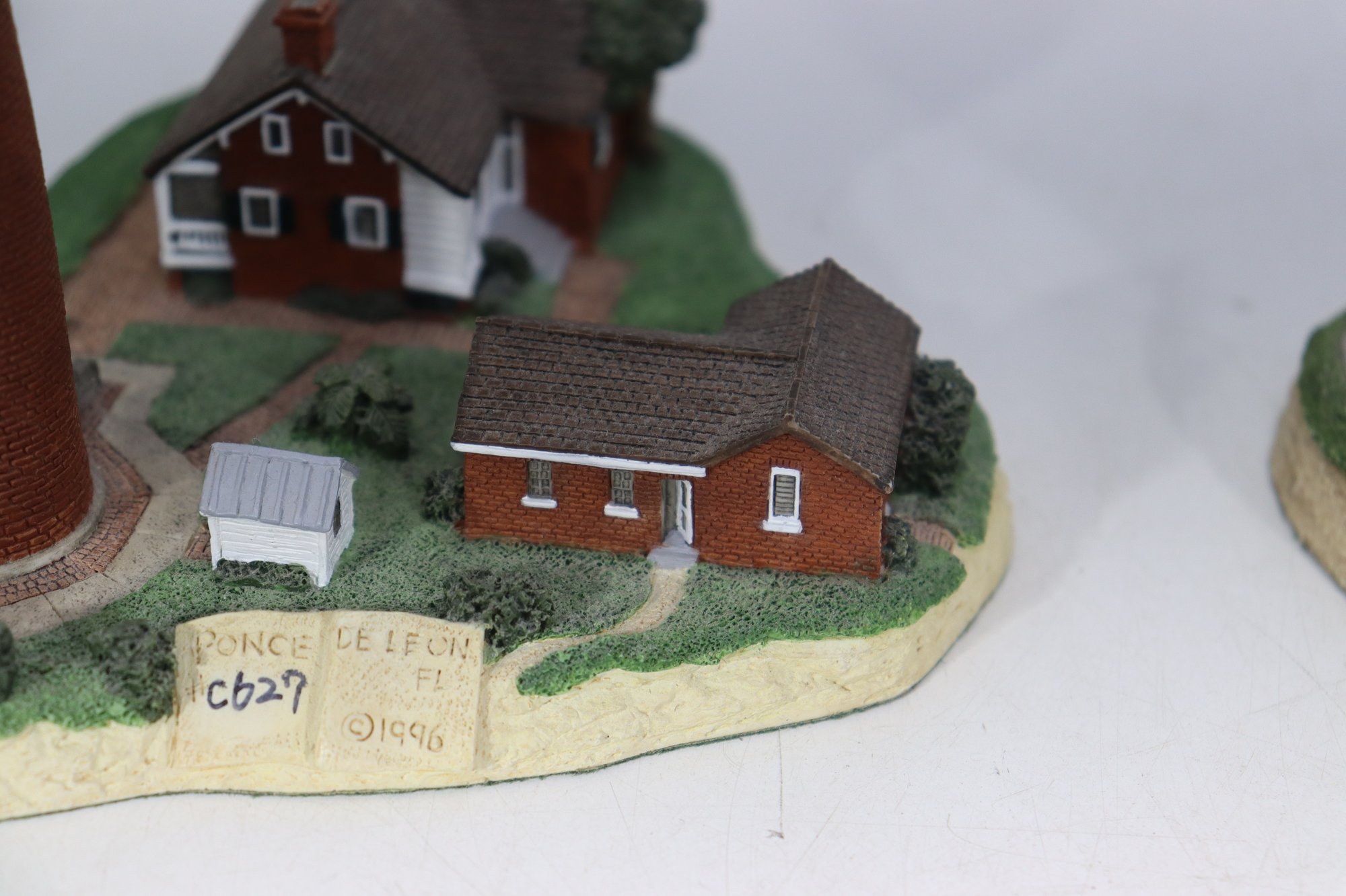 a charming miniature lighthouse village figurine set, featuring two detailed coastal scenes, each measuring approximately 6 inches tall. These pieces showcase classic seaside architecture with lighthouses, cottages, pathways, greenery, and shoreline details.