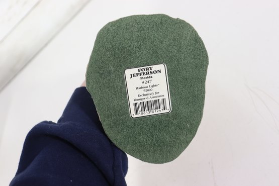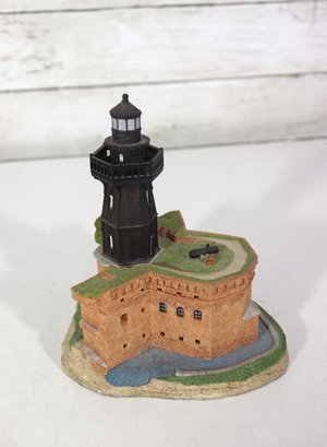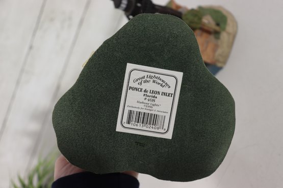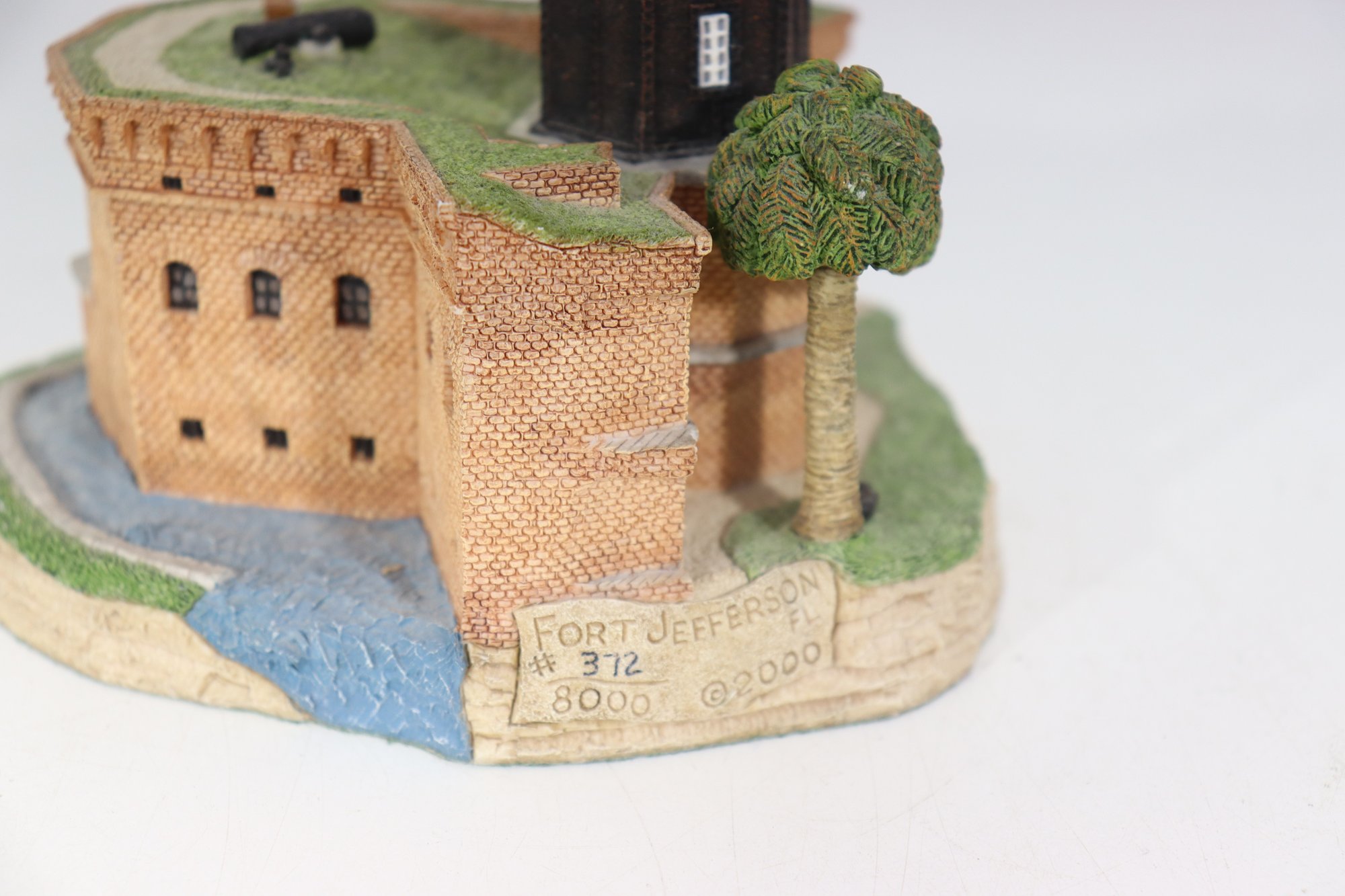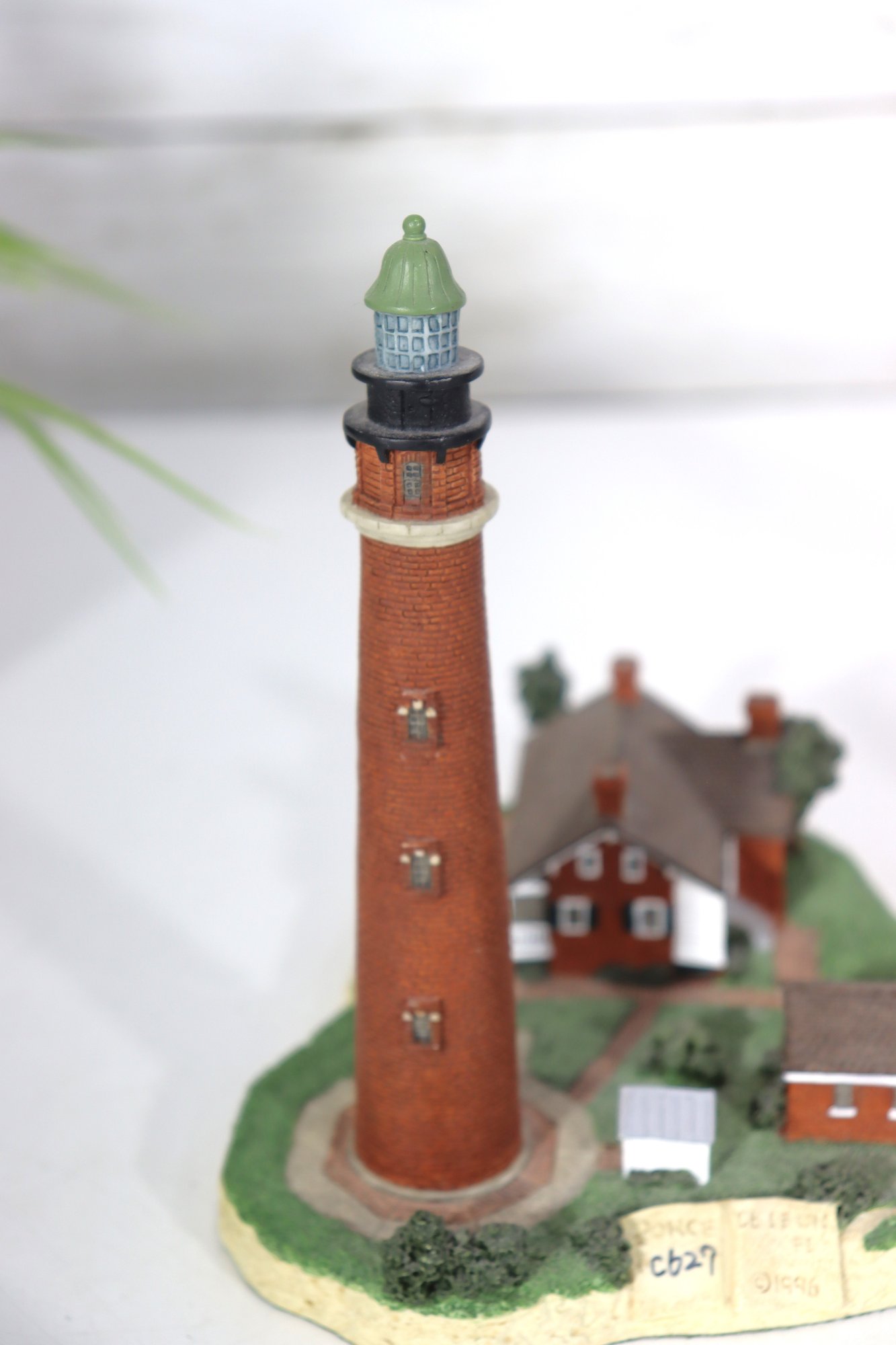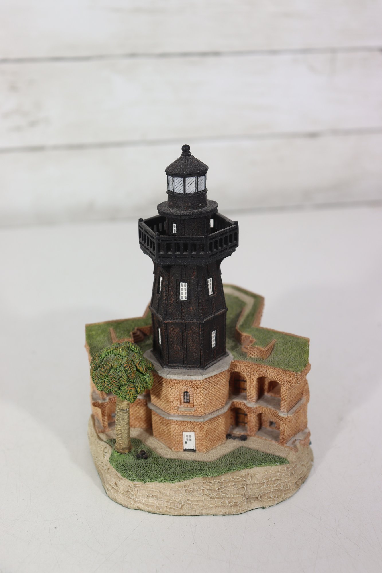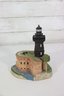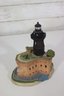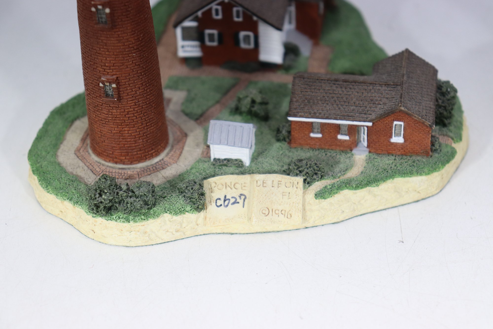 a charming miniature lighthouse village figurine set, featuring two detailed coastal scenes, each measuring approximately 6 inches tall. These pieces showcase classic seaside architecture with lighthouses, cottages, pathways, greenery, and shoreline details.