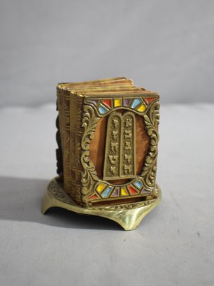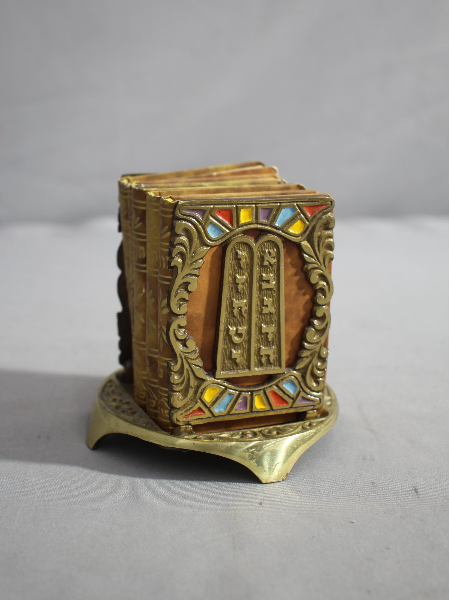 The Five Books of Moses, a central piece in Jewish tradition and heritage. Published by Sinai Publishing, this Hebrew Bible is a testament to the rich history of Judaic scholarship. Its brass stand showcases an intricate design with colored inlays, invoking the historic and spiritual significance of the Sinai revelation.