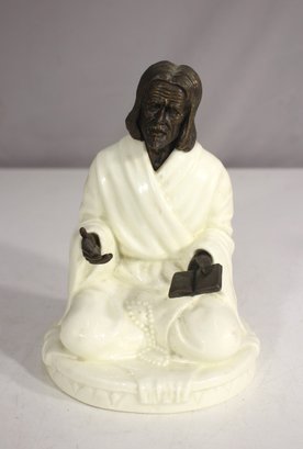 a rare and elegant Minton porcelain figurine, titled "The Sage", standing 7 inches tall. This finely crafted piece features a seated scholar or religious figure, dressed in flowing robes, holding an open book and gesturing with his hand. The figurine is distinguished by its contrasting bisque and glazed porcelain finish, with a detailed dark bronze-tone face and hands, adding depth and character to the design.