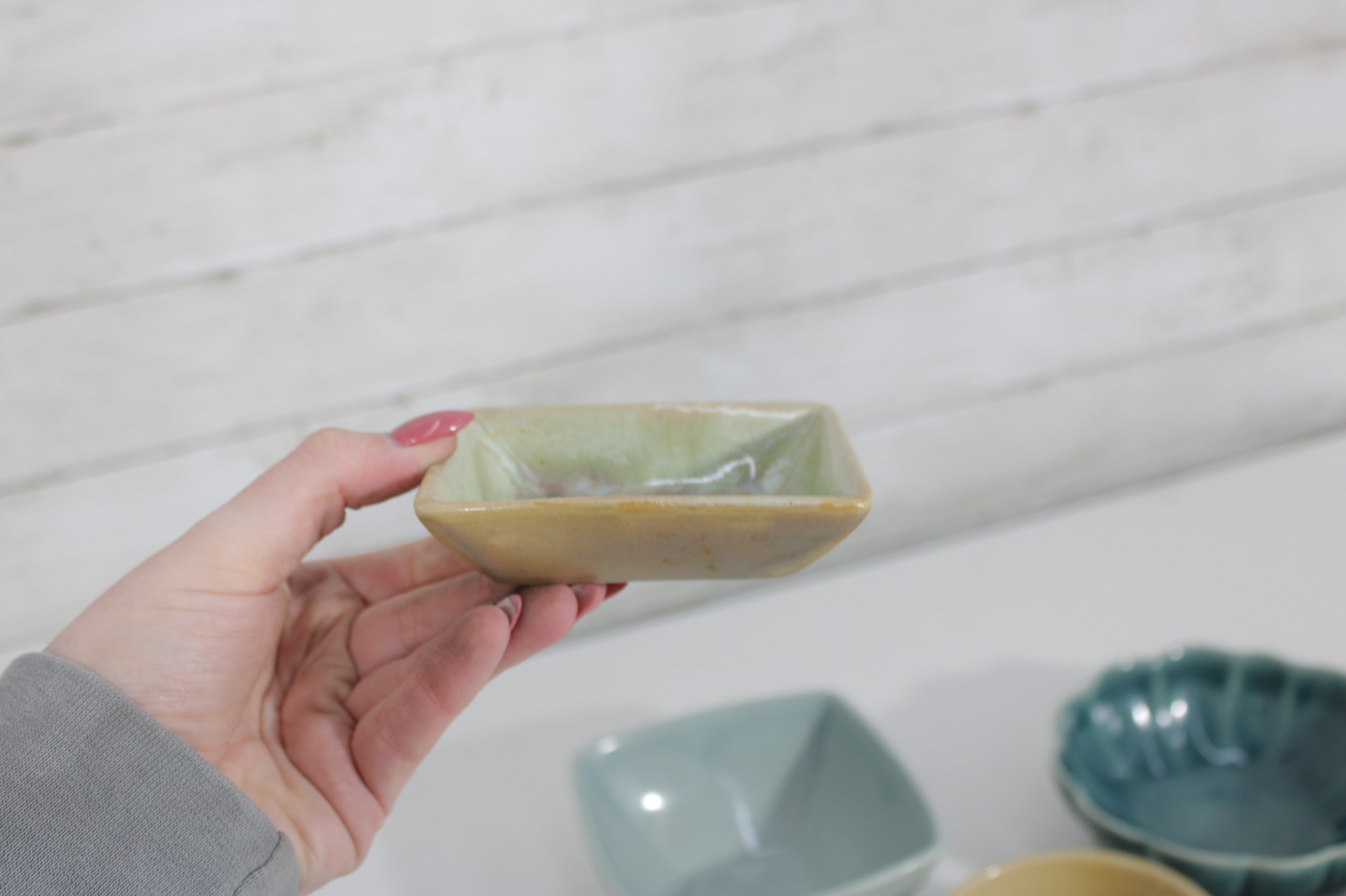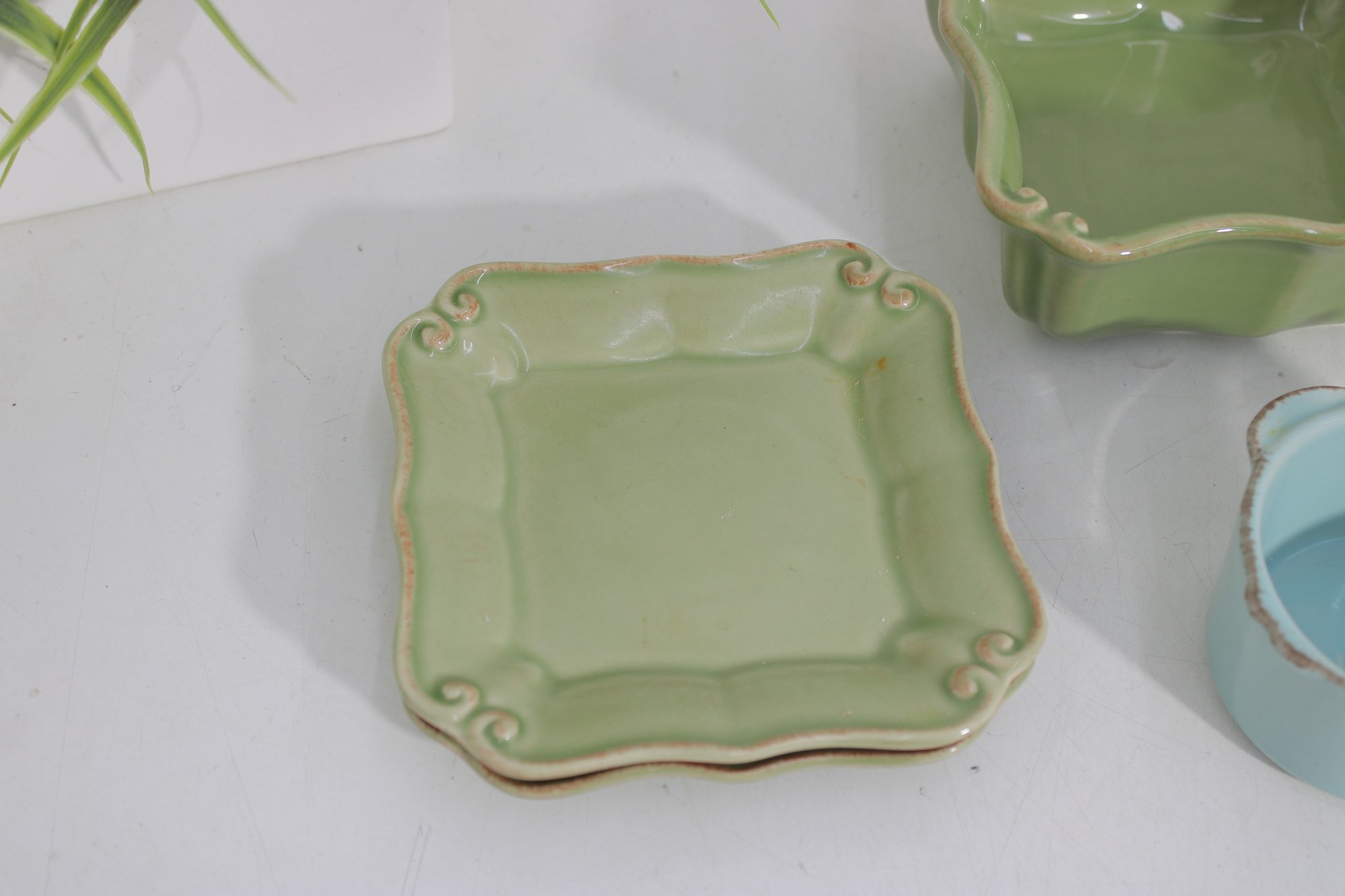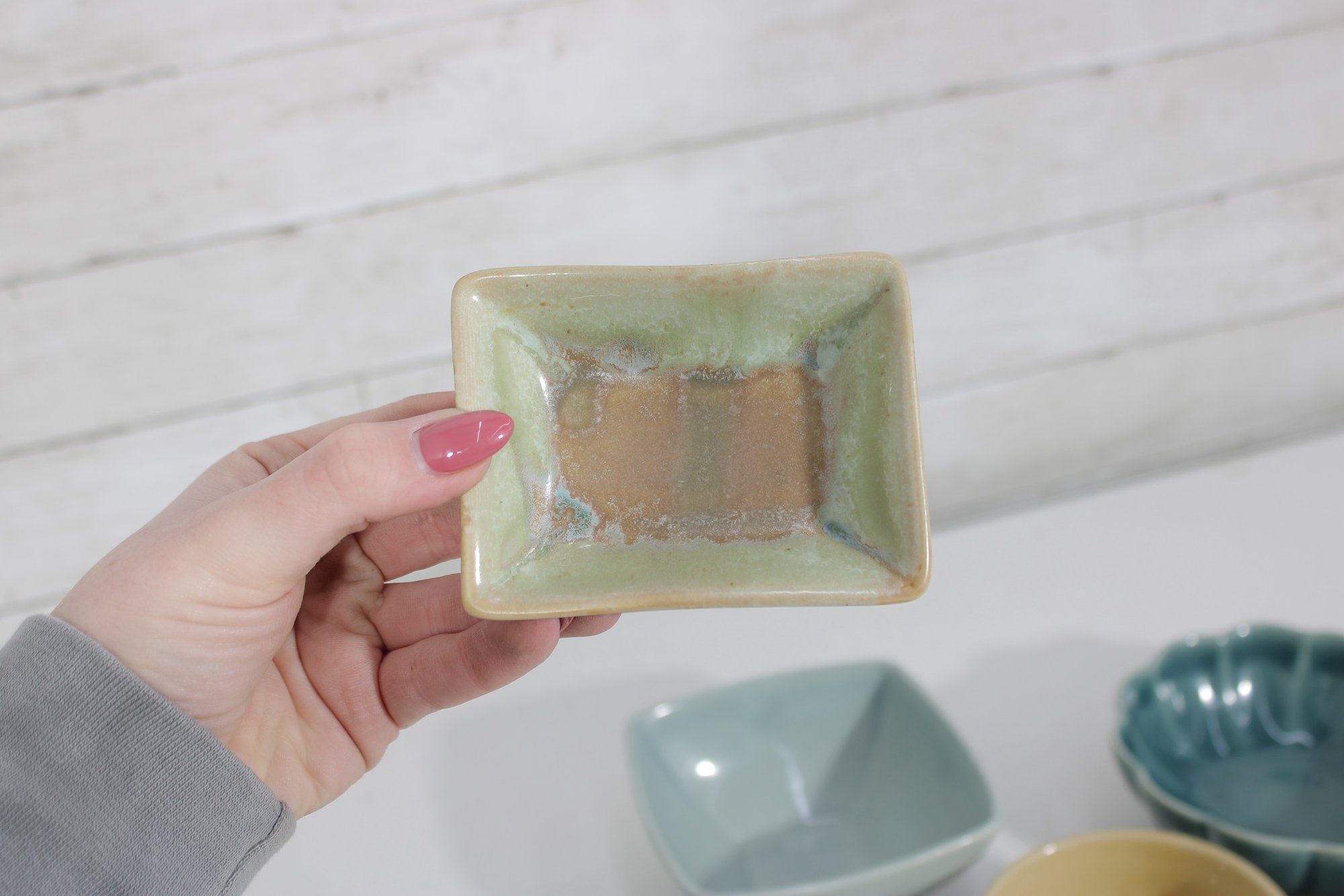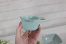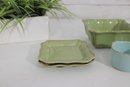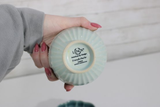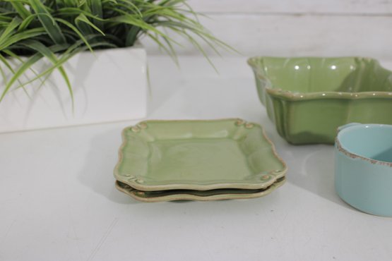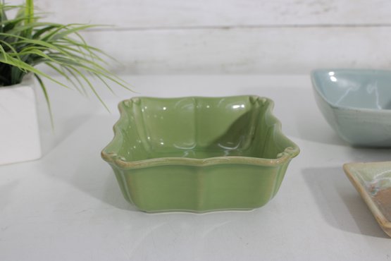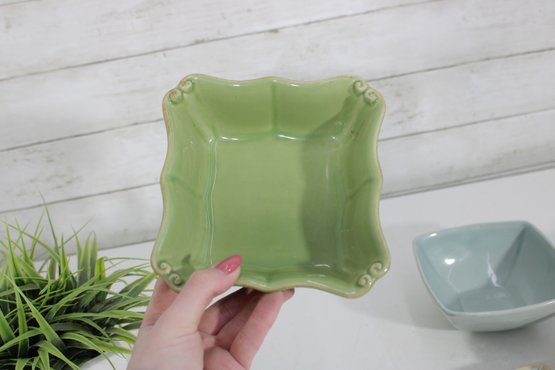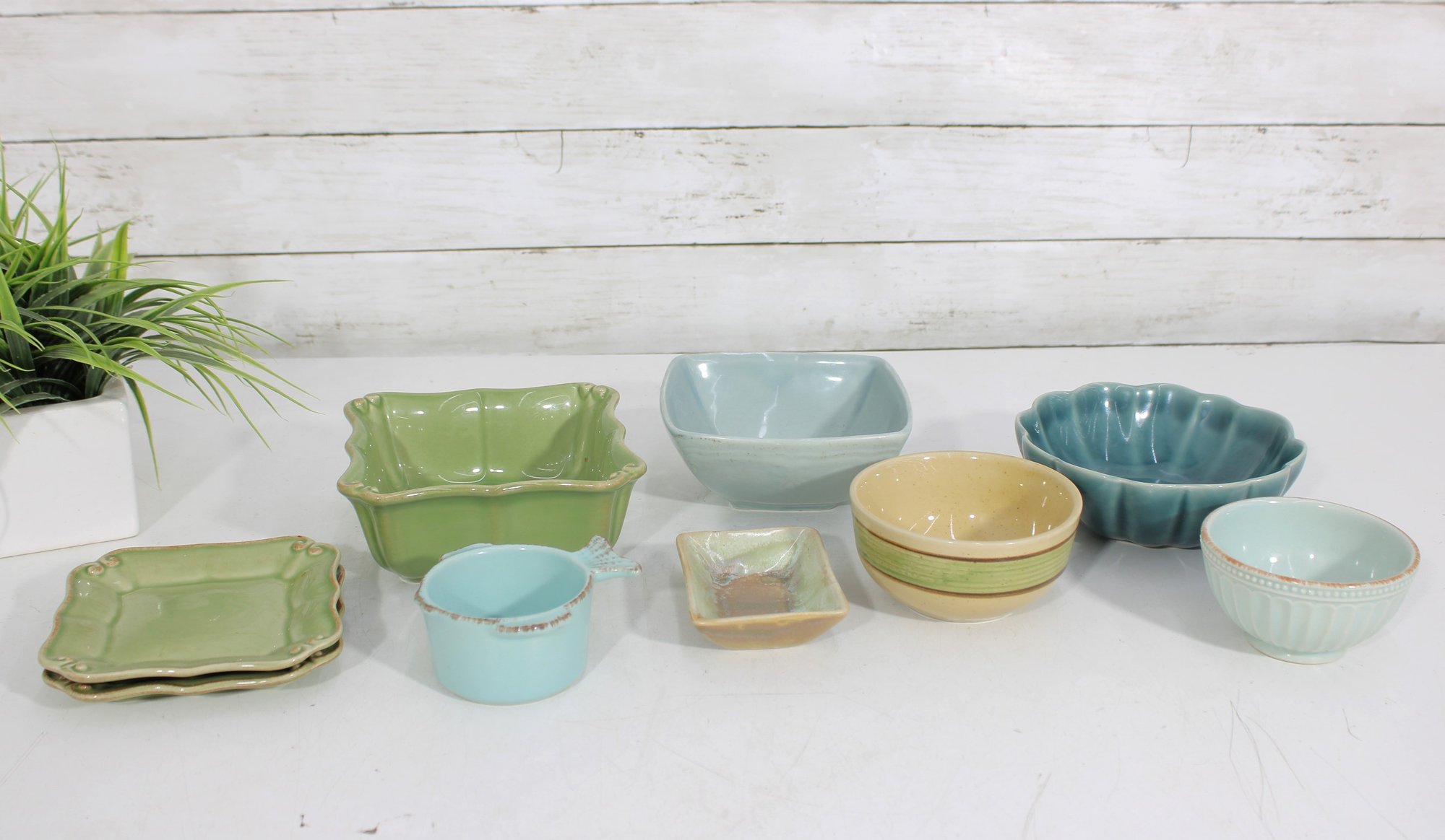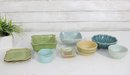 Attractive mixed lot of ceramic bowls and dishes in coordinating green, blue, and neutral tones. This collection features a variety of shapes and textures, perfect for serving, display, or adding a cohesive pop of color to your kitchen.