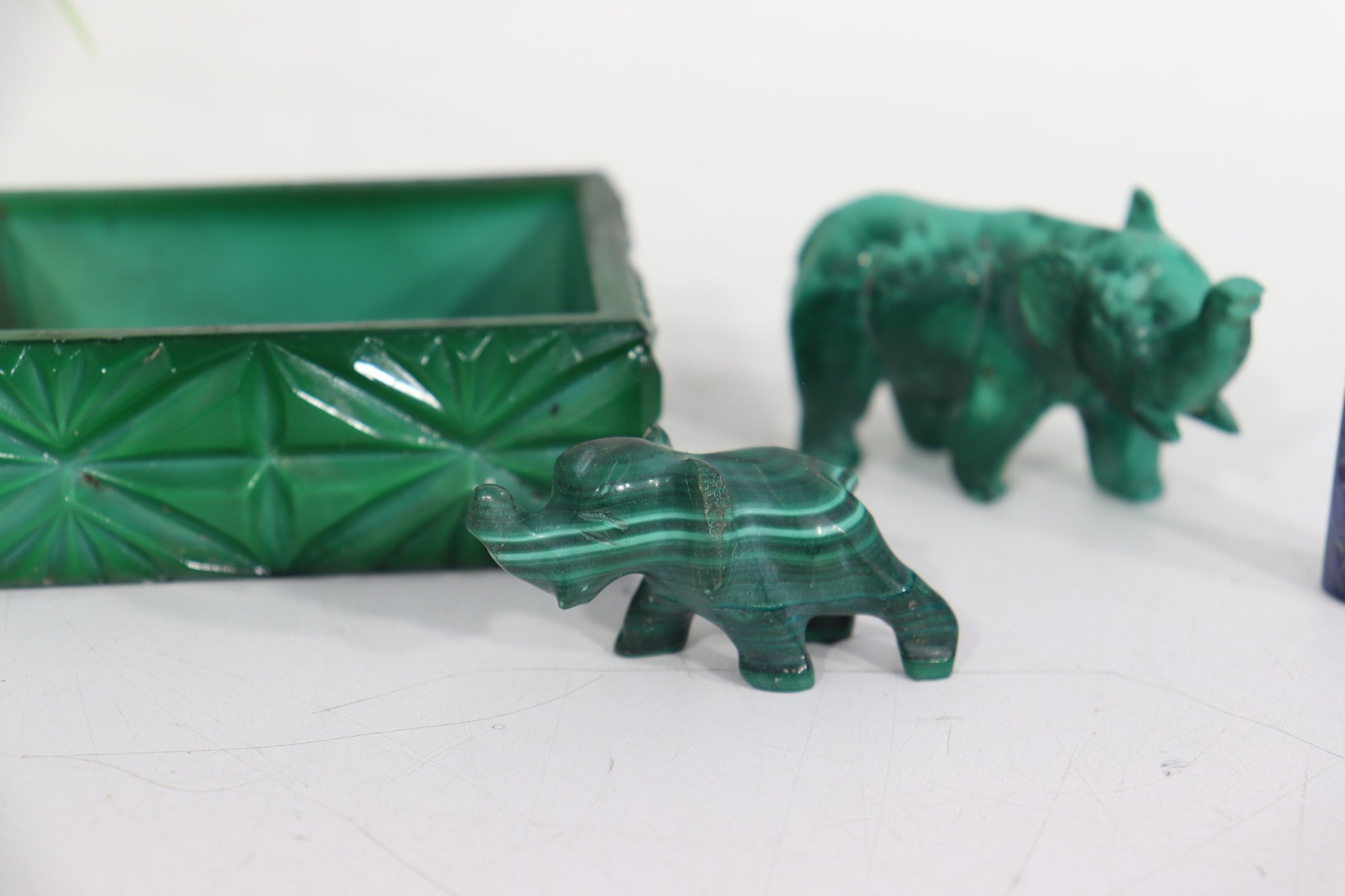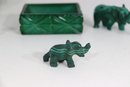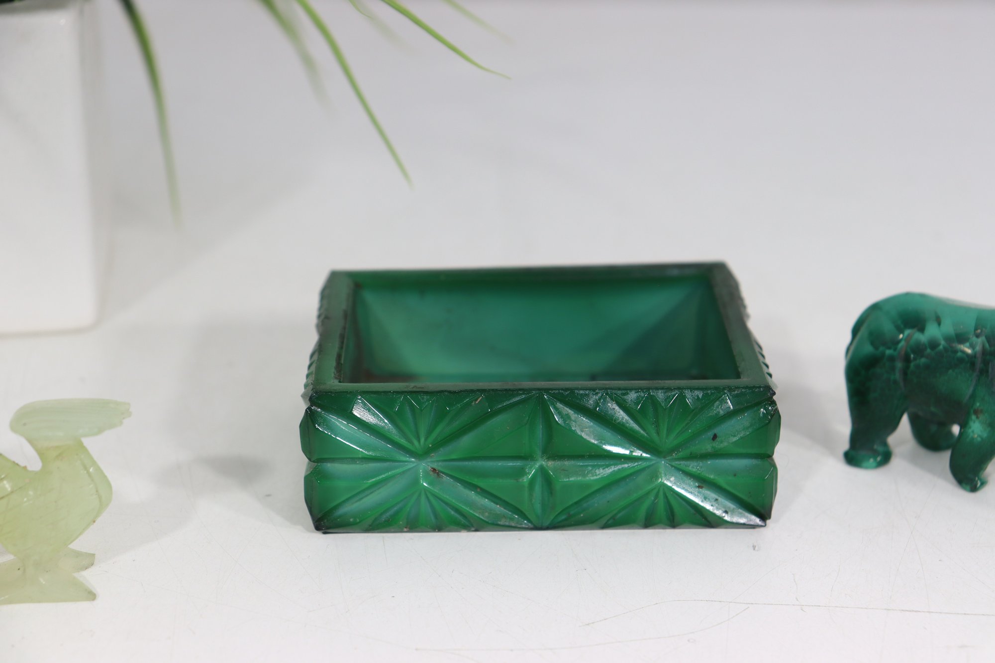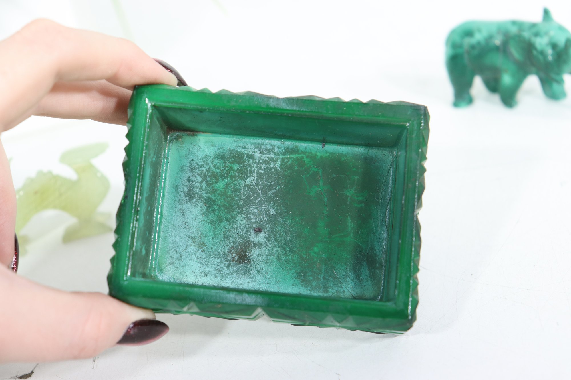 mixed lot of vintage carved stone decorative pieces, featuring a variety of small objects in green and blue tones. This lot includes animal figures, a carved rectangular box, and a small cylindrical piece, all displaying hand-carved details and natural stone variations.