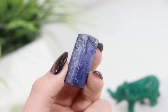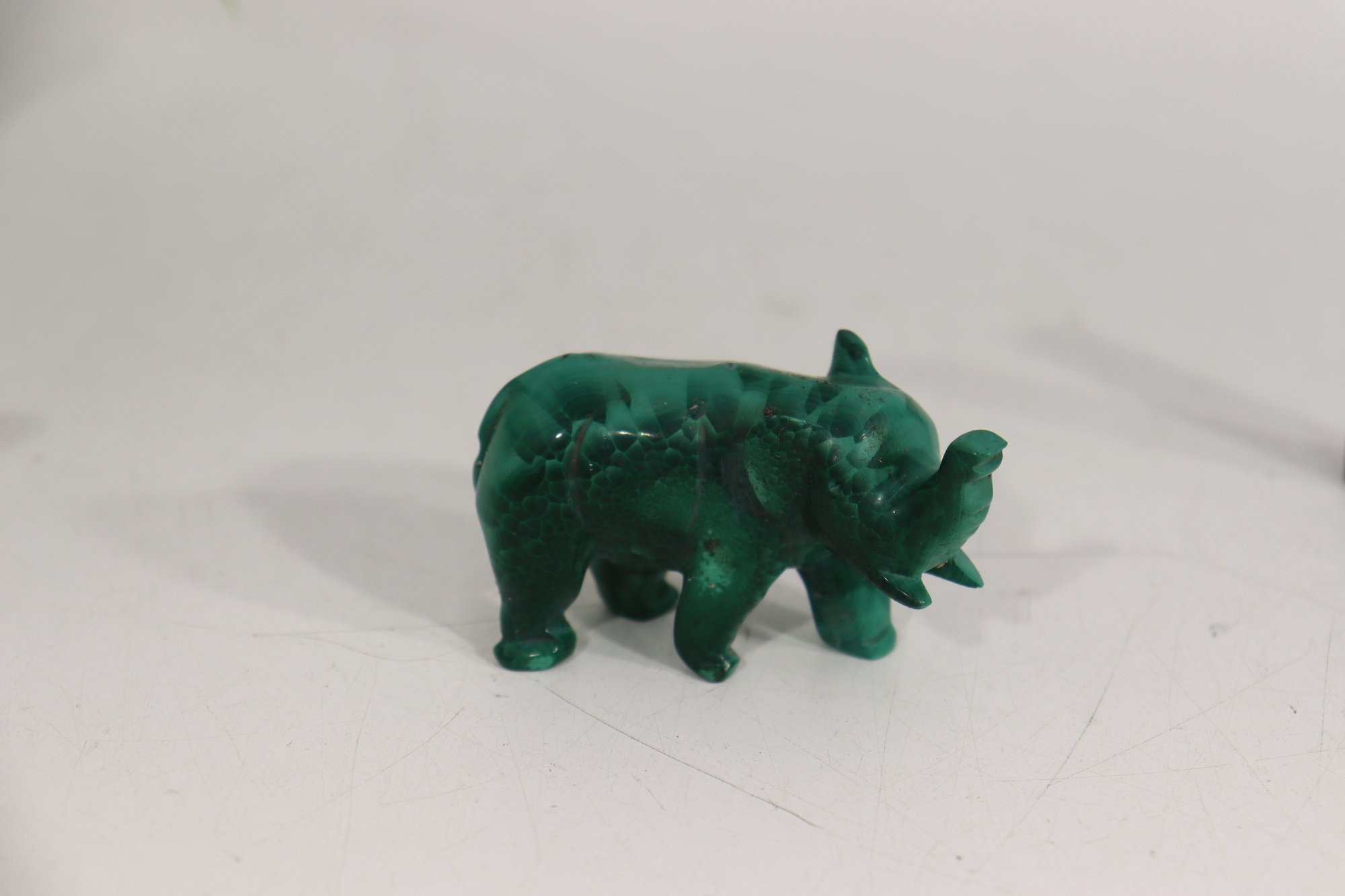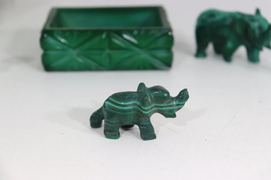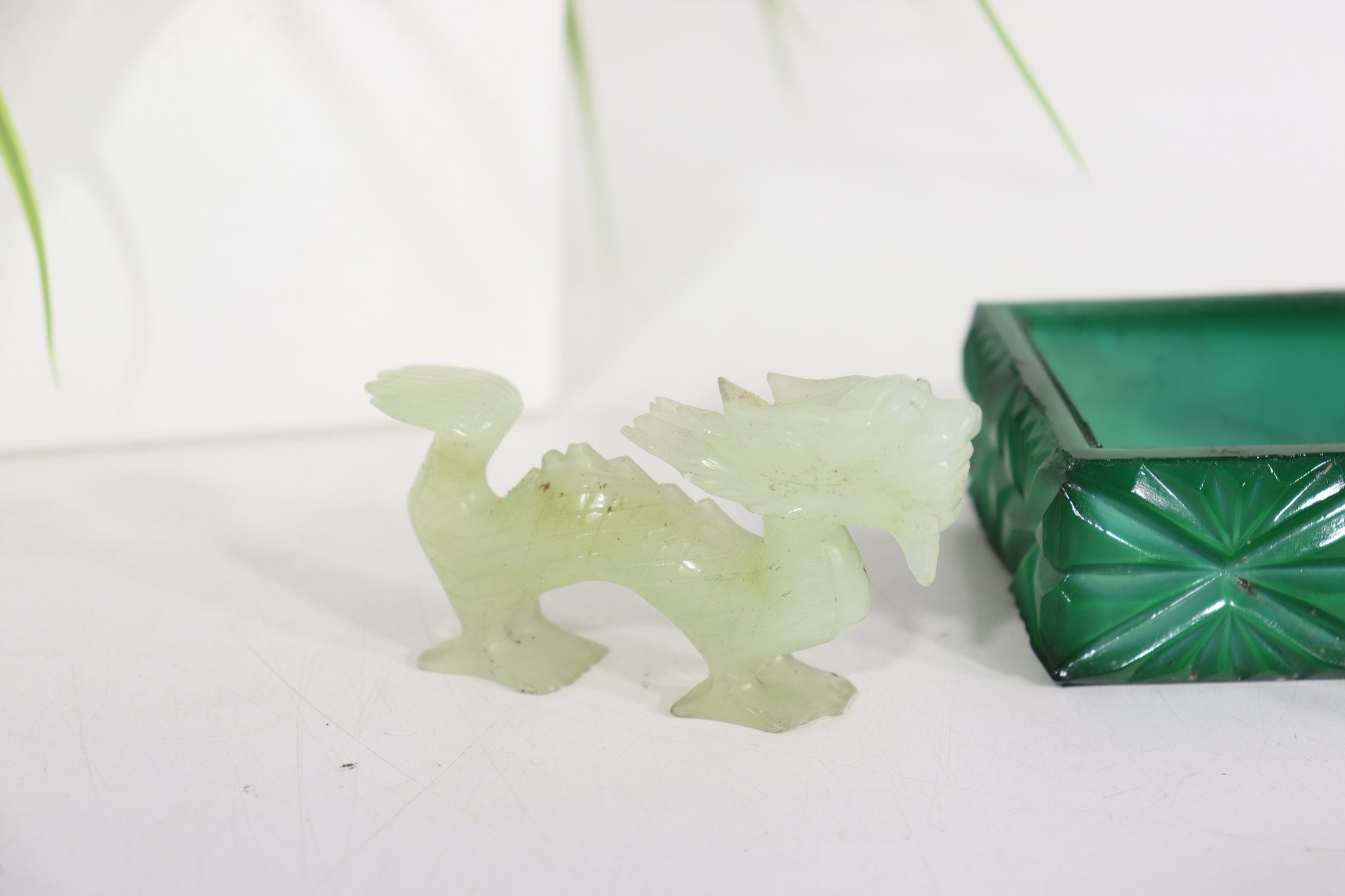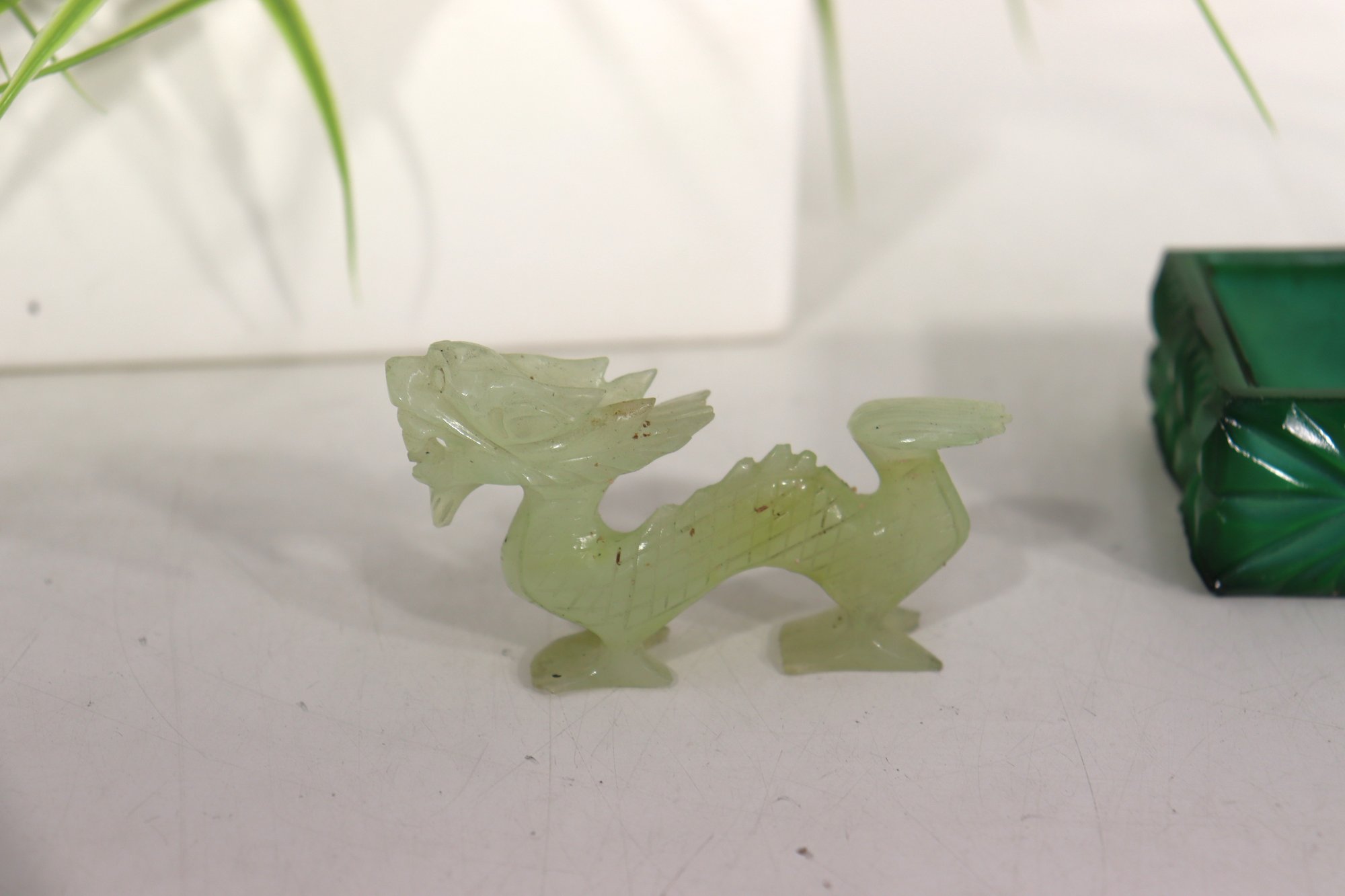 mixed lot of vintage carved stone decorative pieces, featuring a variety of small objects in green and blue tones. This lot includes animal figures, a carved rectangular box, and a small cylindrical piece, all displaying hand-carved details and natural stone variations.