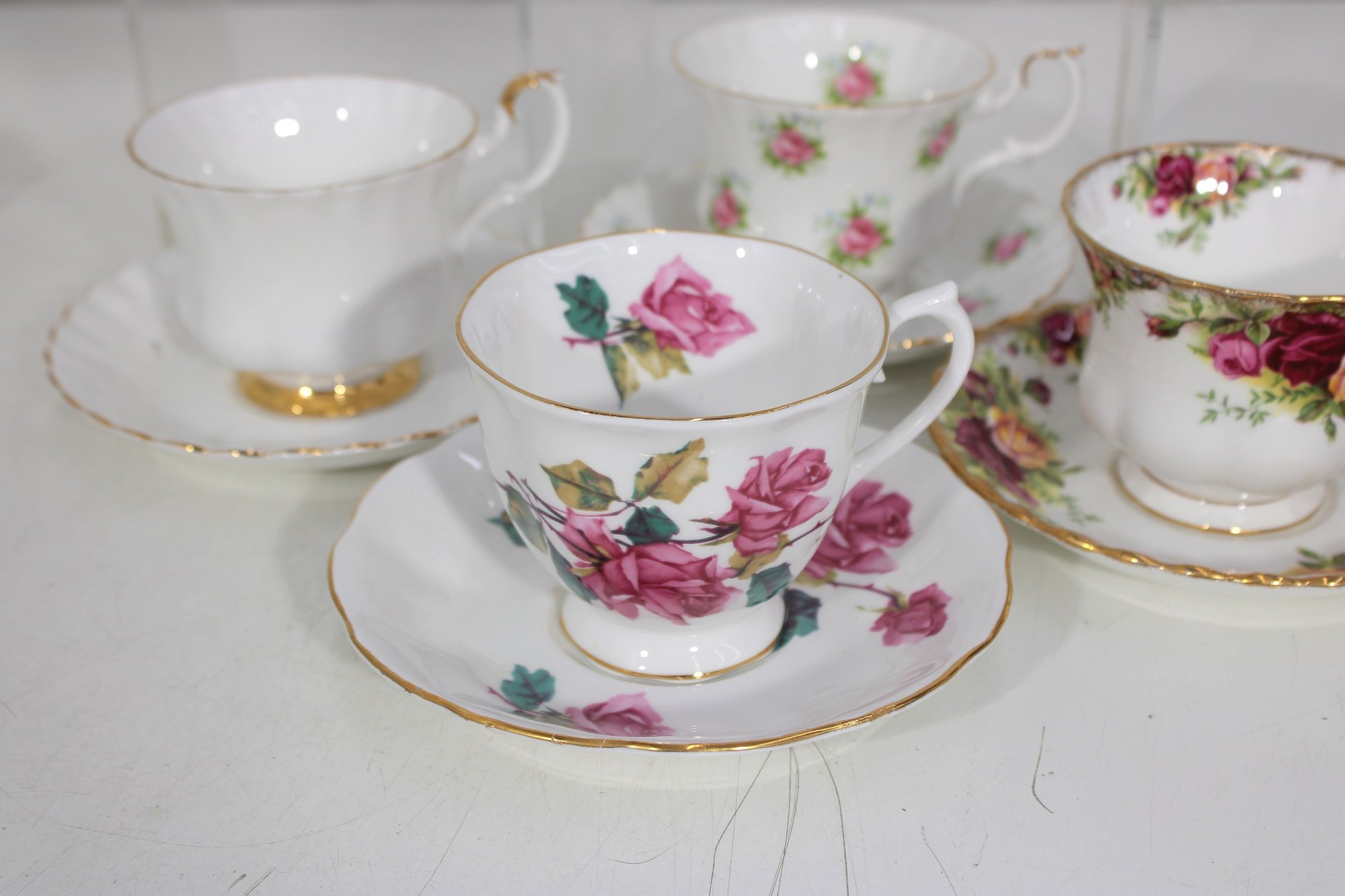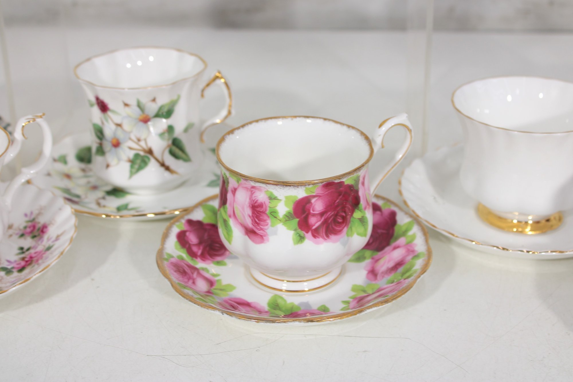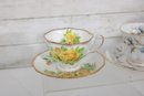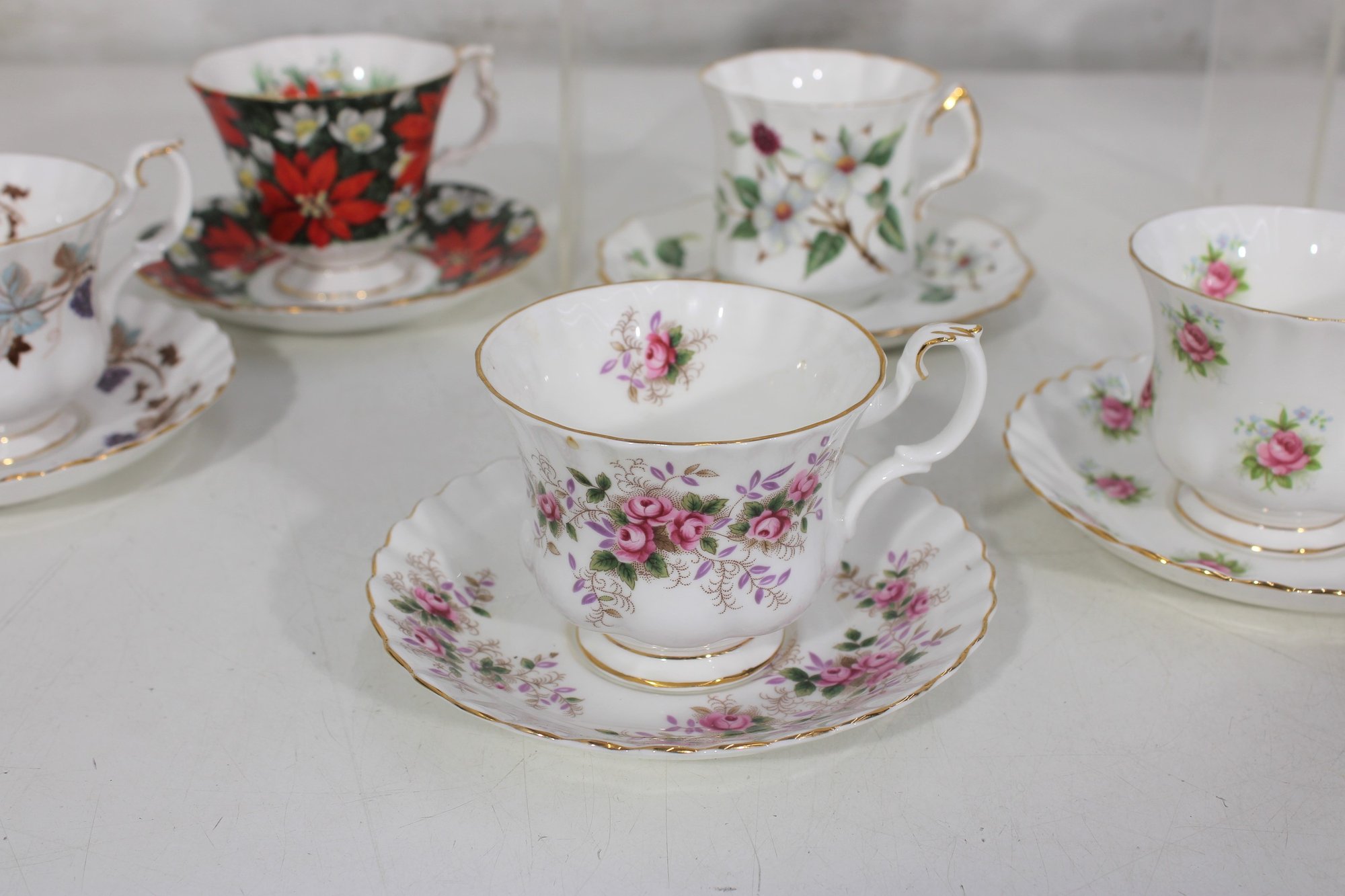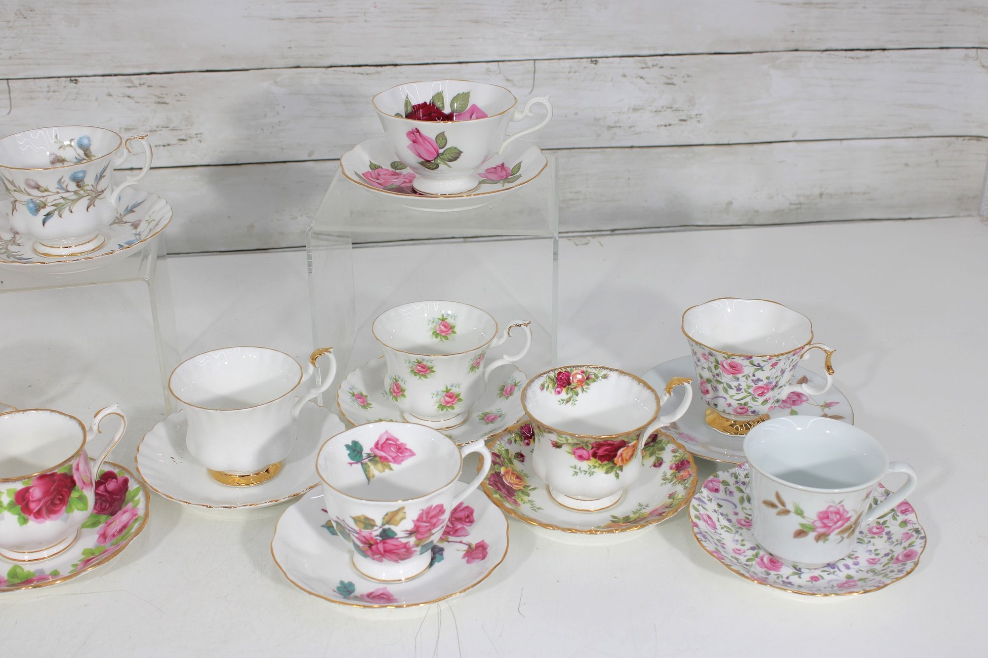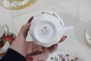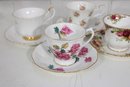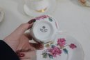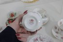 Each cup showcases delicate floral designs including roses, mixed bouquets, and gold trim accents. A lovely assortment of shapes and patterns—perfect for collectors, tea parties, display cabinets, weddings, or resale.