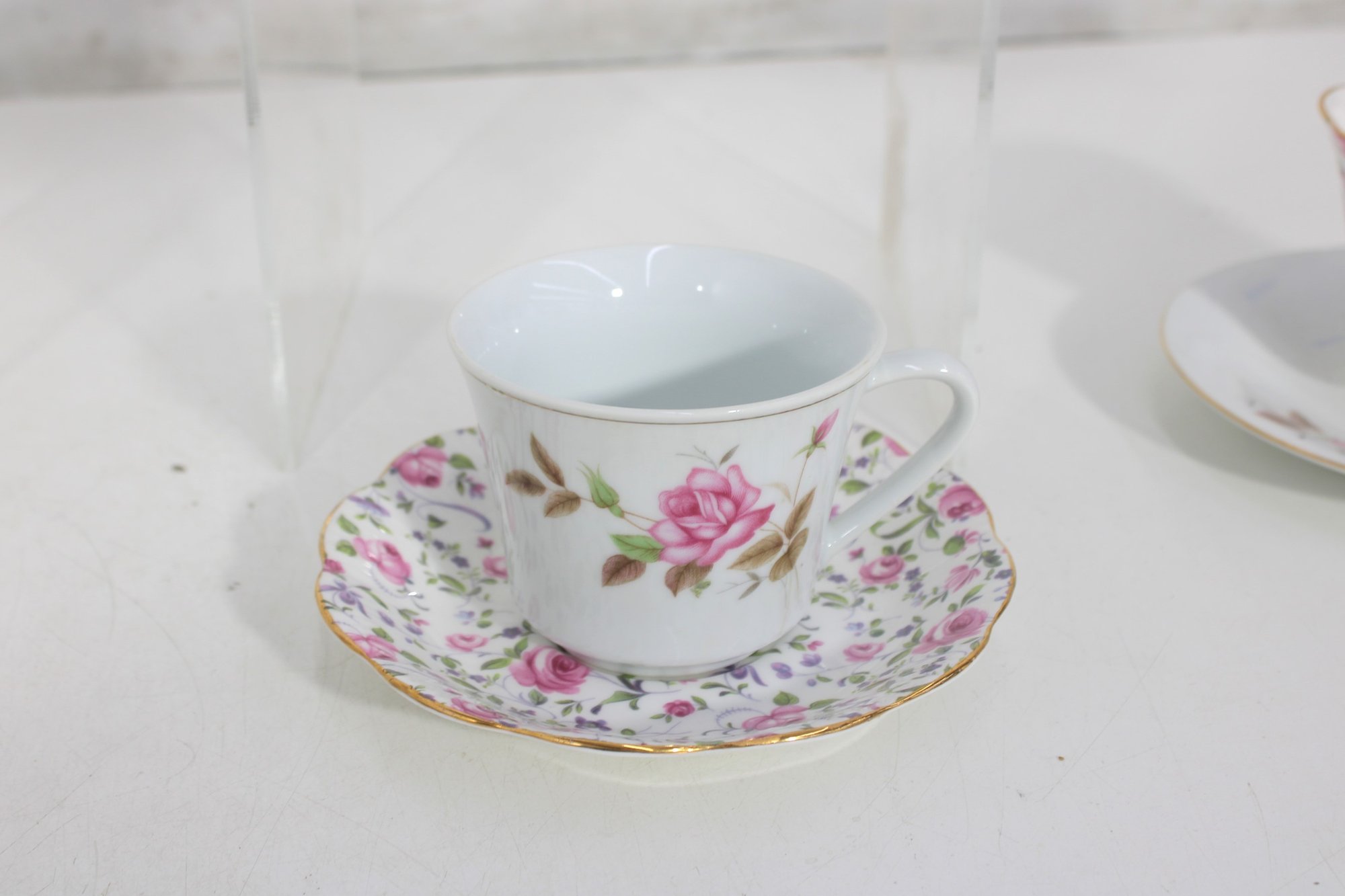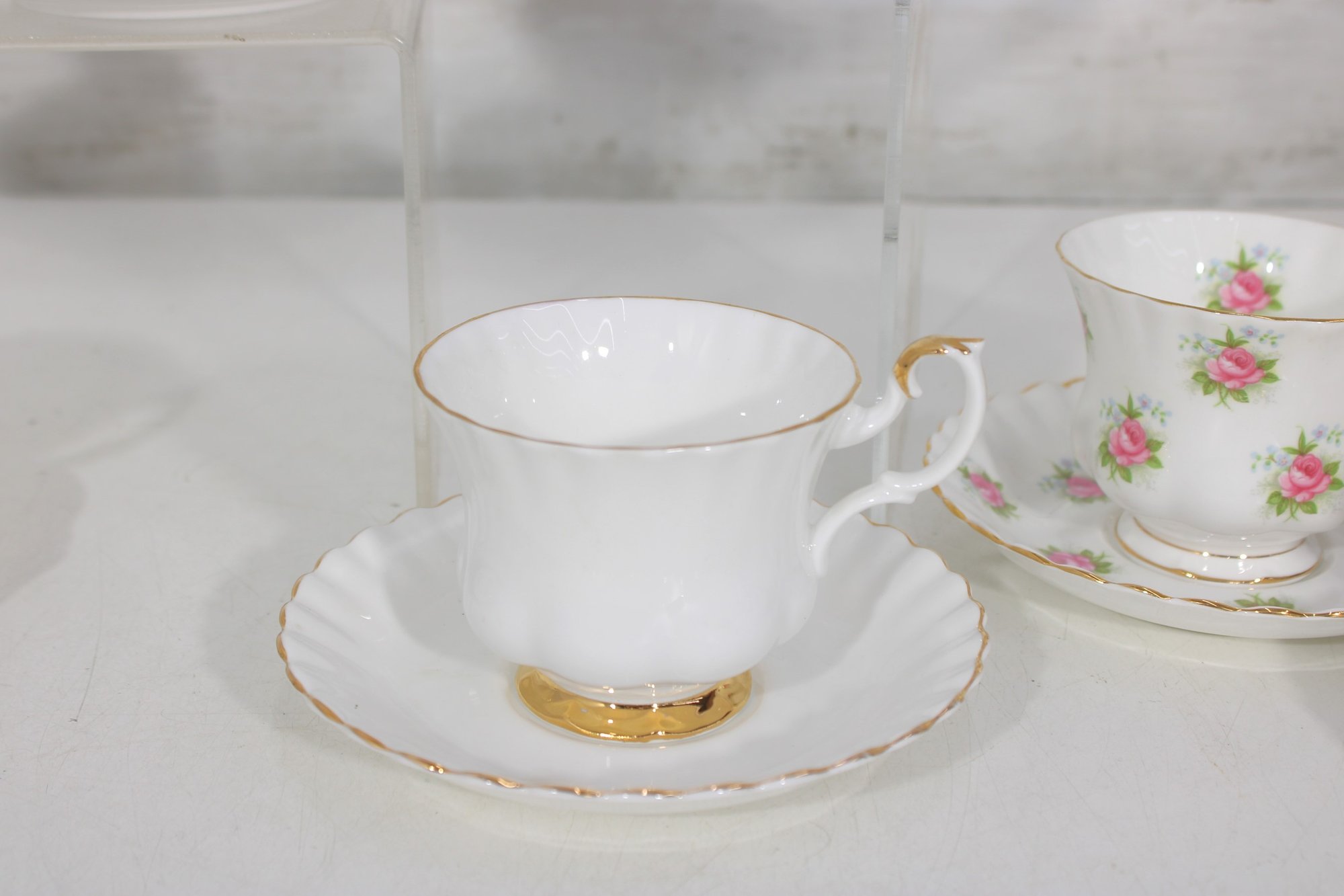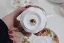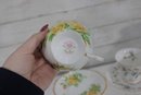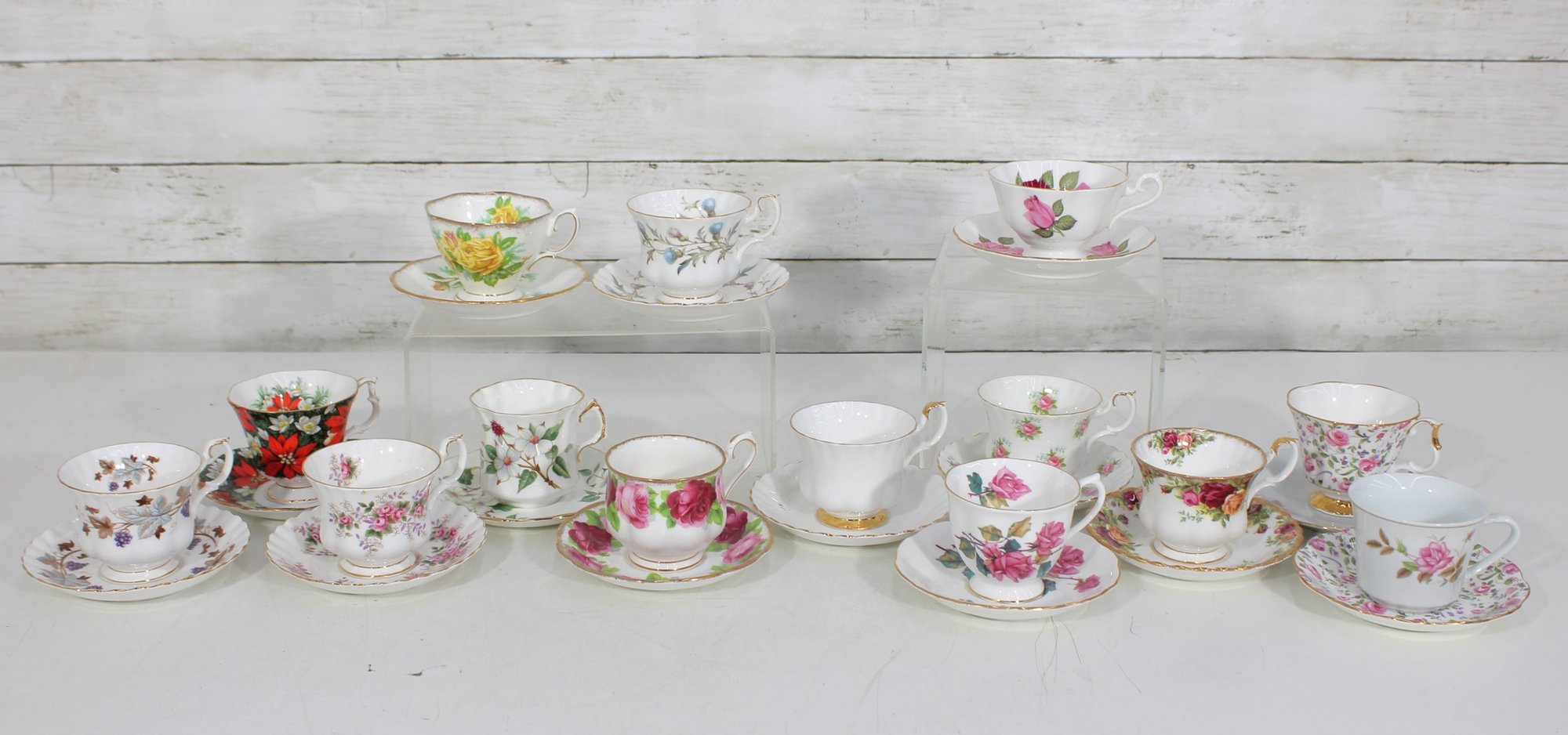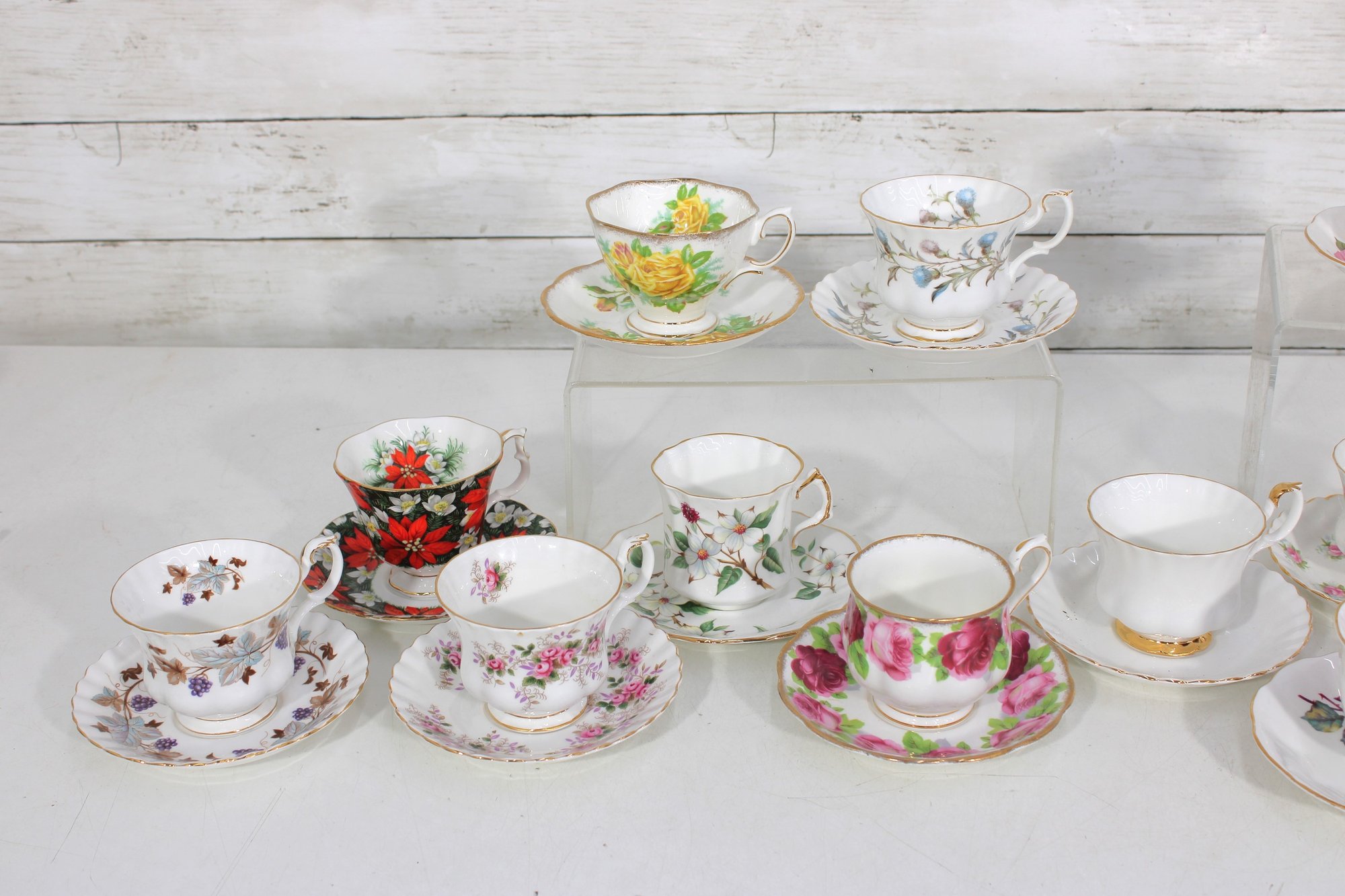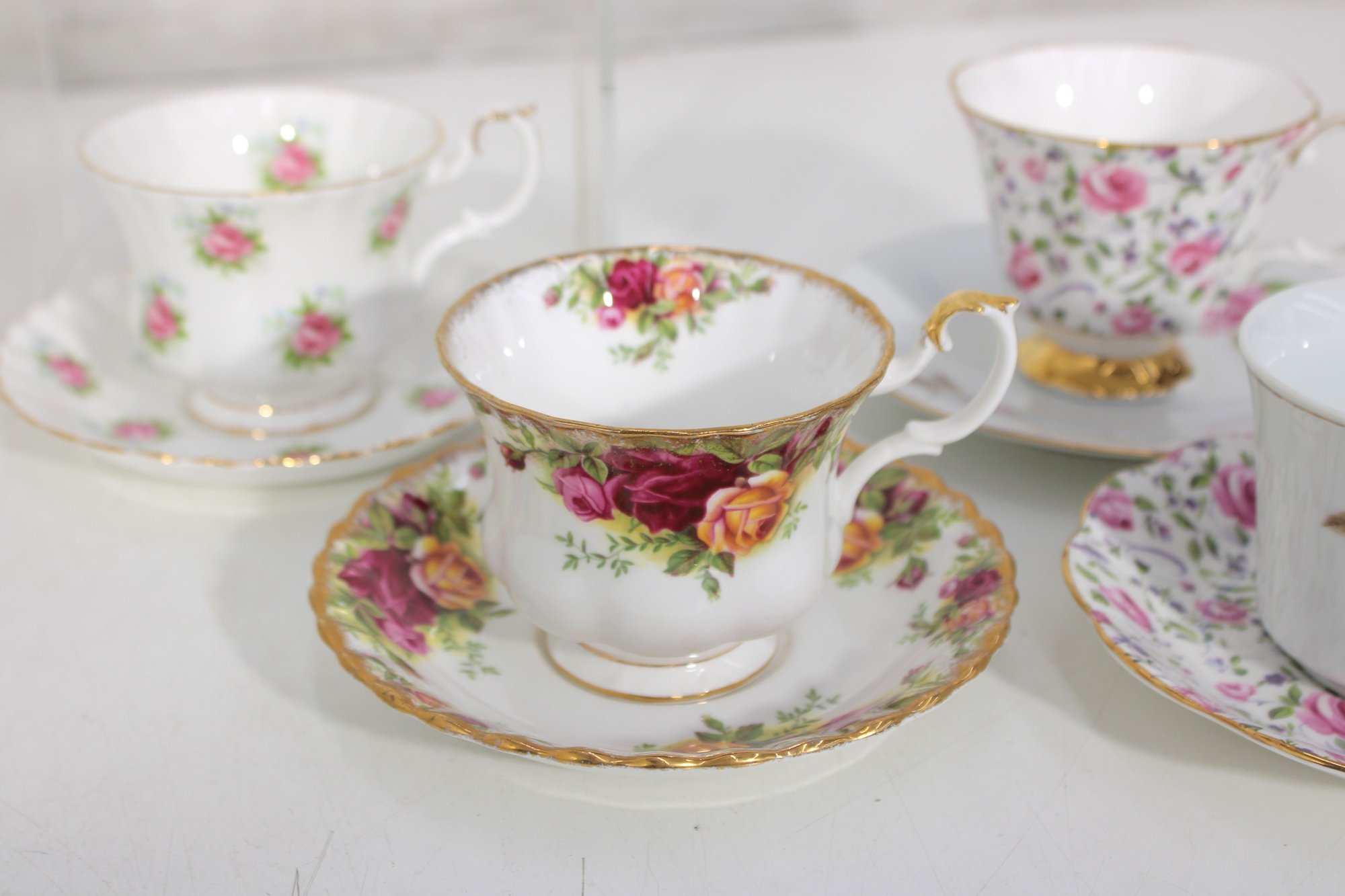 Each cup showcases delicate floral designs including roses, mixed bouquets, and gold trim accents. A lovely assortment of shapes and patterns—perfect for collectors, tea parties, display cabinets, weddings, or resale.