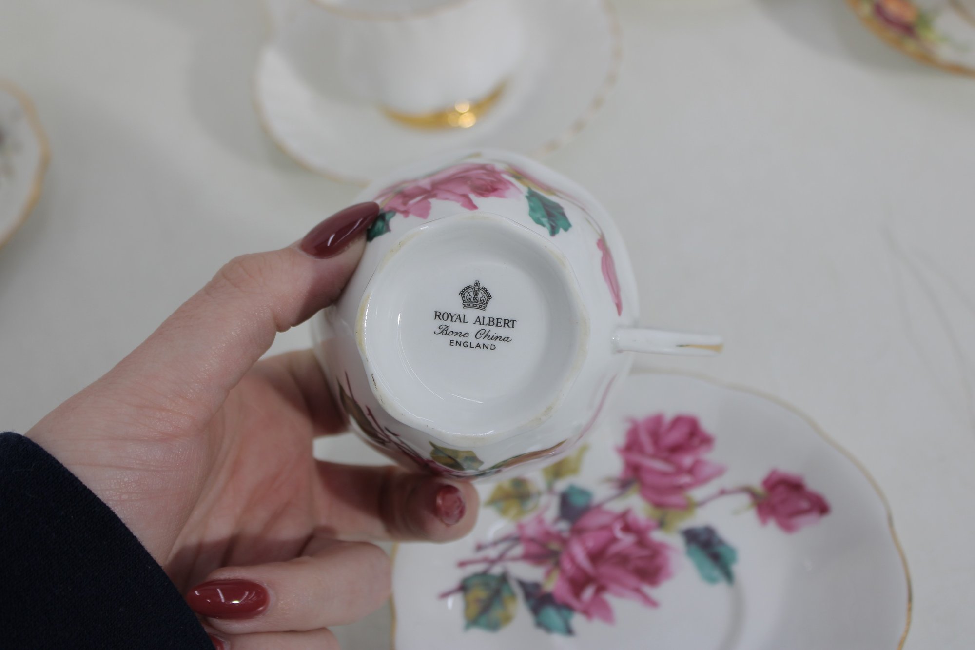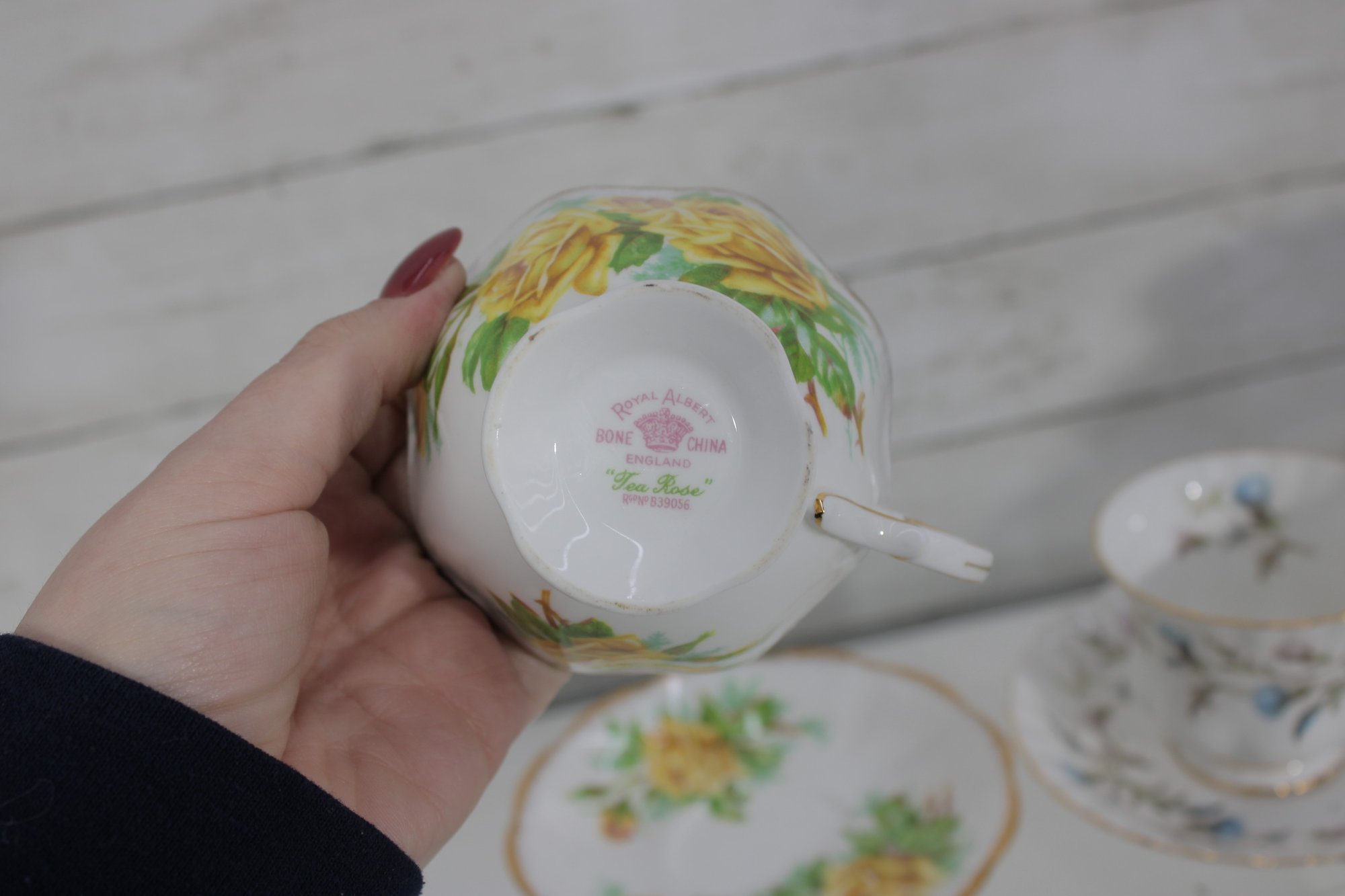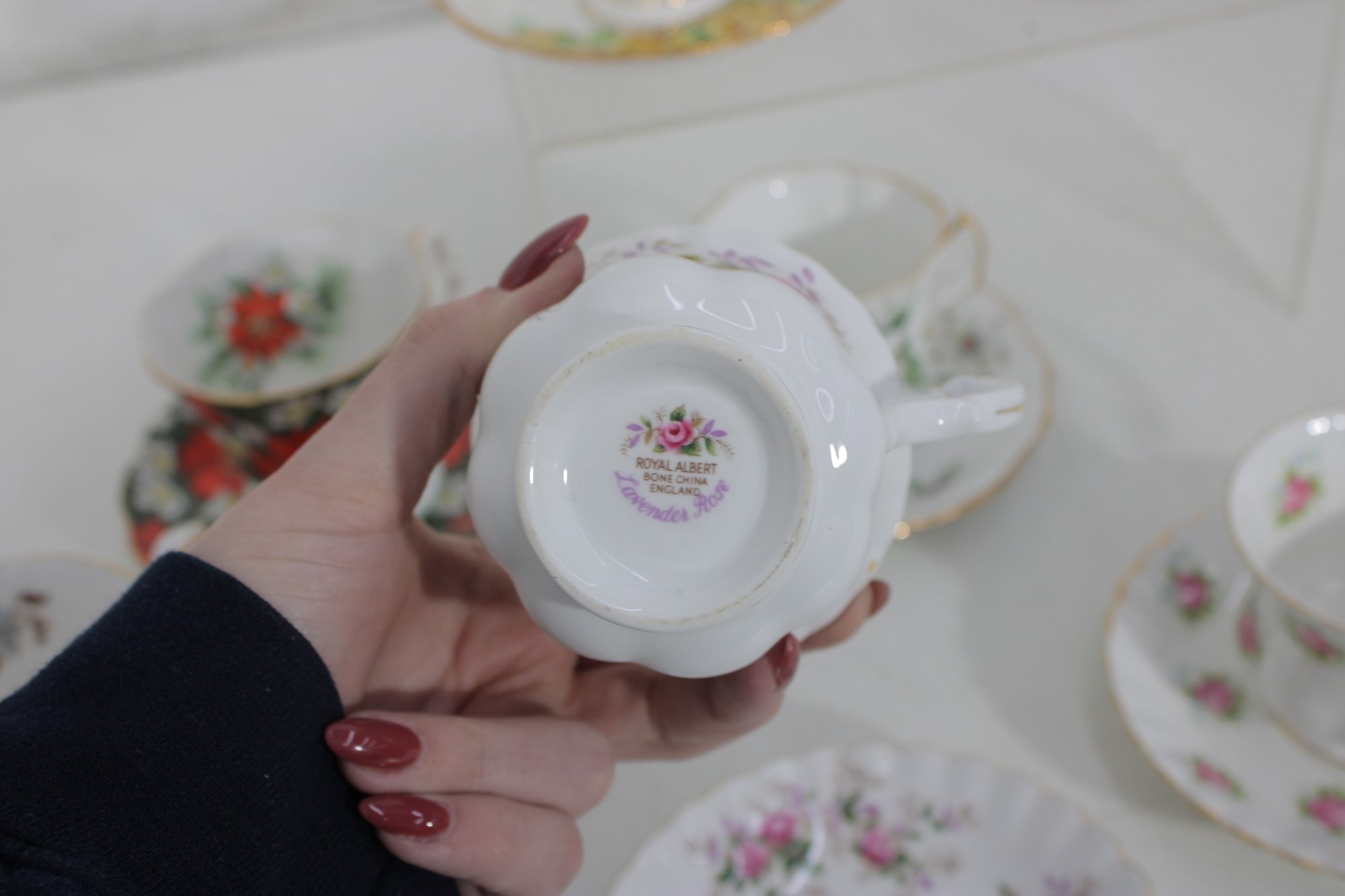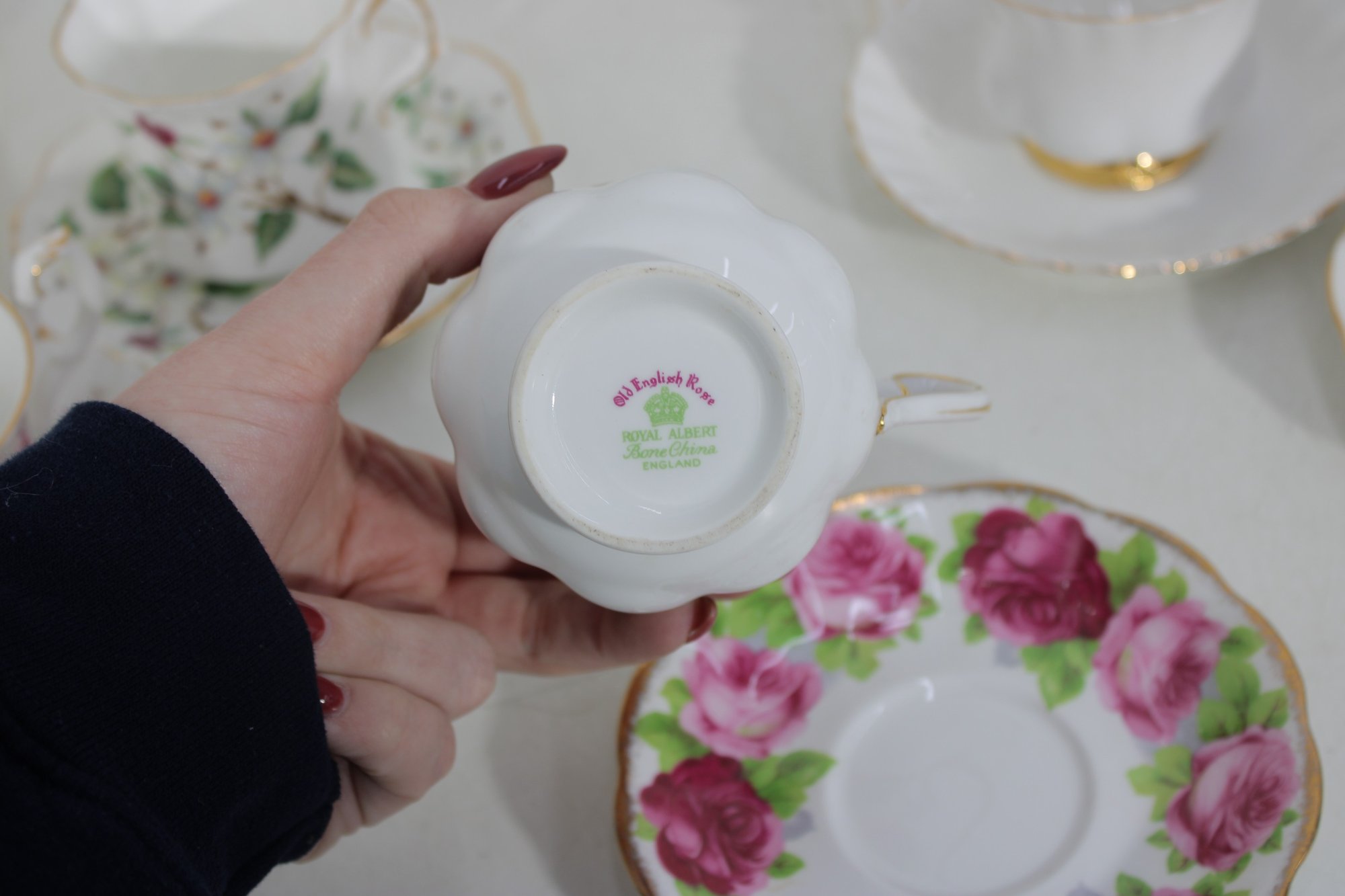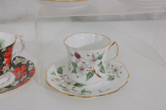 Charming mixed lot of vintage bone china teacups and saucers featuring beautiful floral patterns and classic English styling. This collection includes multiple makers such as Royal Albert, Paragon, Royal Vale, and other fine bone china brands (see underside marks shown in photos).
