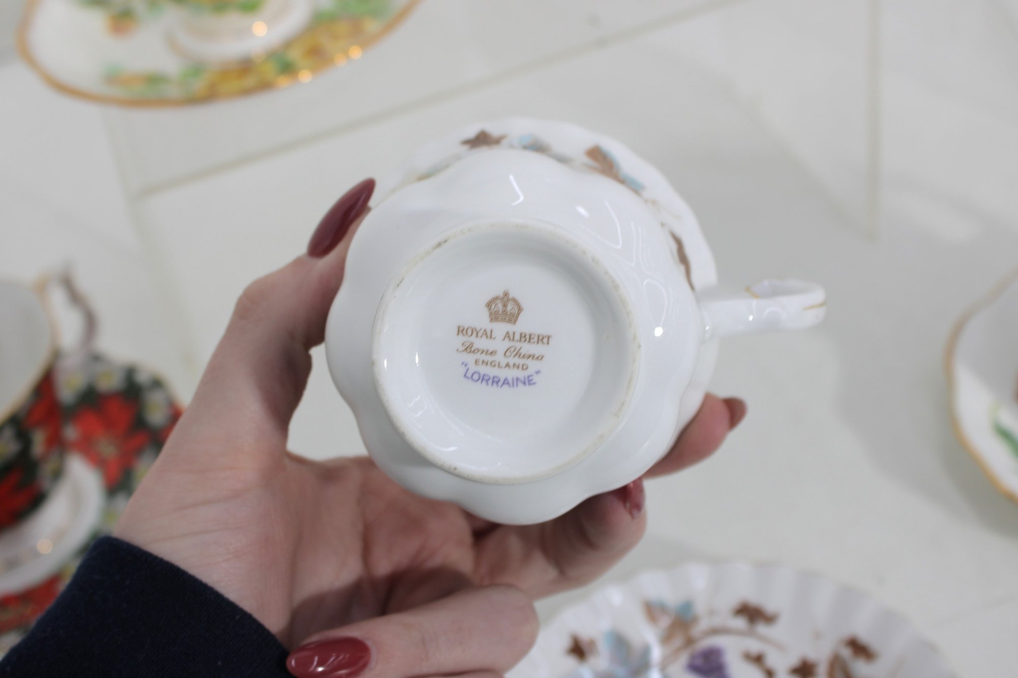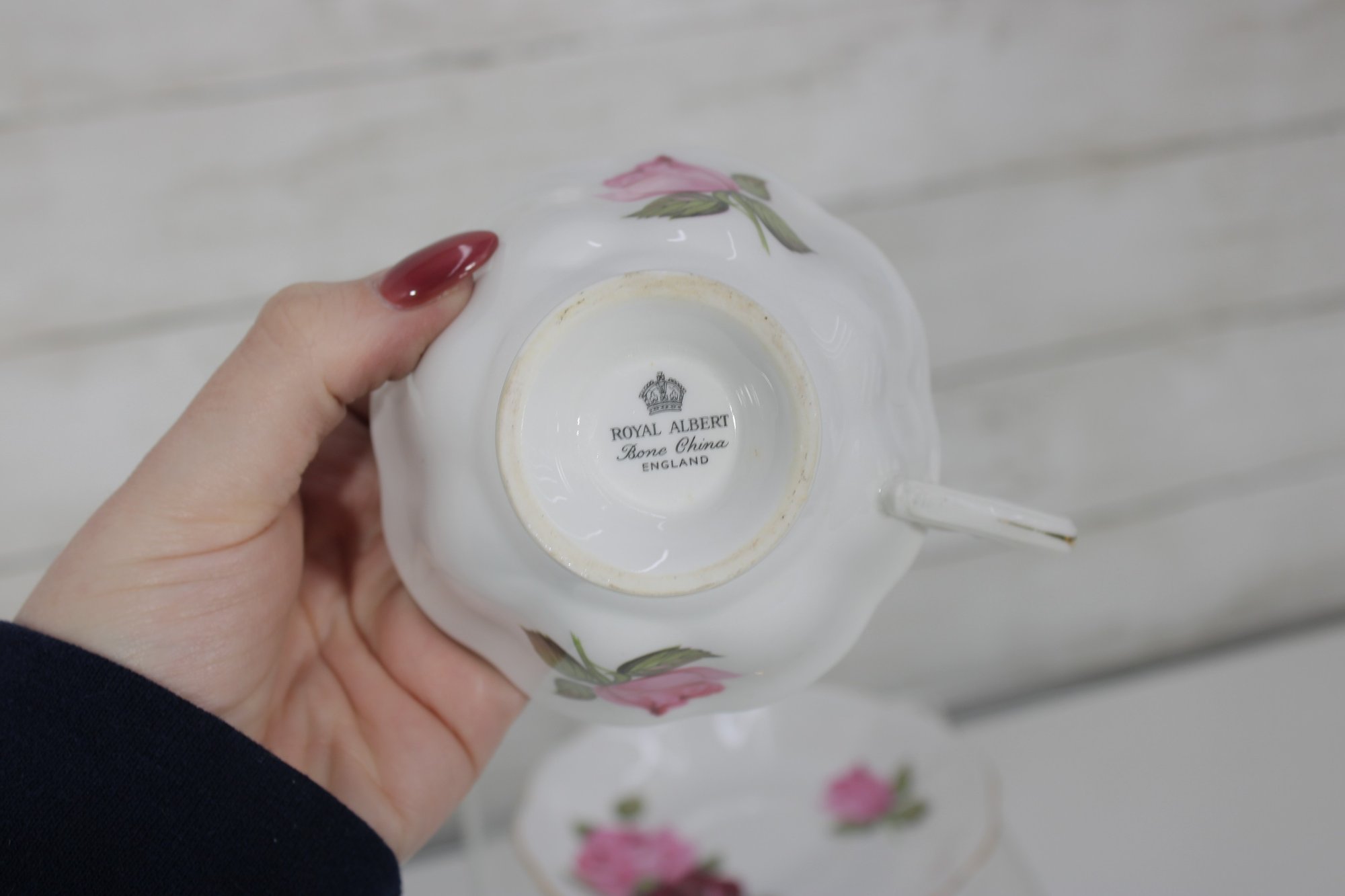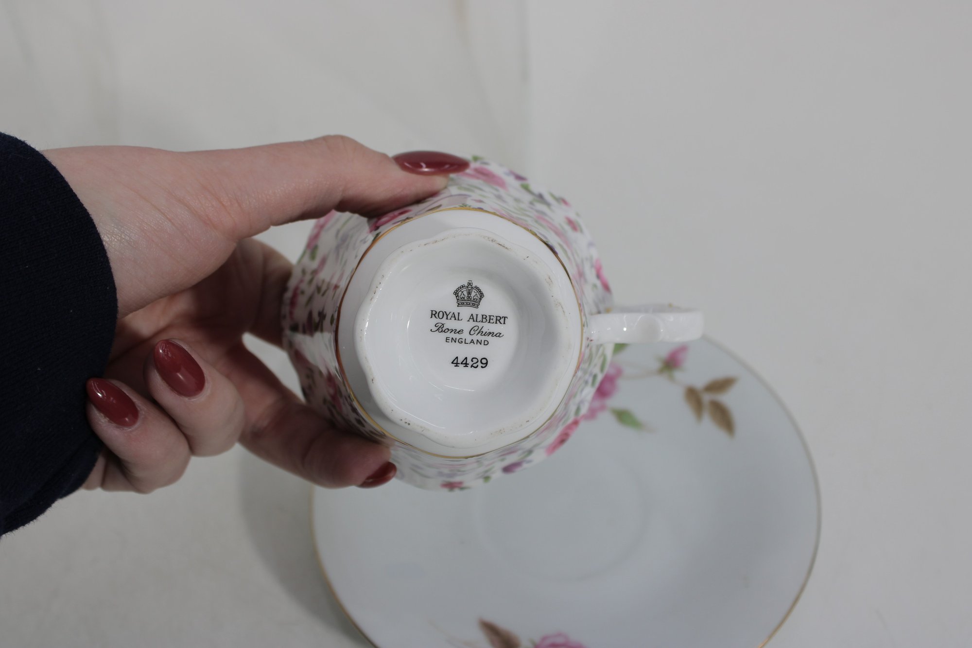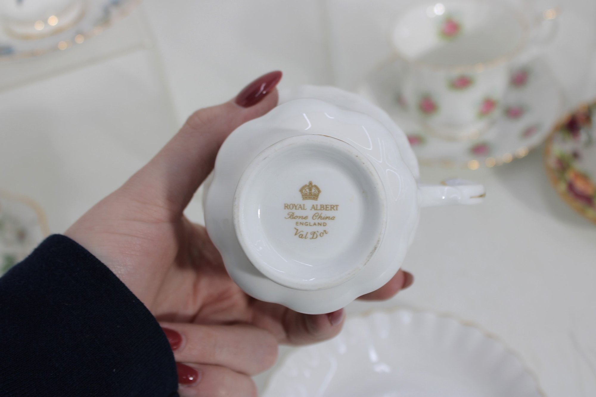 Charming mixed lot of vintage bone china teacups and saucers featuring beautiful floral patterns and classic English styling. This collection includes multiple makers such as Royal Albert, Paragon, Royal Vale, and other fine bone china brands (see underside marks shown in photos).