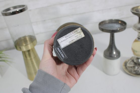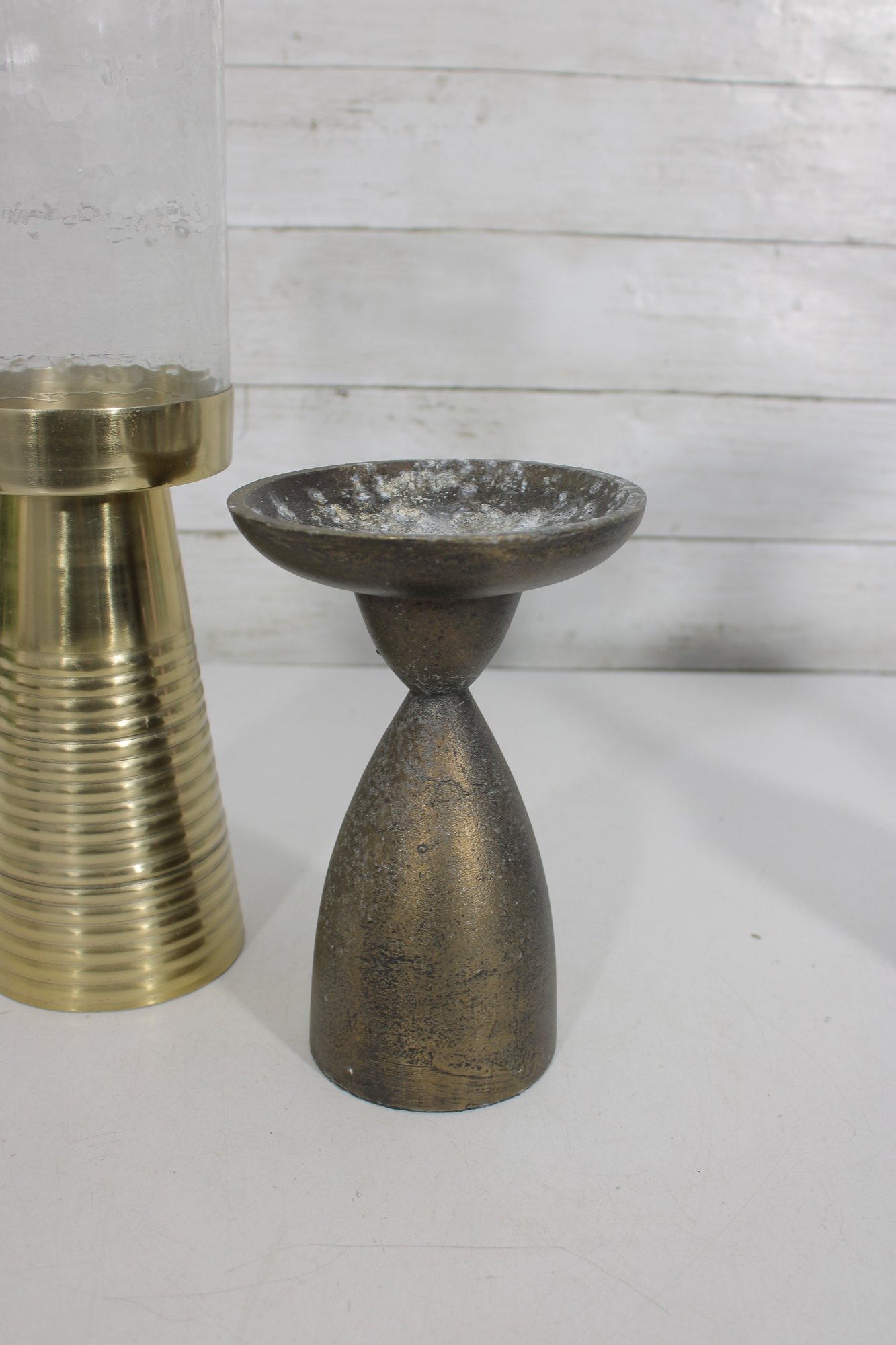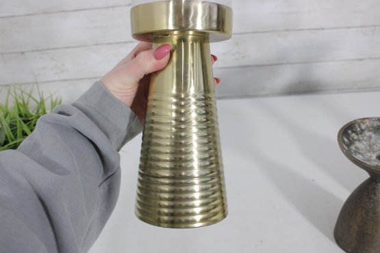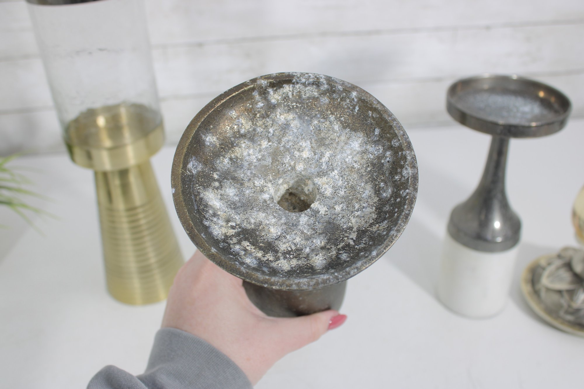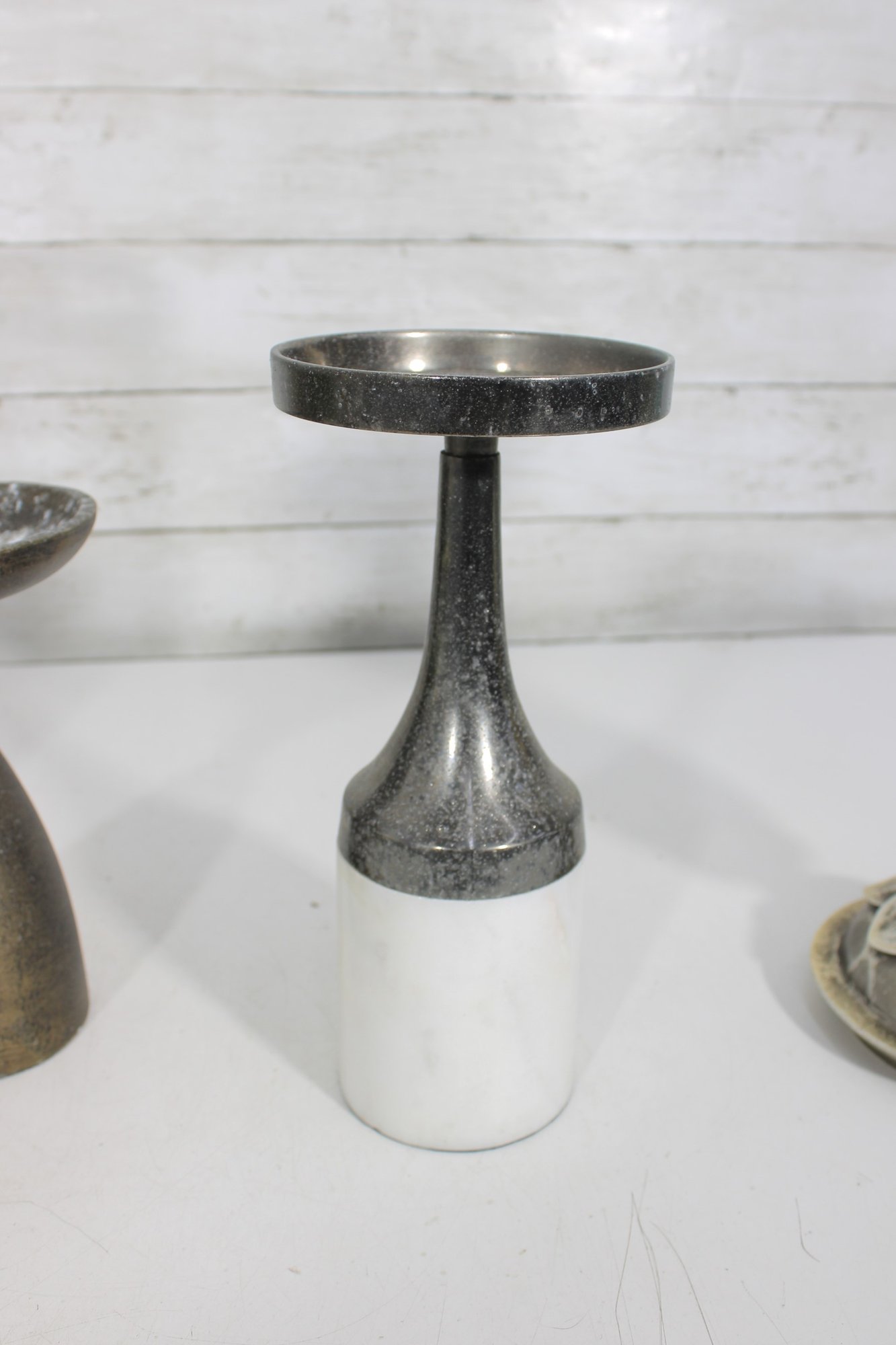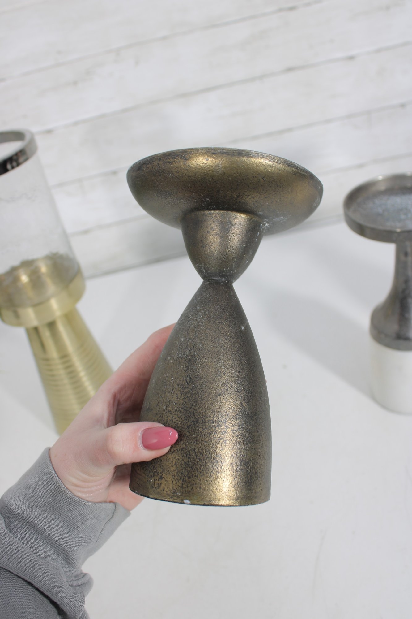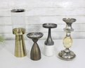 Stylish assortment of four candle holders featuring a mix of modern and vintage-inspired designs in metal and glass. This unique group offers a variety of shapes, finishes, and textures—perfect for creating an eye-catching display.