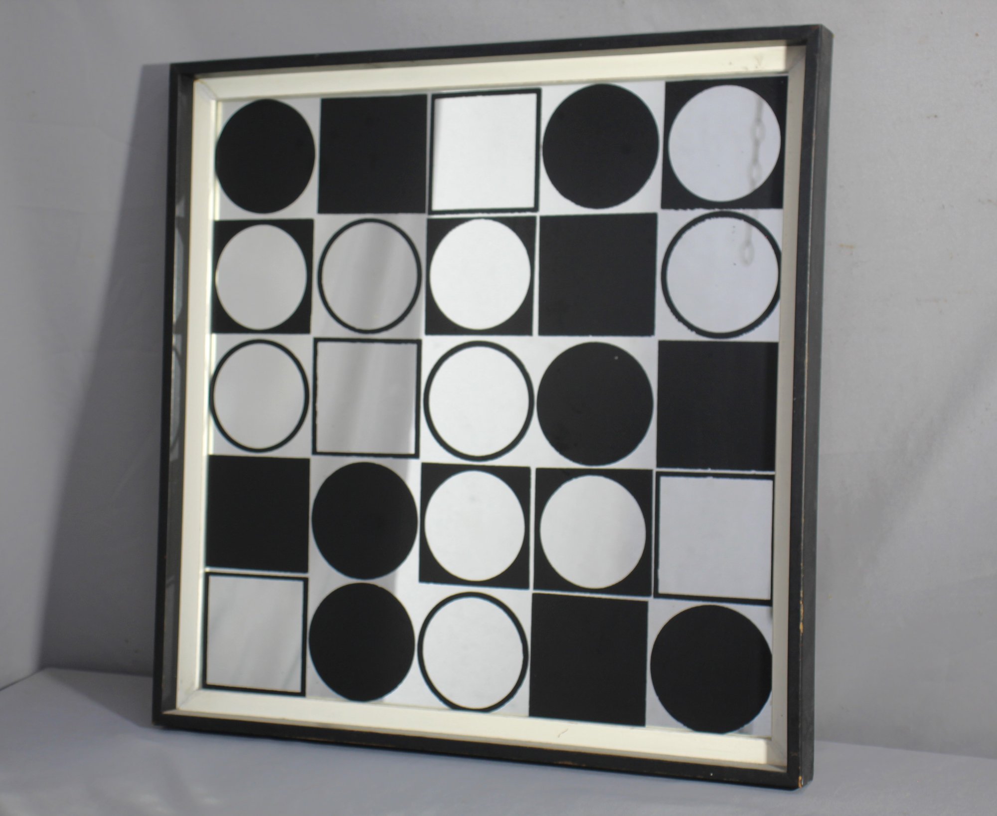 This stylish and modern "Mod Graphic Wall Mirror" designed by Tom Tru features a striking black and white geometric pattern. The piece cleverly combines artistic design with functionality, incorporating various shapes such as circles and squares that create a dynamic and visually interesting composition. This mirror not only serves its practical purpose but also acts as a bold statement piece in any room.
