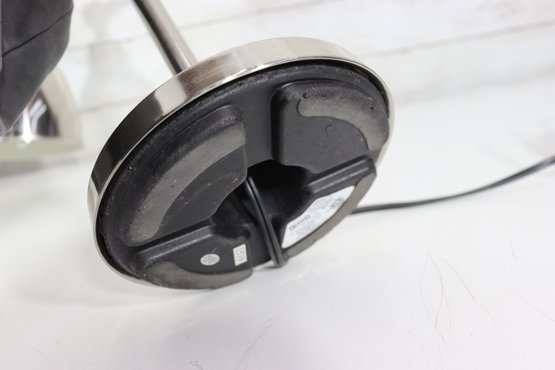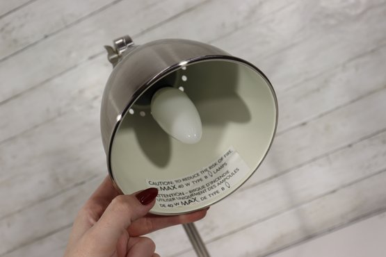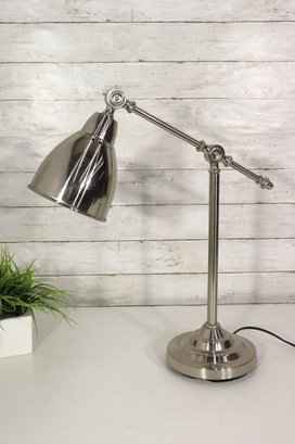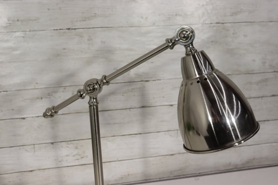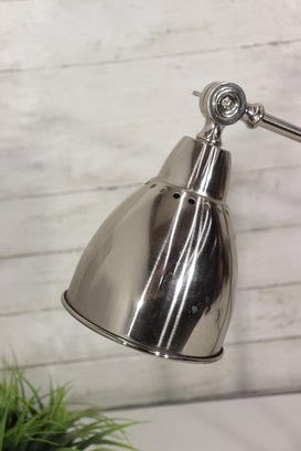 Sleek and functional modern adjustable desk lamp featuring a polished nickel finish and classic industrial swing-arm design. This stylish lamp combines form and function, making it perfect for a home office, study area, or bedside table.