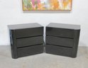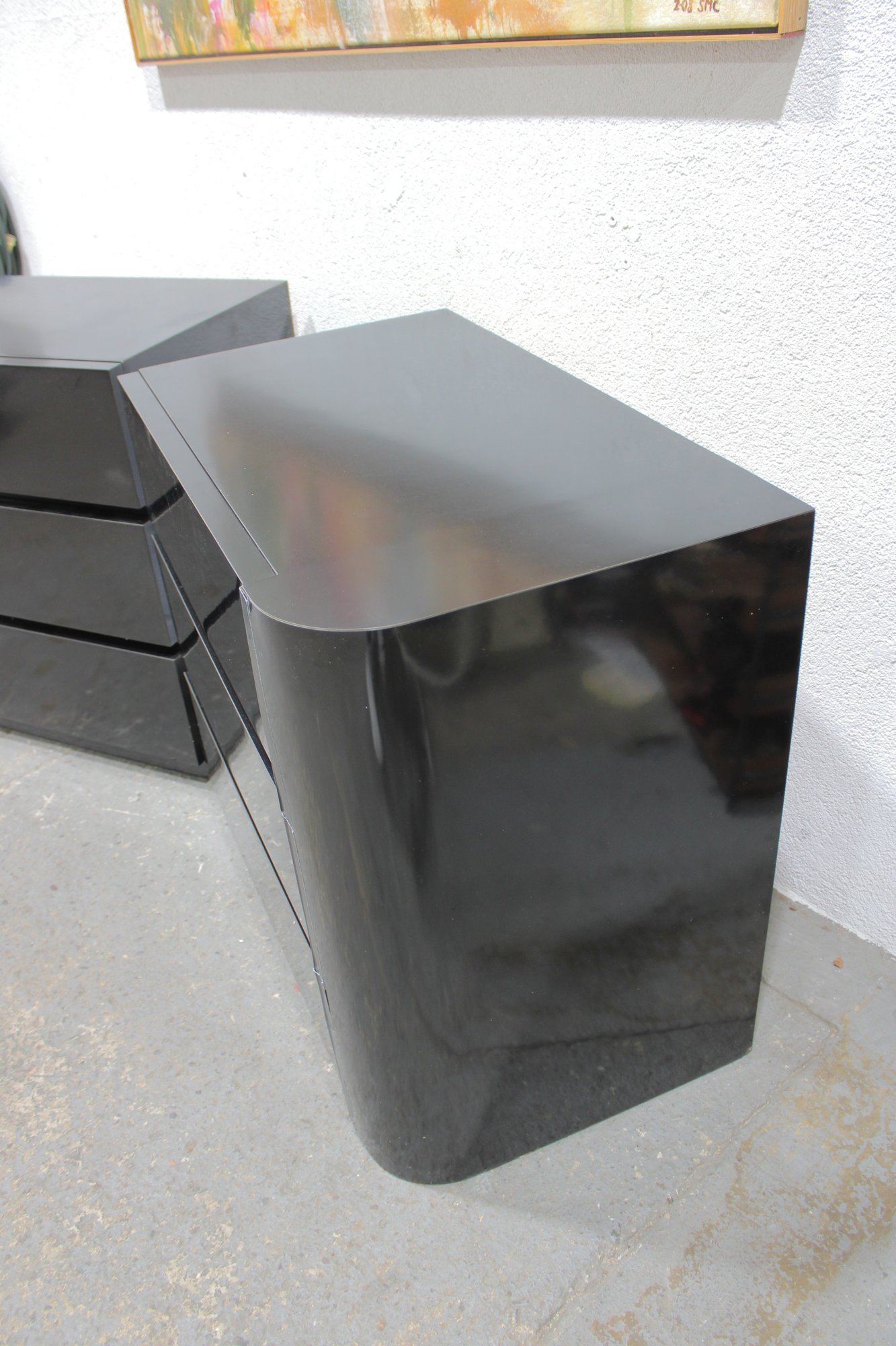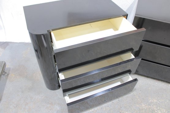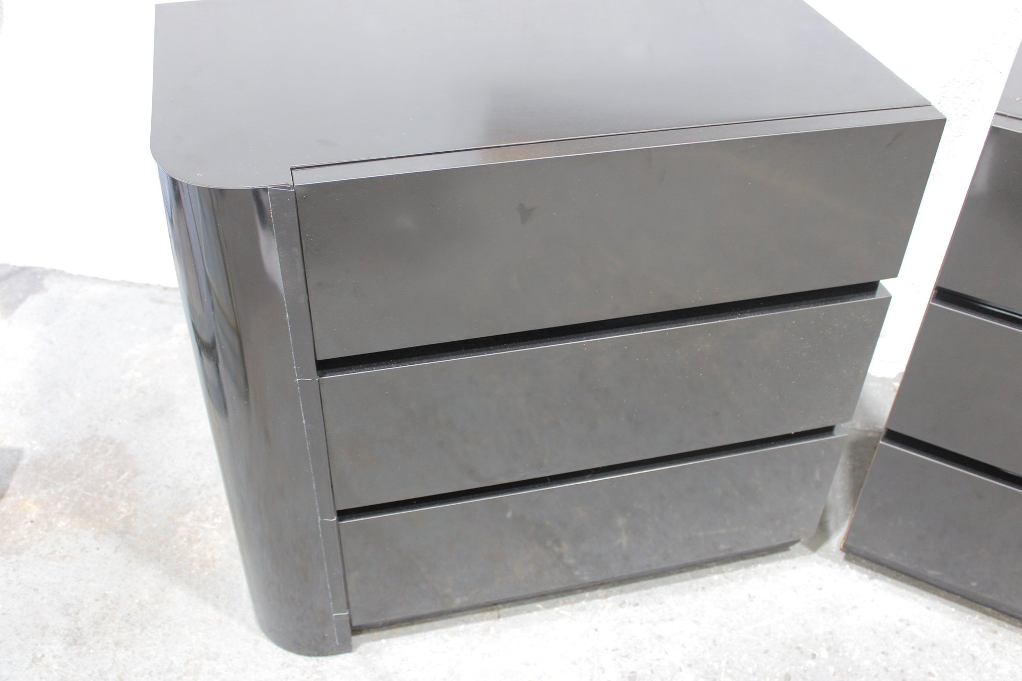 this stylish pair of modern black lacquer 3-drawer nightstands or side tables. Featuring a sleek high-gloss finish and distinctive curved edges, these pieces offer a sophisticated, contemporary look perfect for any bedroom or living area.