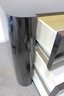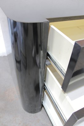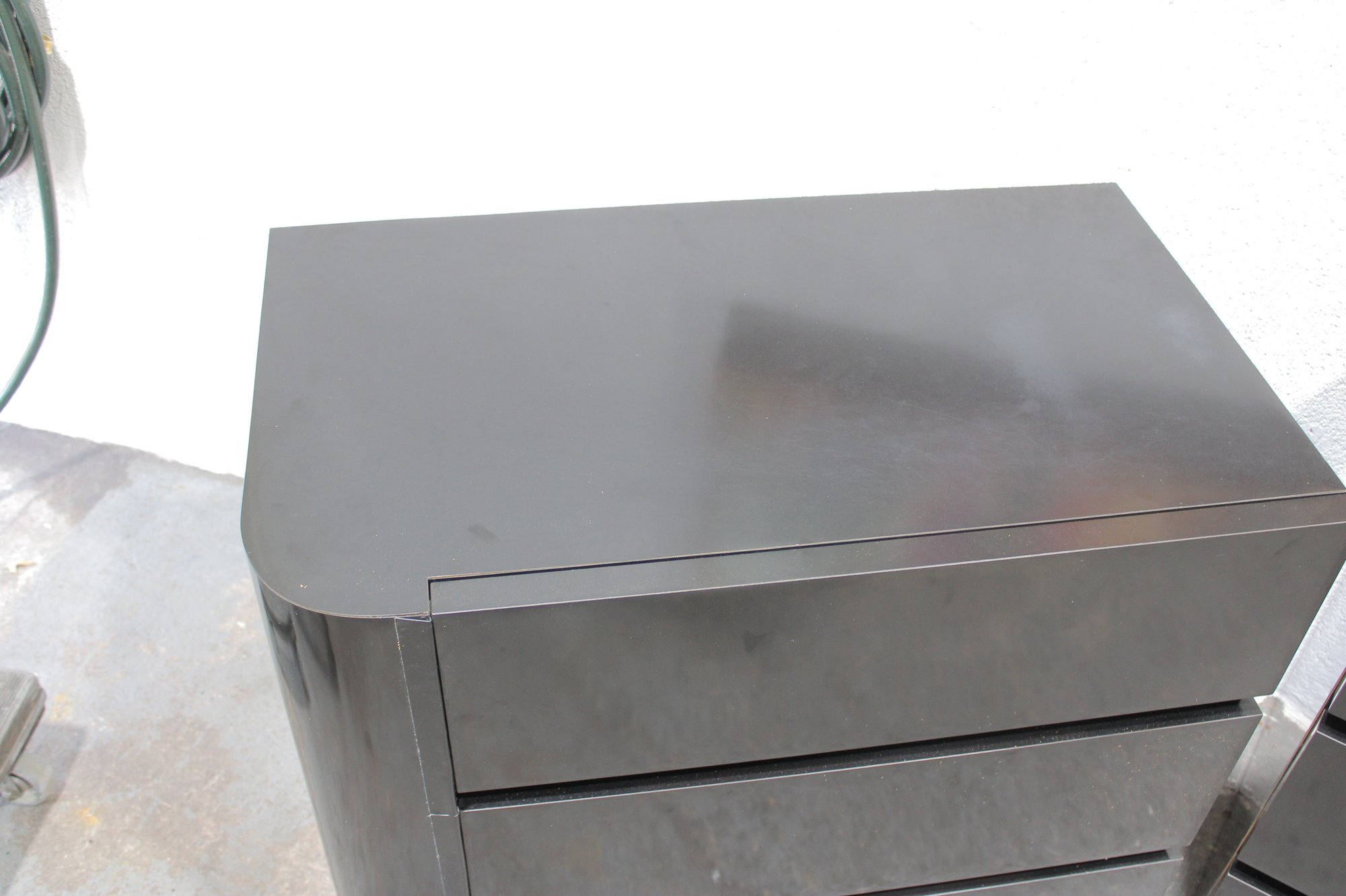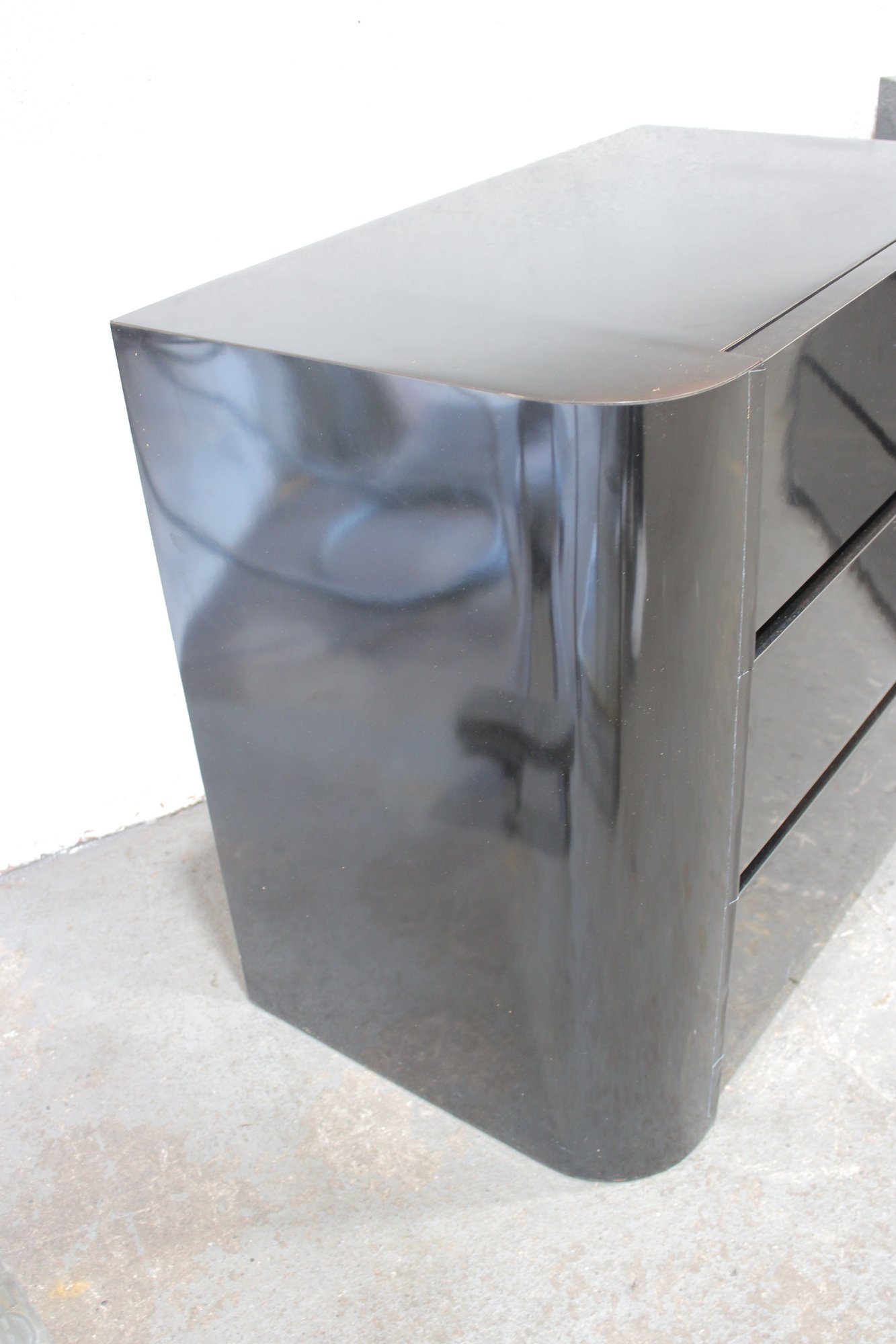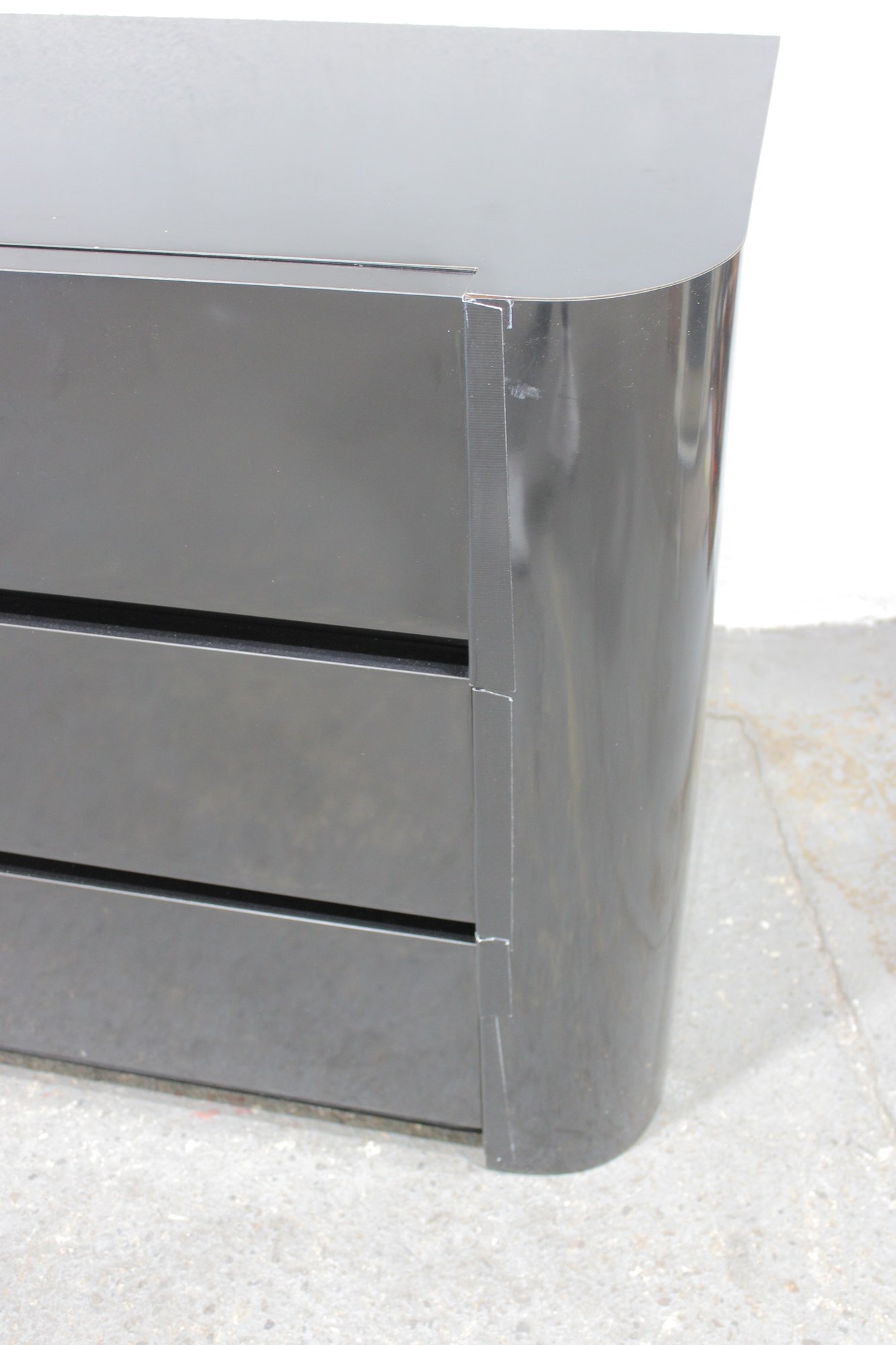 this stylish pair of modern black lacquer 3-drawer nightstands or side tables. Featuring a sleek high-gloss finish and distinctive curved edges, these pieces offer a sophisticated, contemporary look perfect for any bedroom or living area.