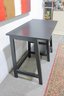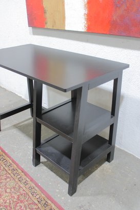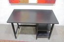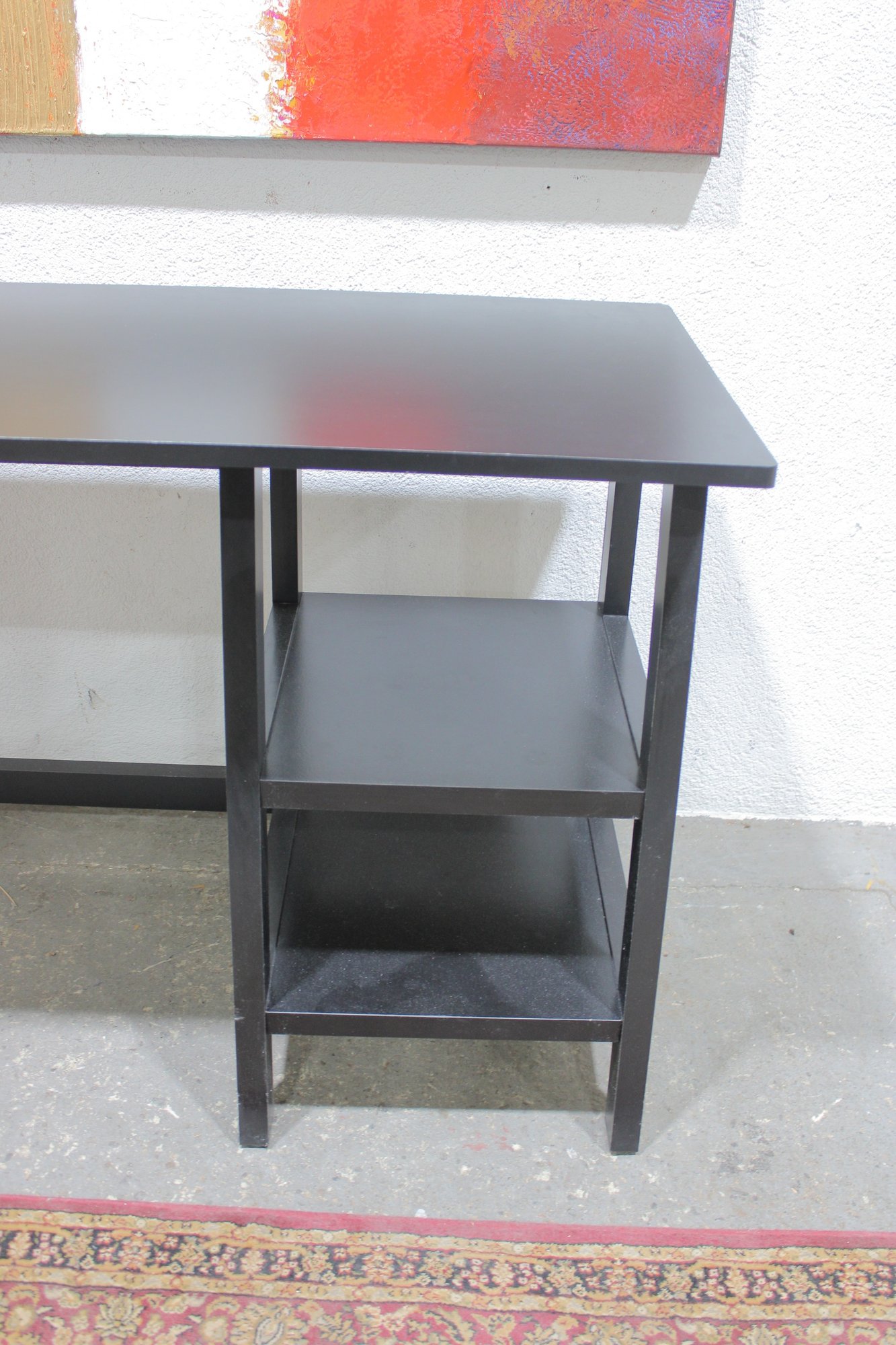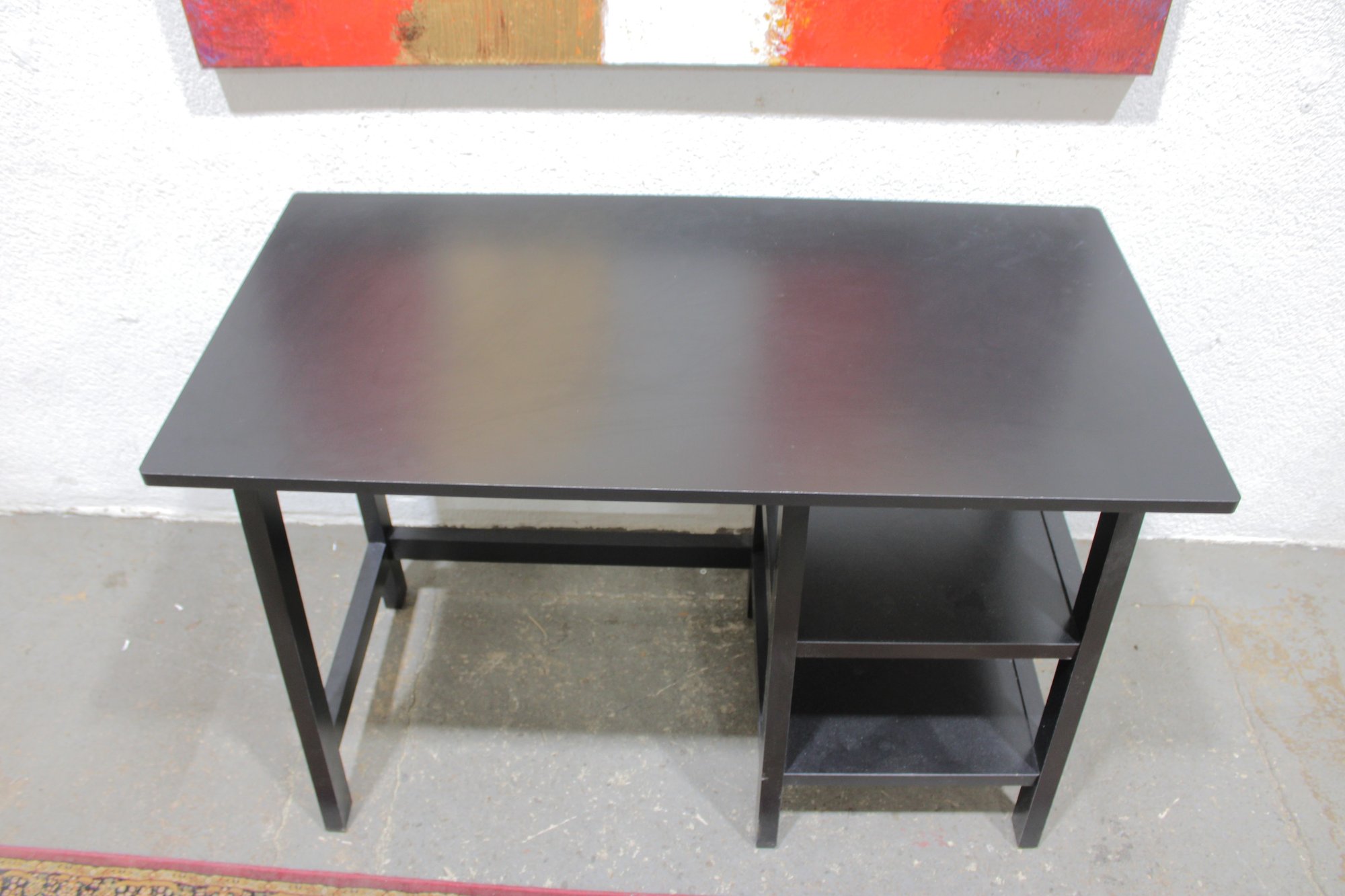 Sleek modern writing desk finished in black with a clean, minimalist design. This practical desk features a spacious rectangular work surface along with built-in open shelving on one side for convenient storage.