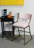 Stylish and comfortable, this modern accent chair features a sleek brass frame with angled legs for a contemporary look. The seat and back cushions are upholstered in a soft pink and white patterned fabric, adding a pop of color and elegance. Perfect for a home office, bedroom, or living area, this chair provides both support and comfort while maintaining a chic aesthetic. Ideal for those looking to enhance their decor with a blend of modern design and cozy charm.
