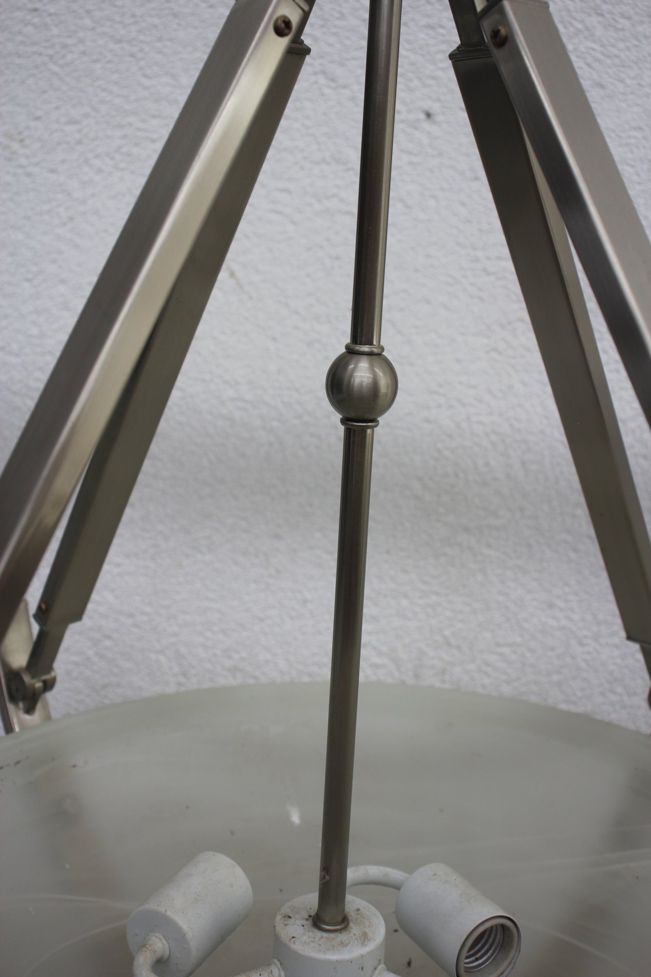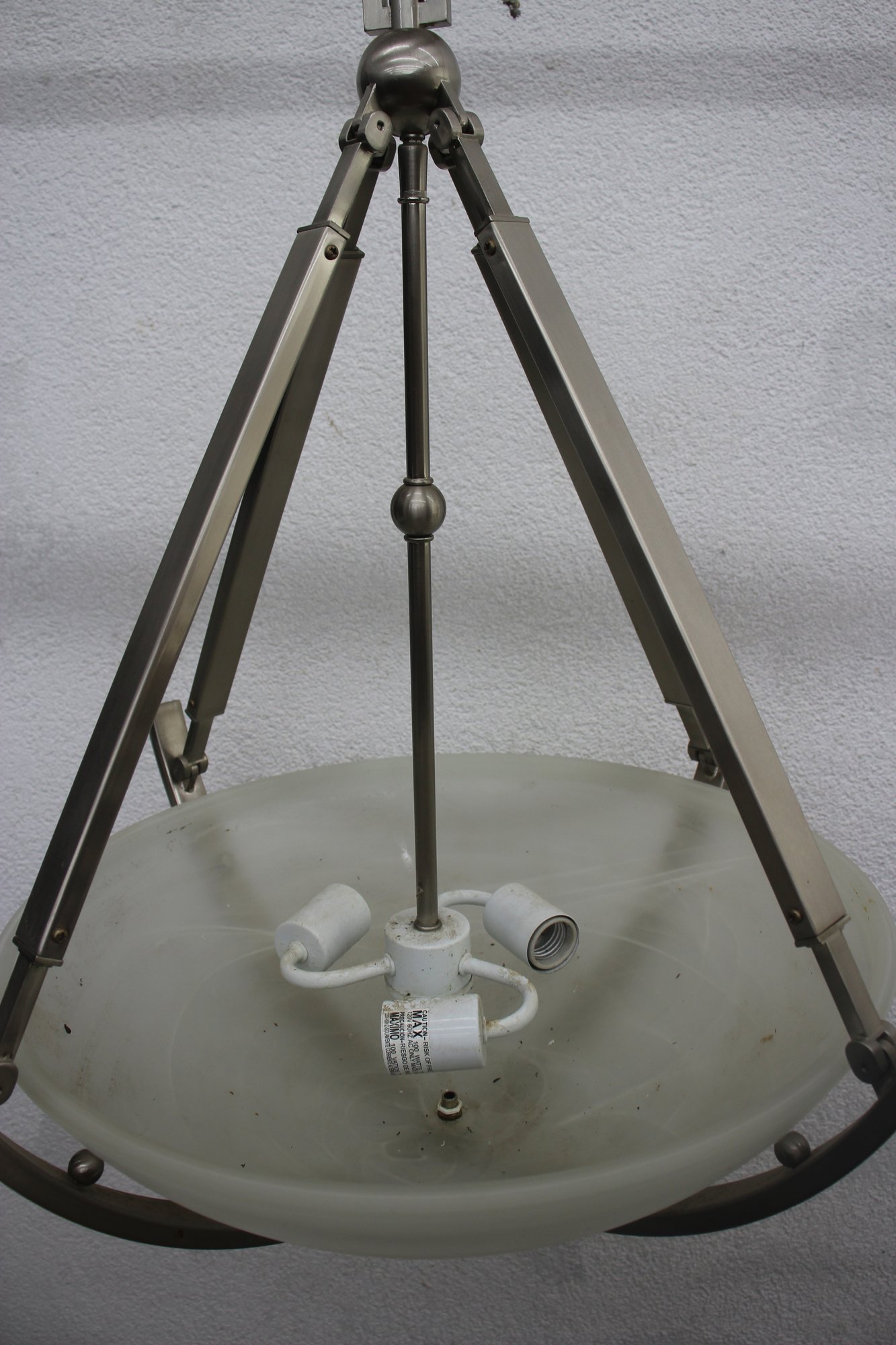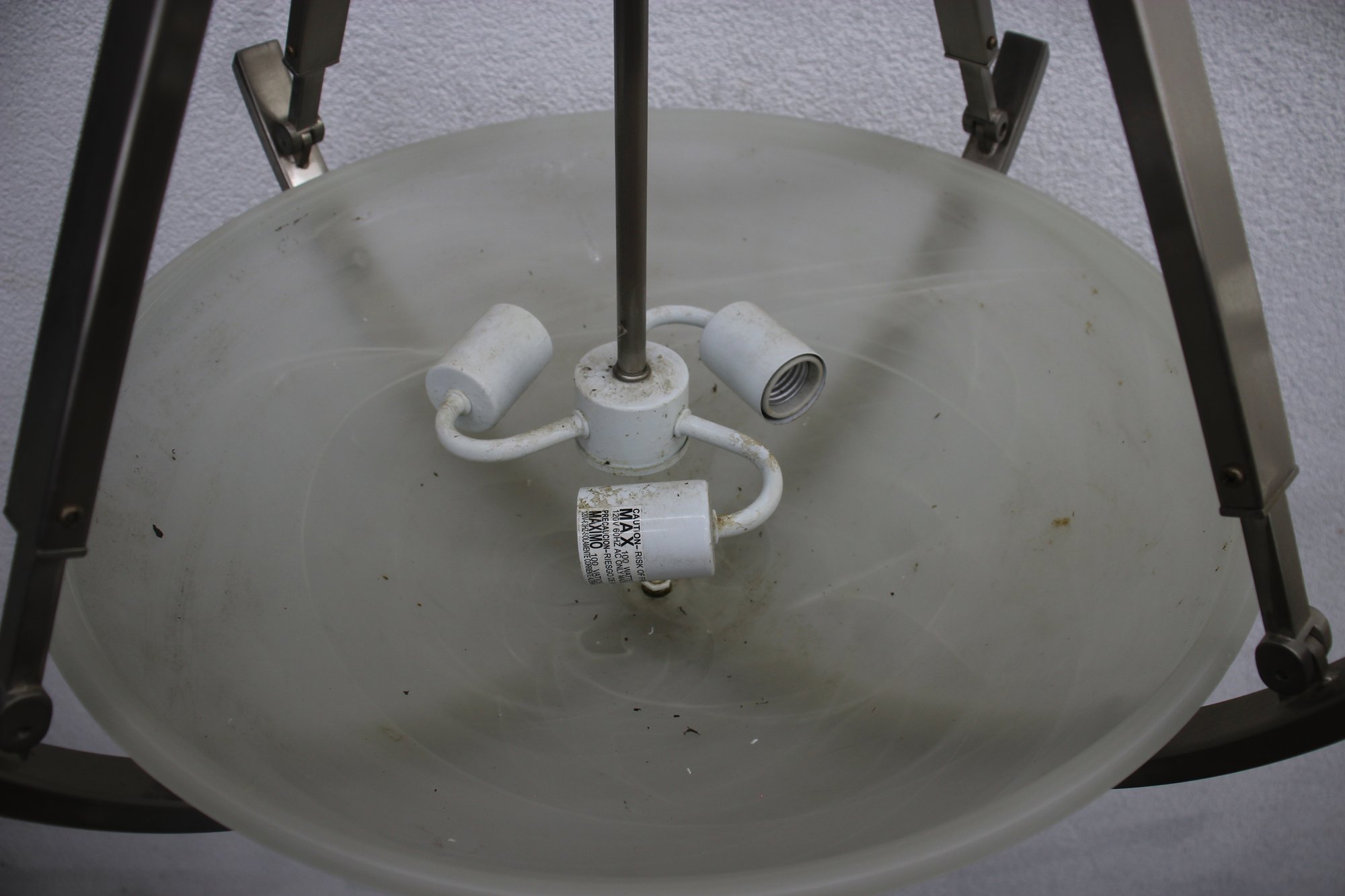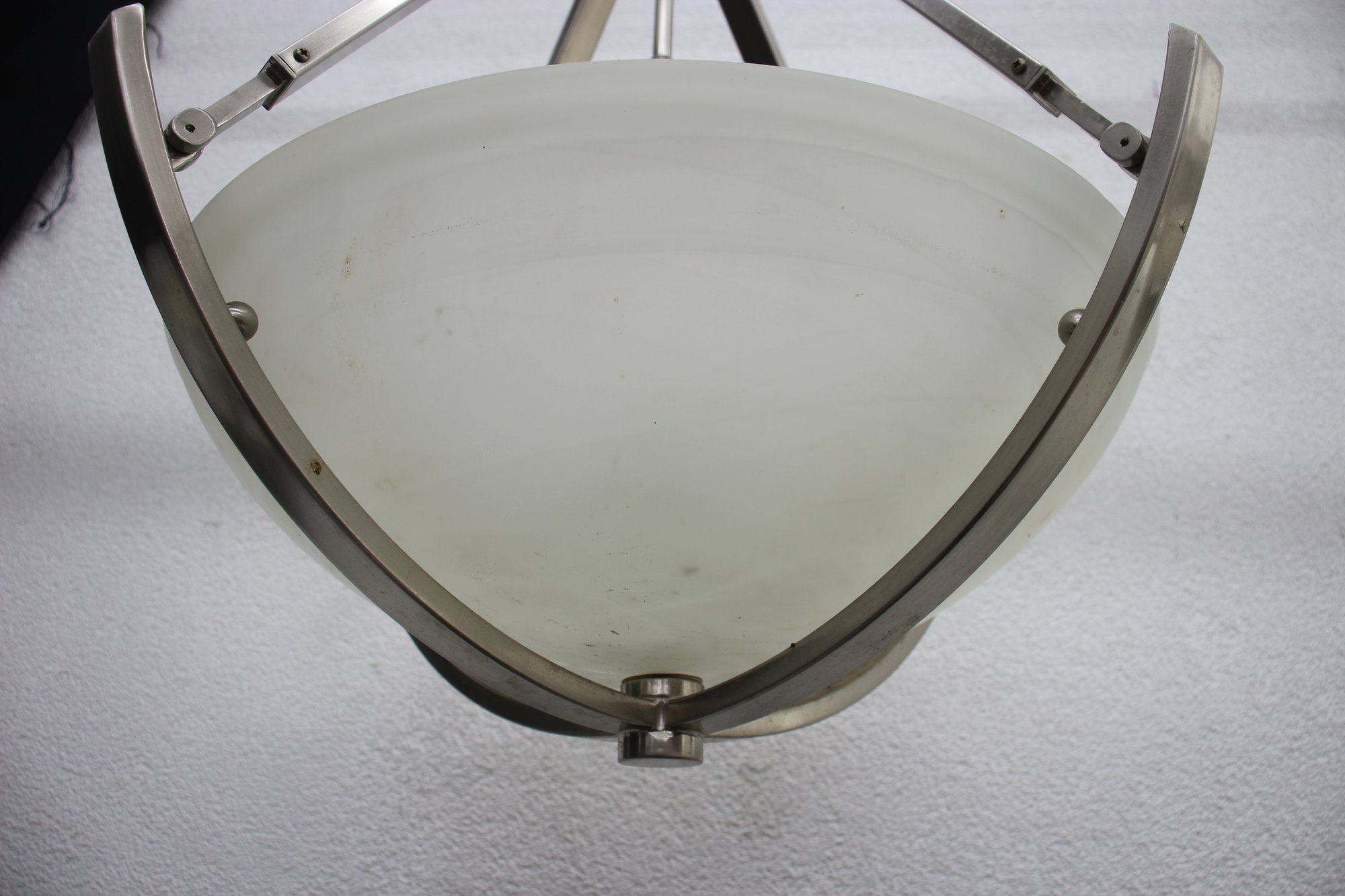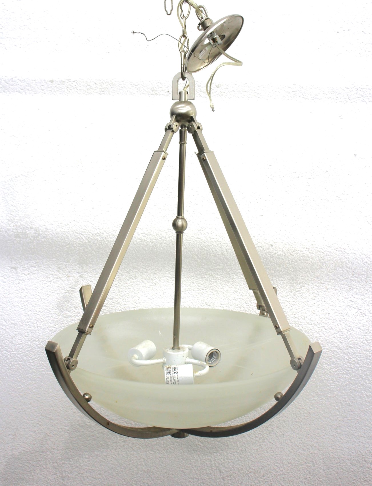 This modern brushed nickel chandelier features a sleek, industrial-inspired design with a frosted glass bowl shade and adjustable metal support arms. Measuring 29 inches in height and 24 inches in diameter, this fixture makes a bold yet sophisticated statement in any space.