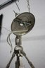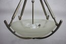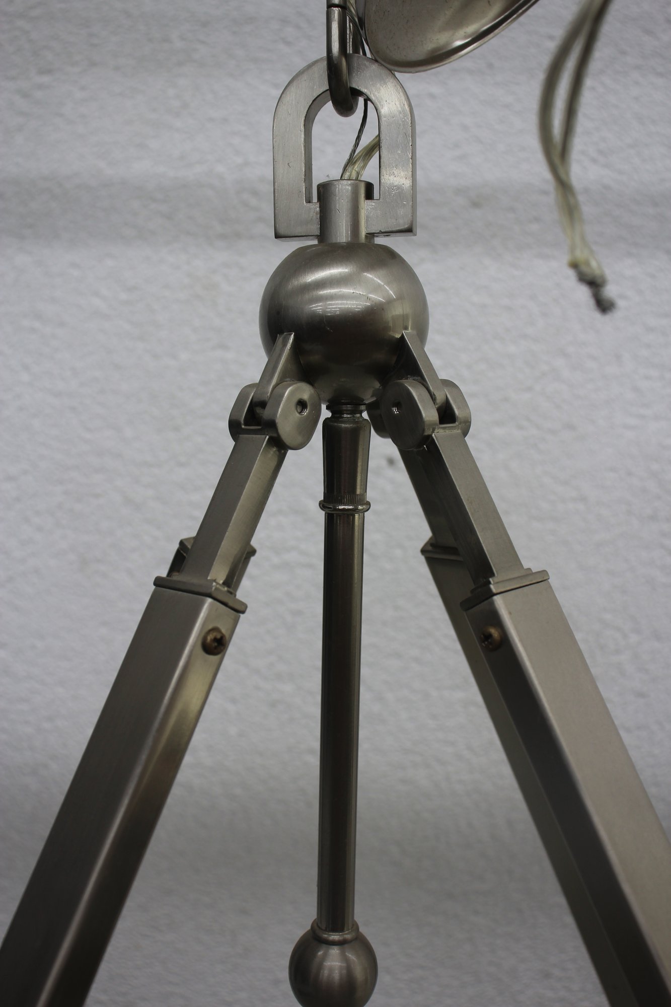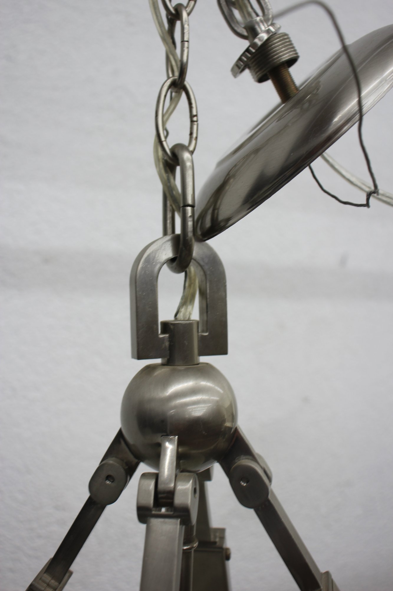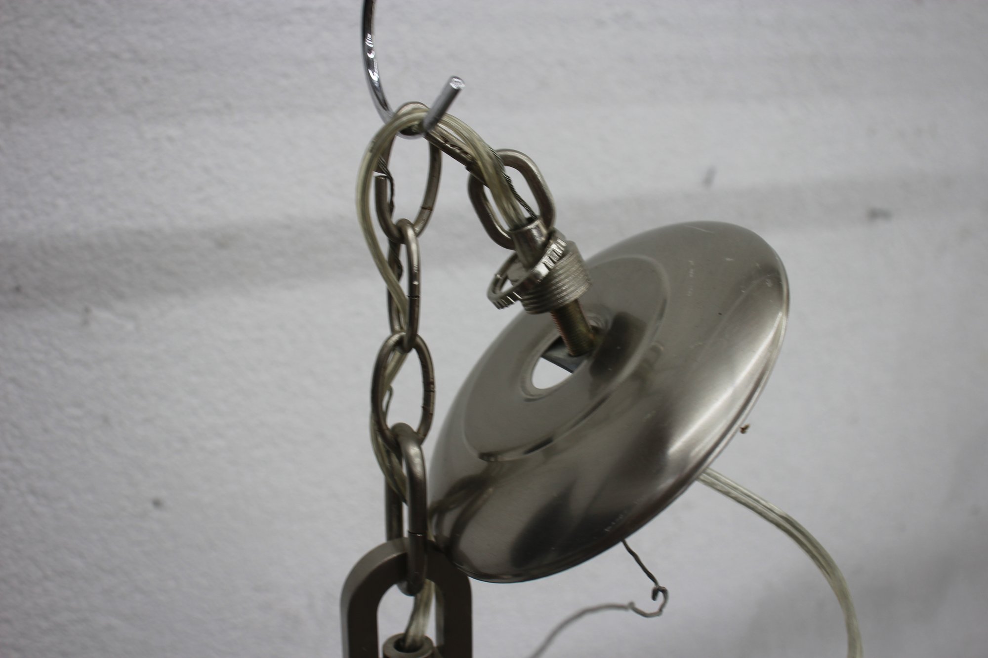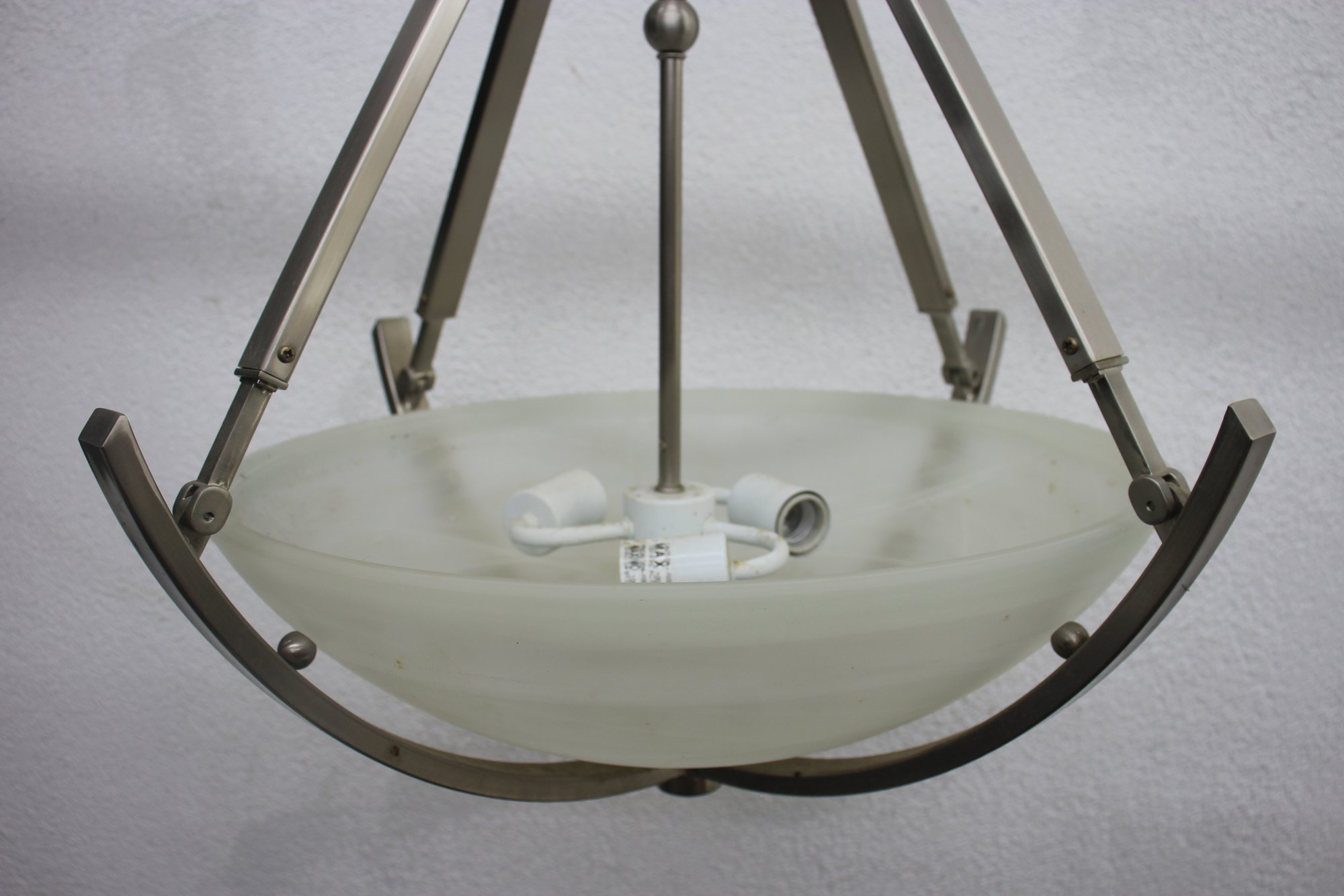 This modern brushed nickel chandelier features a sleek, industrial-inspired design with a frosted glass bowl shade and adjustable metal support arms. Measuring 29 inches in height and 24 inches in diameter, this fixture makes a bold yet sophisticated statement in any space.