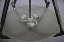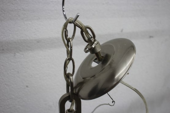 The frosted glass diffuser provides soft, ambient lighting, while the three-light socket configuration ensures ample illumination. The fixture is suspended by a sturdy chain and matching canopy, allowing for easy installation and height adjustment.