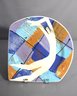 a stunning ceramic platter, signed by the artist Carlson and dated 1985. This eye-catching piece features a dynamic abstract design with vibrant shades of blue, orange, and white, highlighted with expressive splashes and patterns. The central motif of a graceful bird in flight adds a touch of elegance to the bold, energetic background.