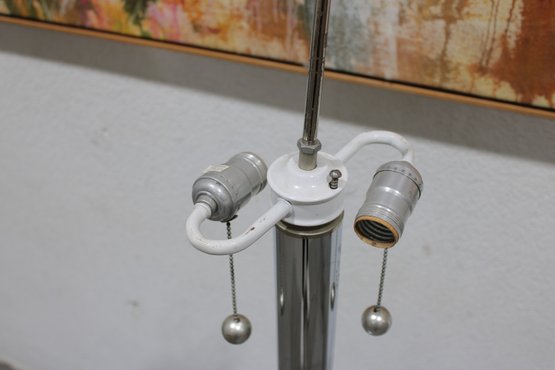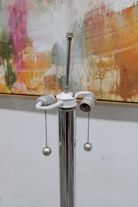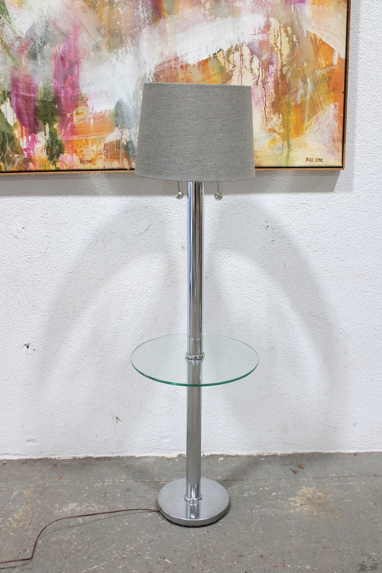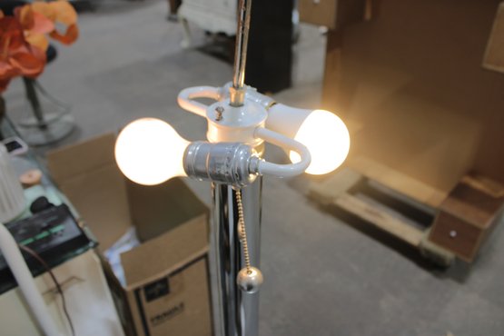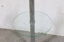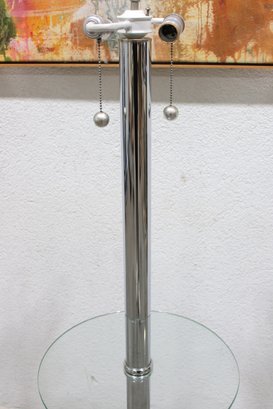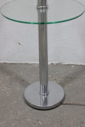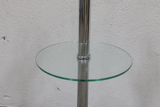 The lamp includes a three-light configuration for ample illumination, while the circular glass shelf adds a practical touch—perfect for placing a drink, phone, or décor. Its sleek chrome column and clean lines make it a great fit for contemporary interiors.