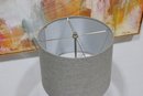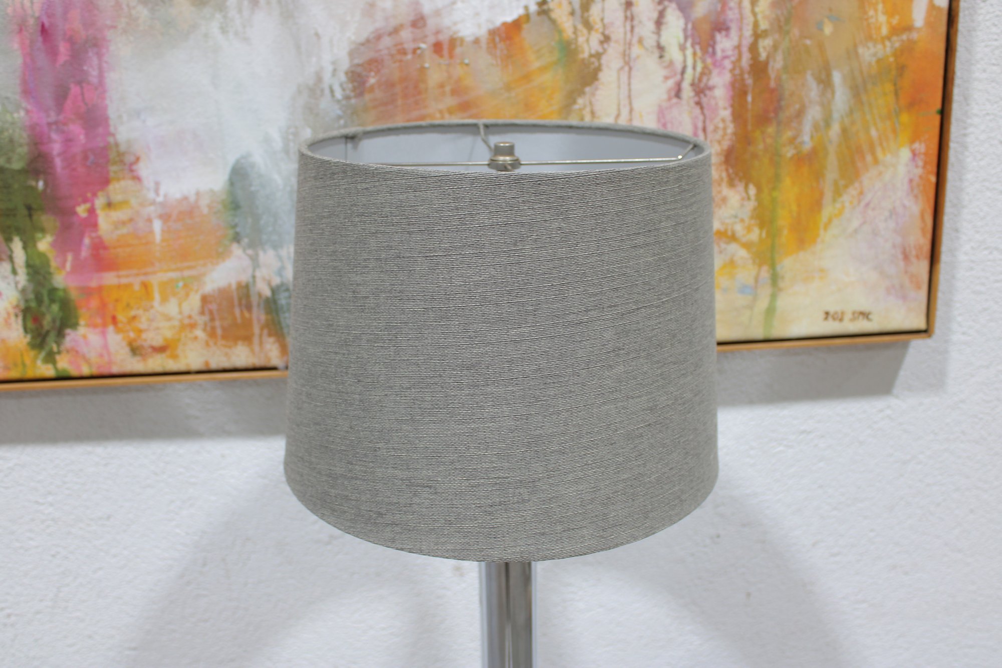 a stylish modern floor lamp featuring a polished chrome finish with an integrated glass shelf and a neutral fabric shade. This functional and decorative piece provides both ambient lighting and a convenient surface for small items.