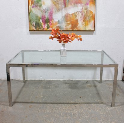 The table expands to a generous length, providing ample seating space when fully extended while maintaining a streamlined profile when closed. The chrome frame gives it a crisp, architectural look, while the glass surfaces enhance the light, open feel.