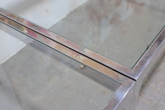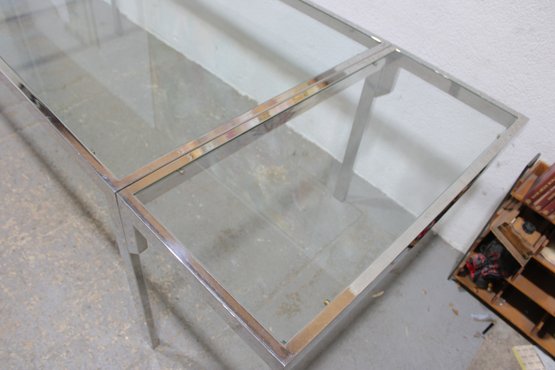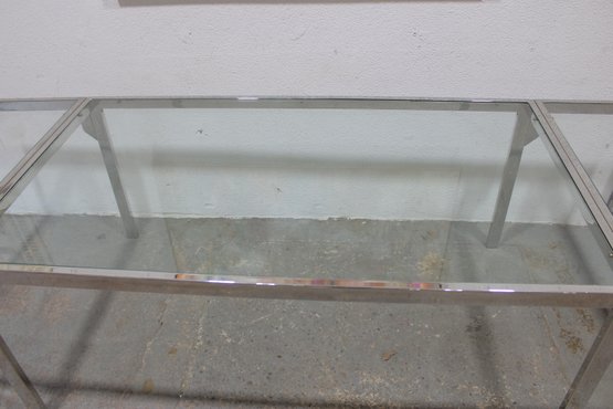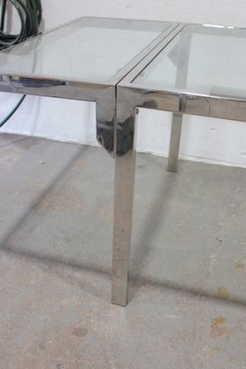 a sleek modern expanding dining table featuring a polished chrome frame with glass tops. This versatile piece combines clean contemporary design with functional flexibility, making it ideal for both everyday use and entertaining.