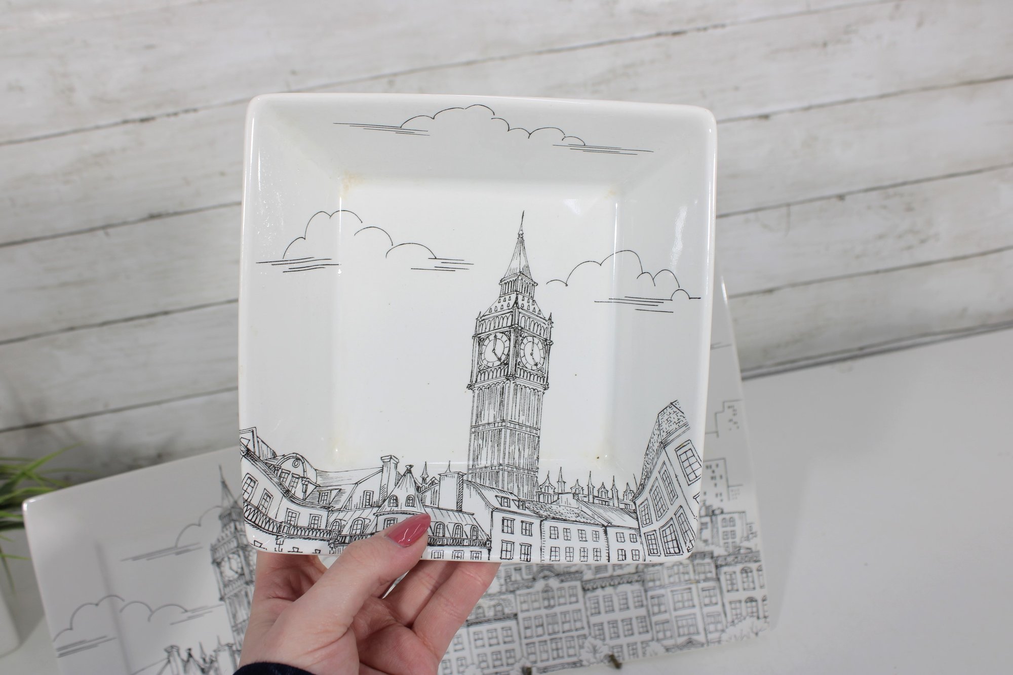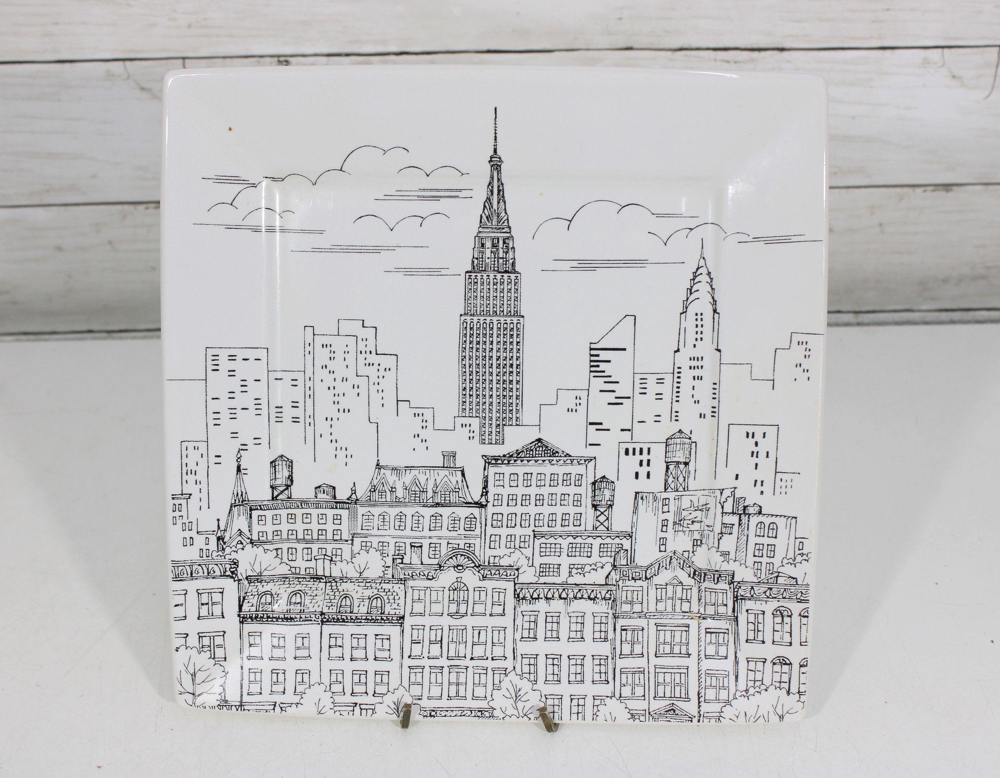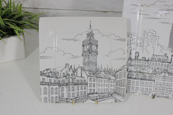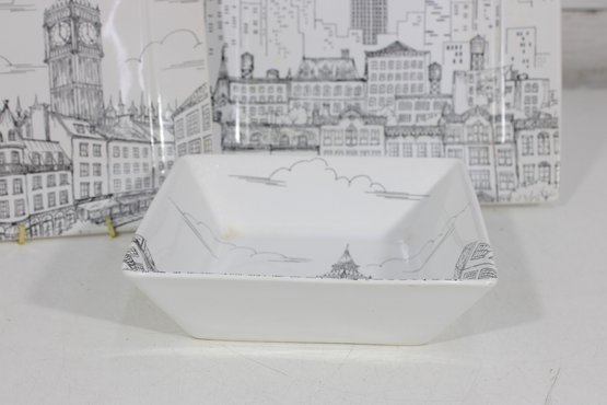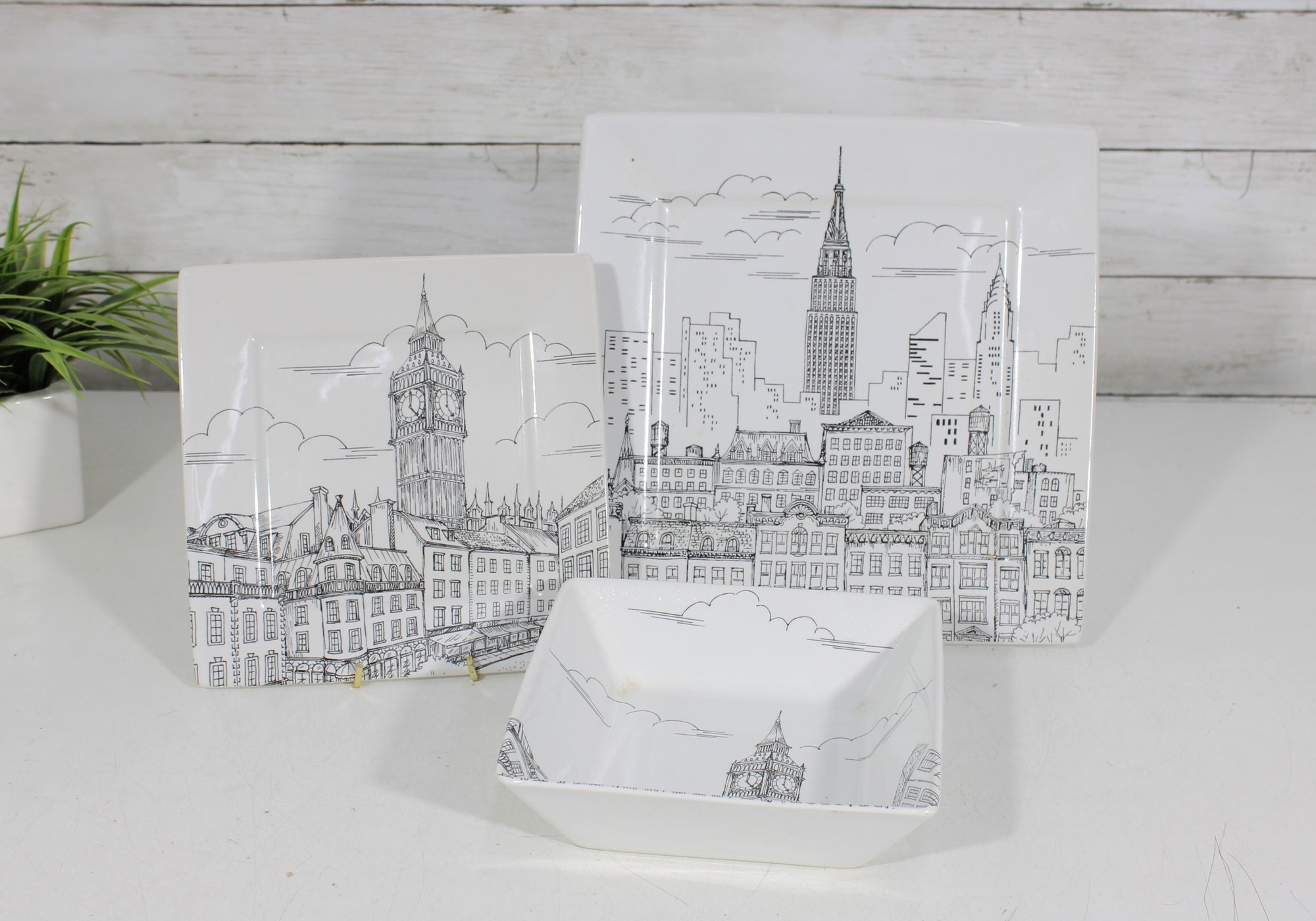 Stylish modern cityscape dinnerware set featuring black and white illustrated skyline scenes, including iconic New York-style architecture such as the Empire State Building. This coordinated set includes square plates and a matching bowl, all with clean lines and contemporary urban design.