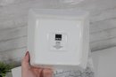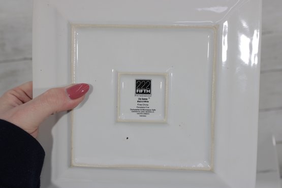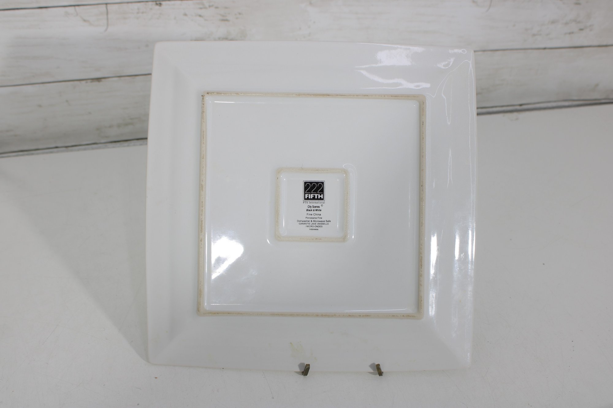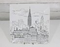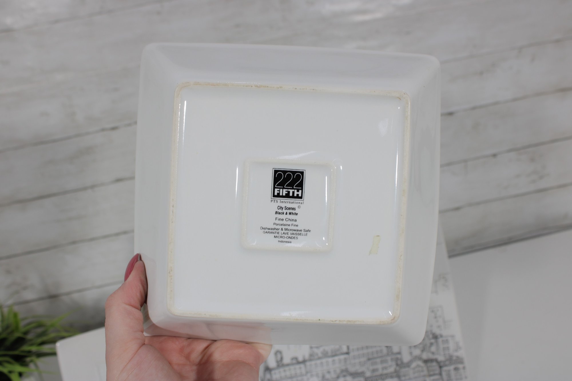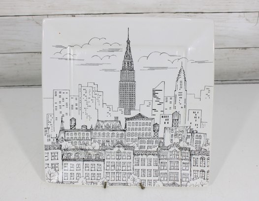 Stylish modern cityscape dinnerware set featuring black and white illustrated skyline scenes, including iconic New York-style architecture such as the Empire State Building. This coordinated set includes square plates and a matching bowl, all with clean lines and contemporary urban design.