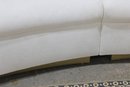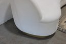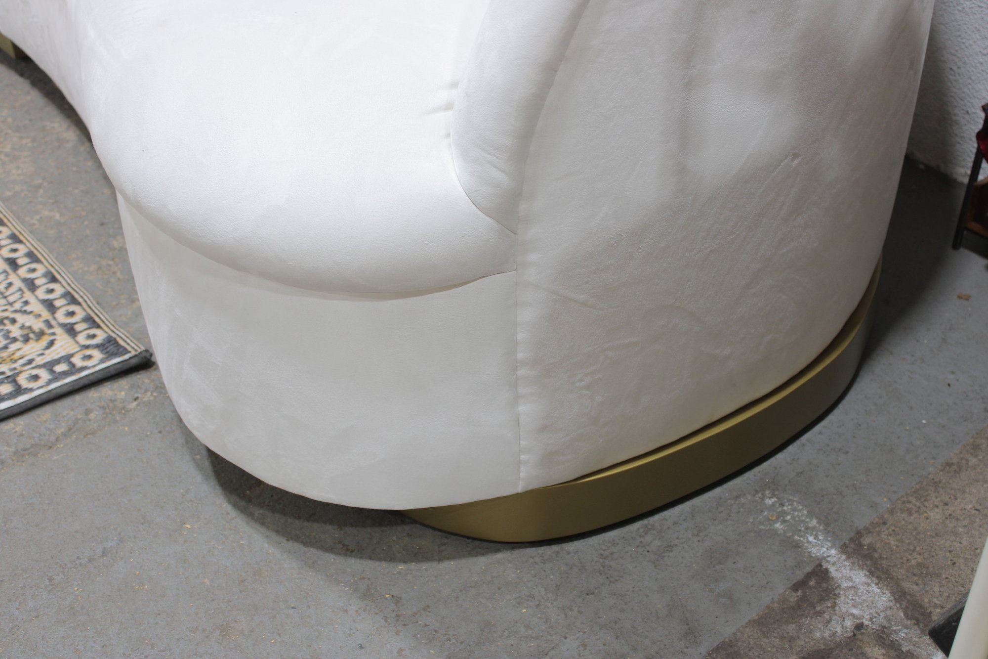 The loveseat showcases a gently curved back and integrated arms, offering both comfort and visual appeal. The clean white upholstery provides a fresh, versatile look that complements a variety of interiors, while the metallic brass-tone base adds a touch of luxury and modern contrast.