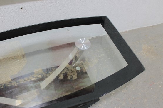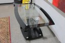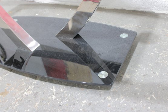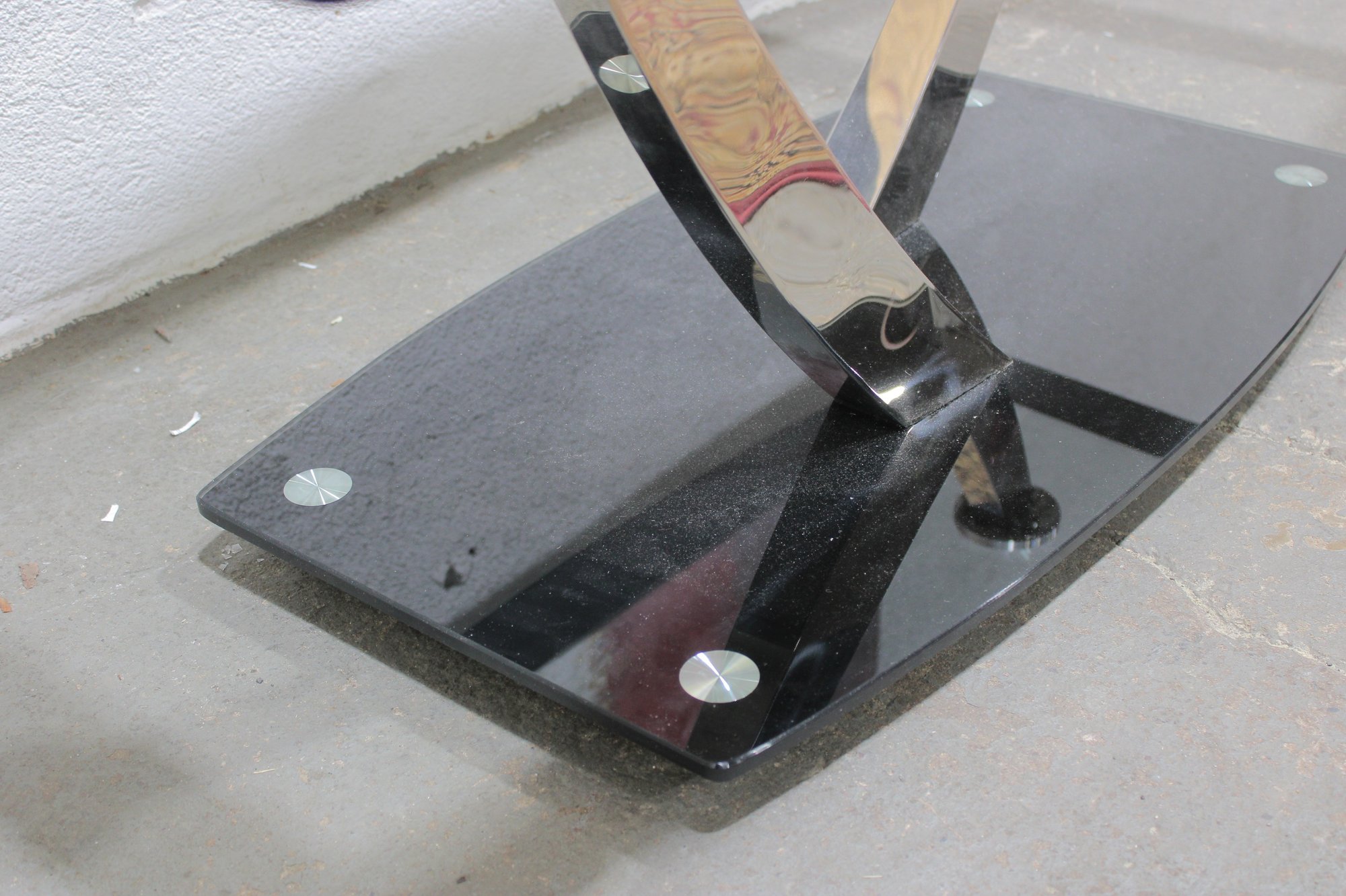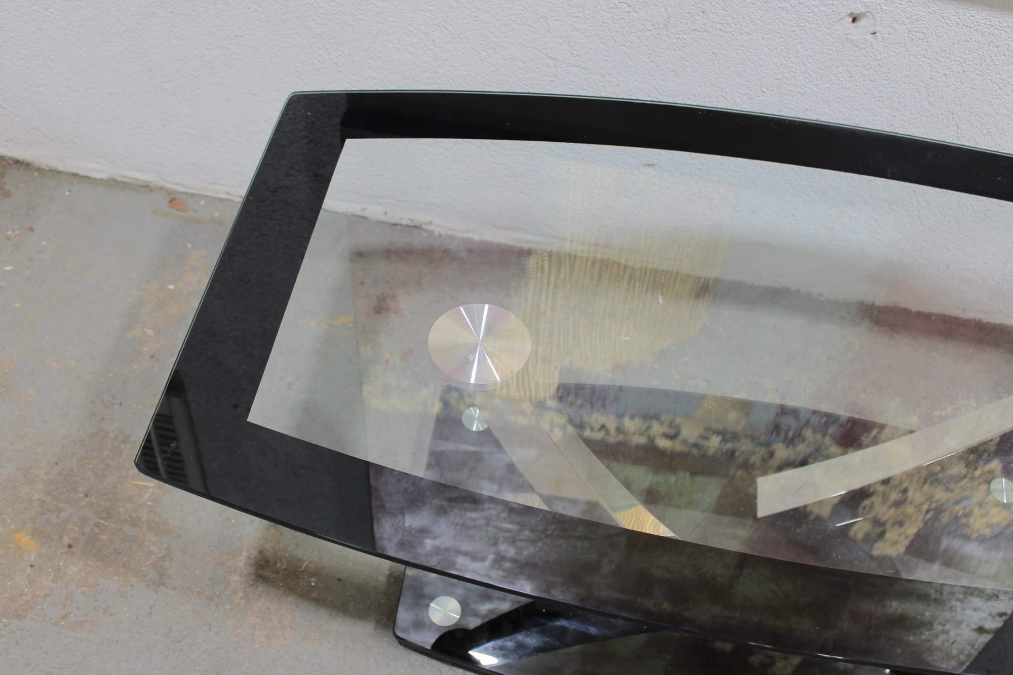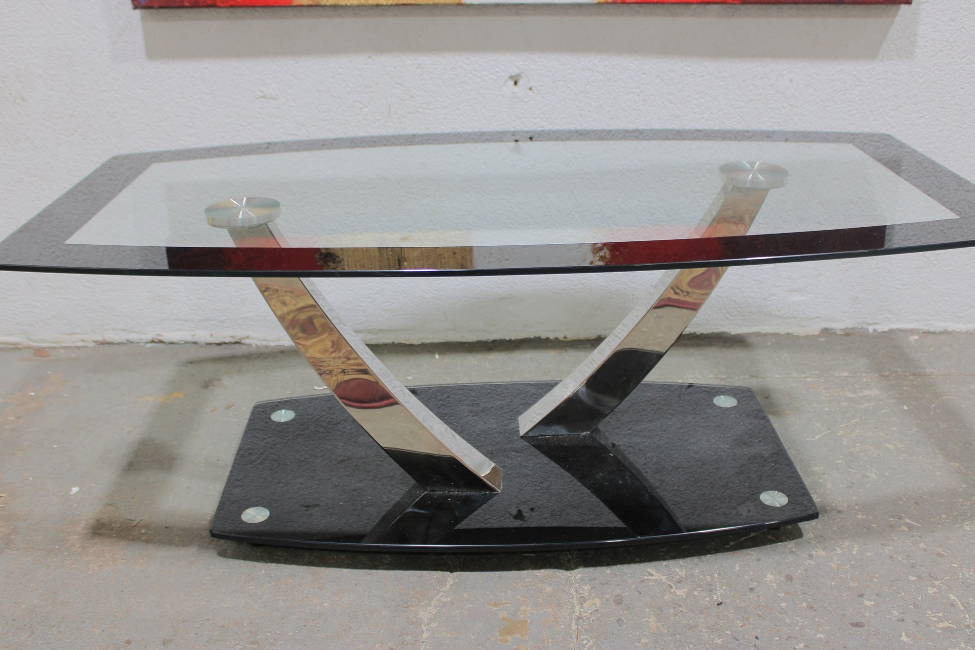 The table sits on a sturdy black base with chrome supports that cross elegantly in the center, creating a sleek architectural design. The clear glass top allows the unique base structure to remain visible, adding visual interest and a modern touch to any space.