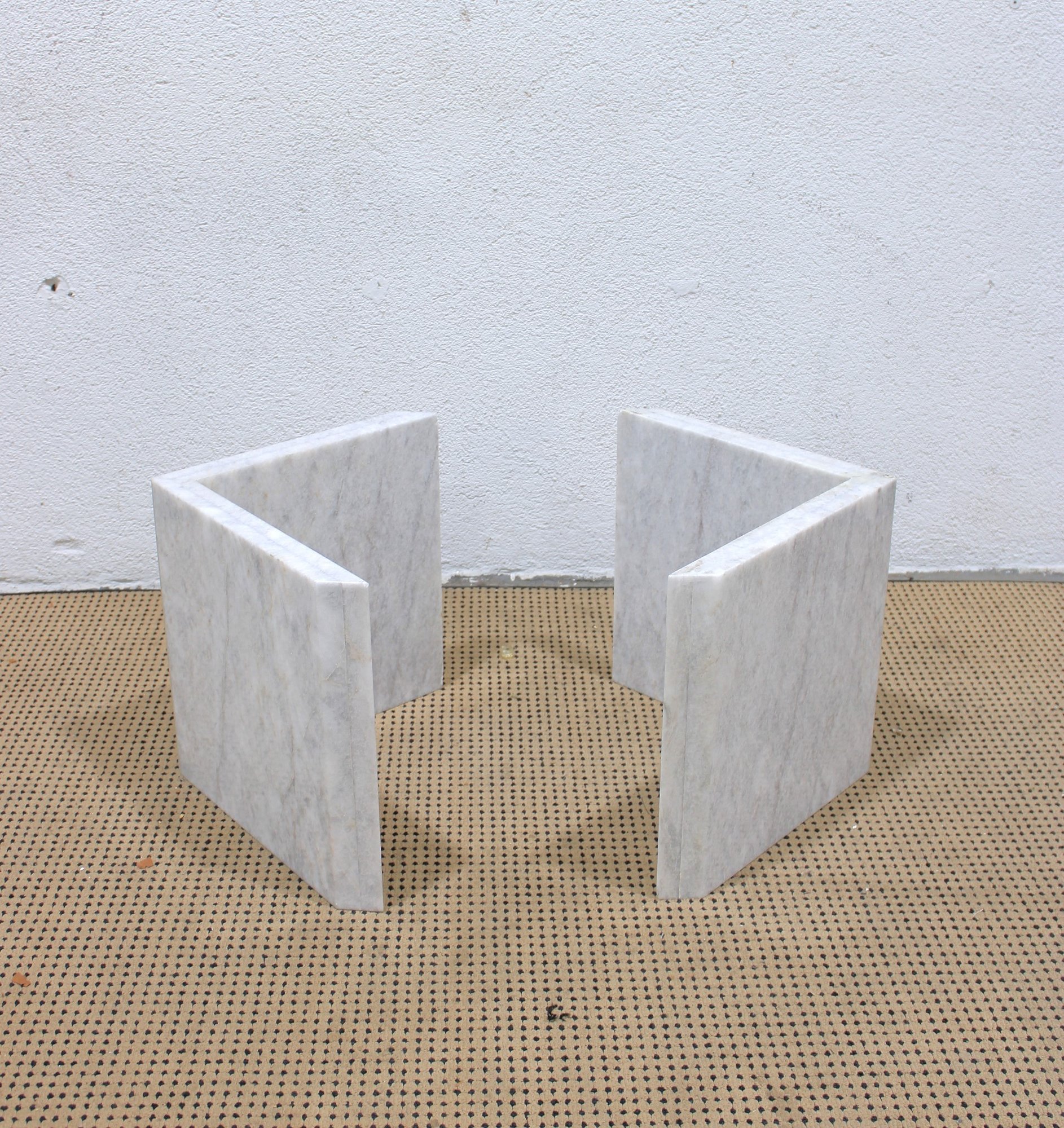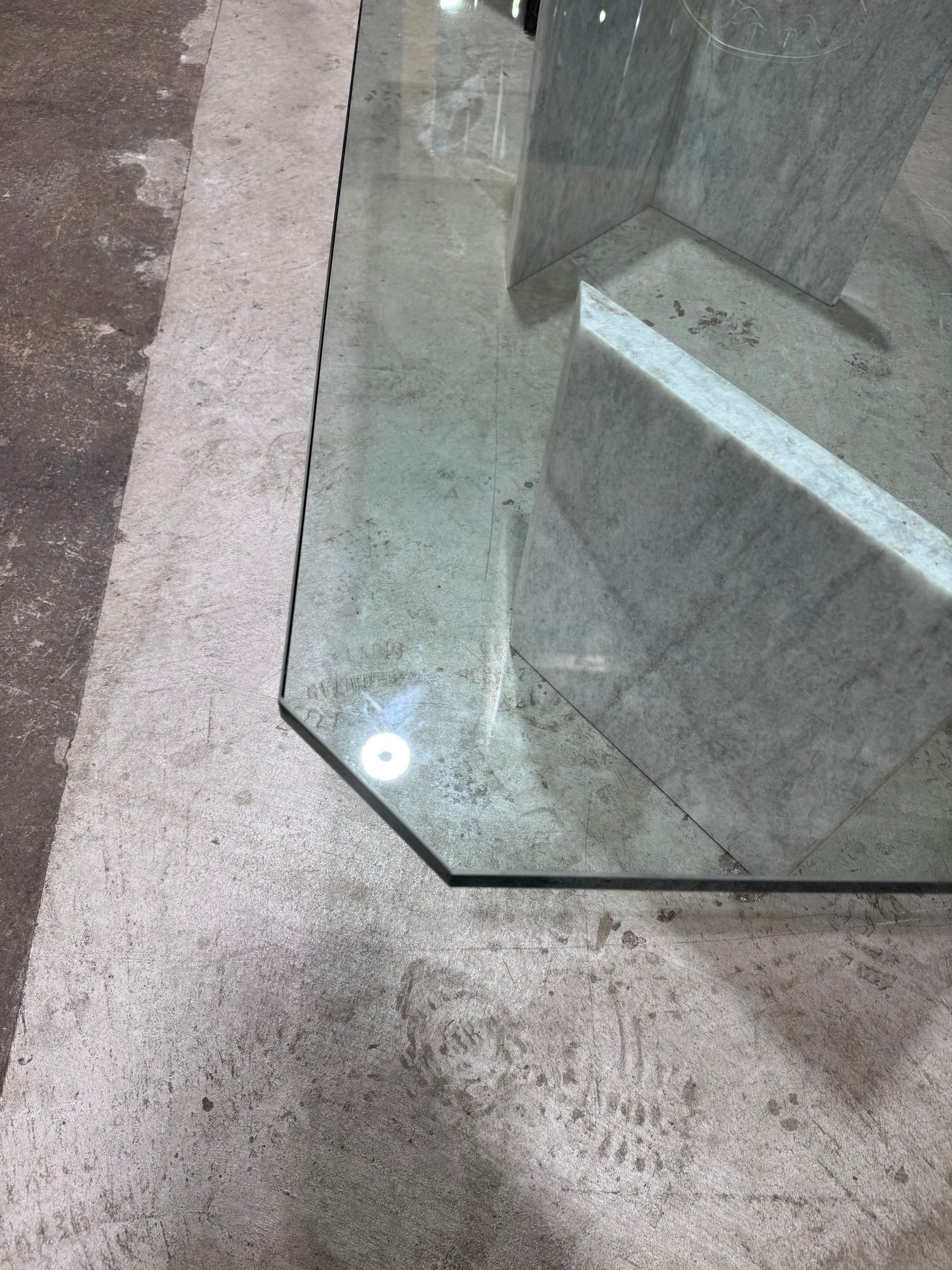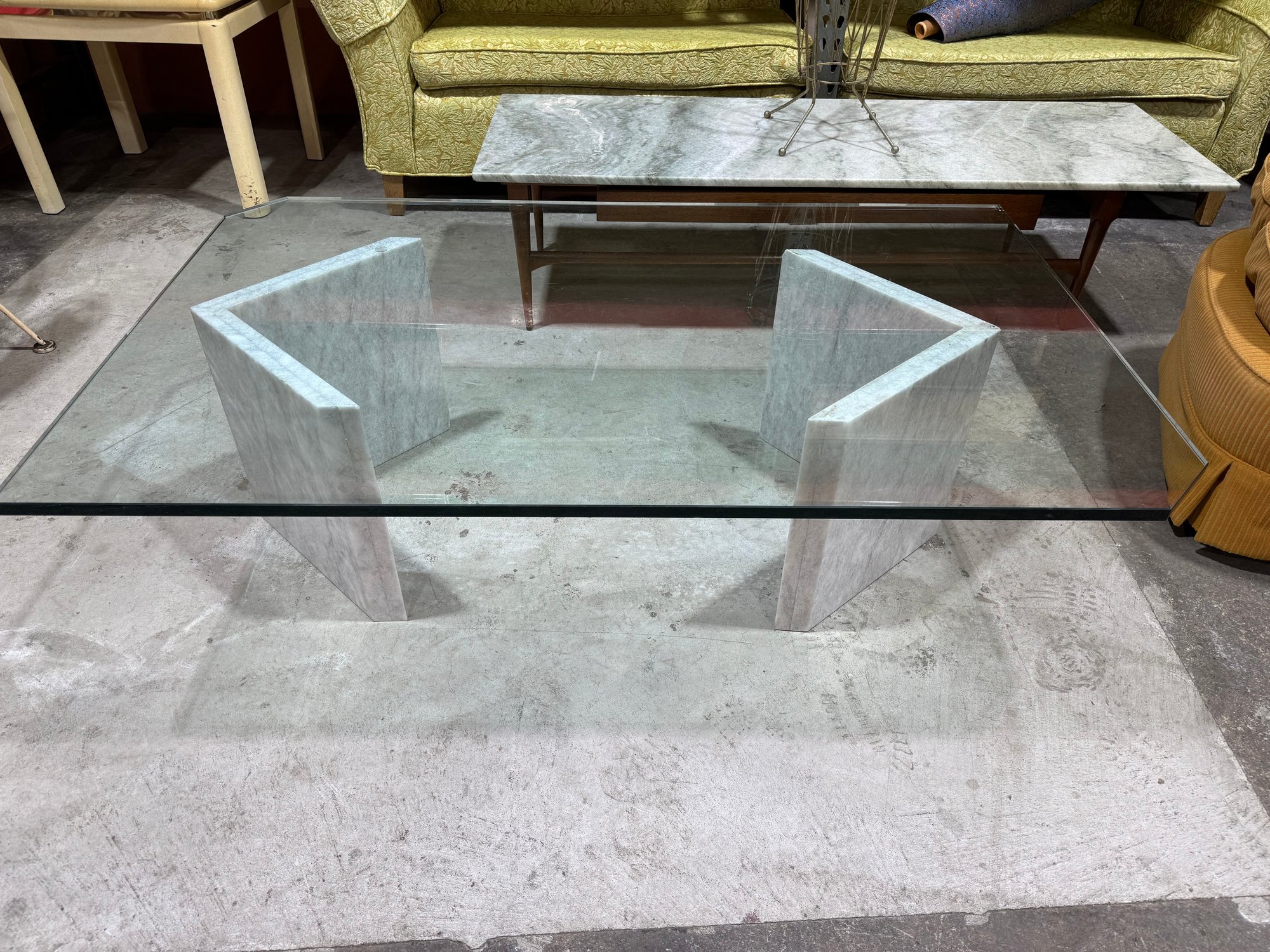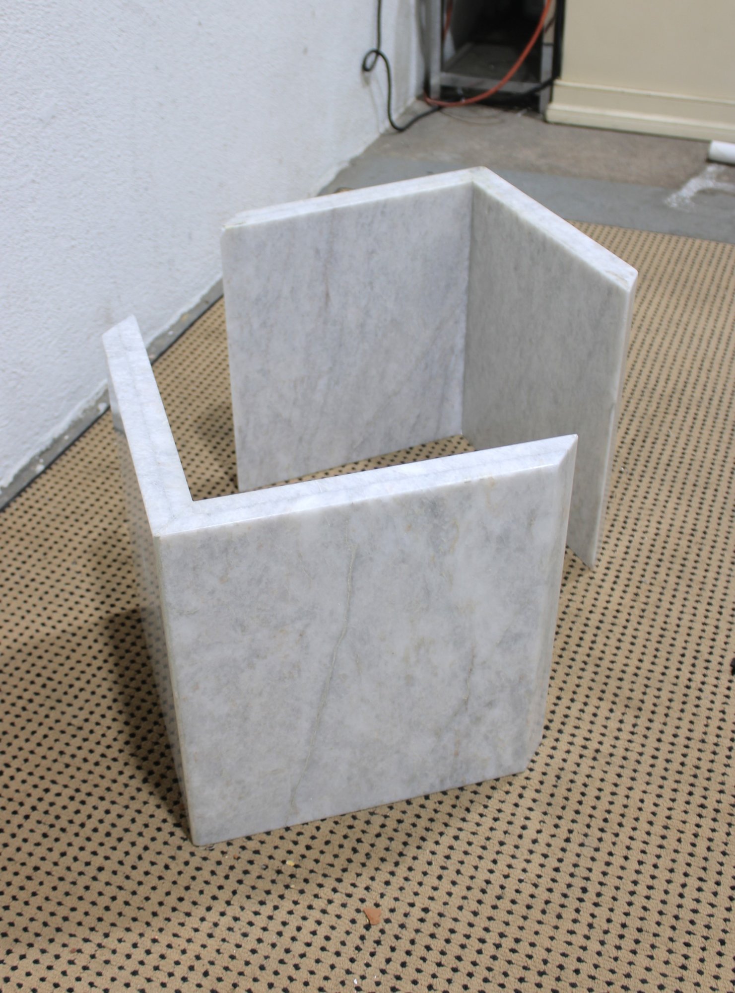 The base is crafted from thick marble panels arranged in a sculptural formation that beautifully supports a glass top (not pictured if removed for transport). The light marble coloration offers a sophisticated, neutral tone that complements a variety of décor styles.