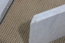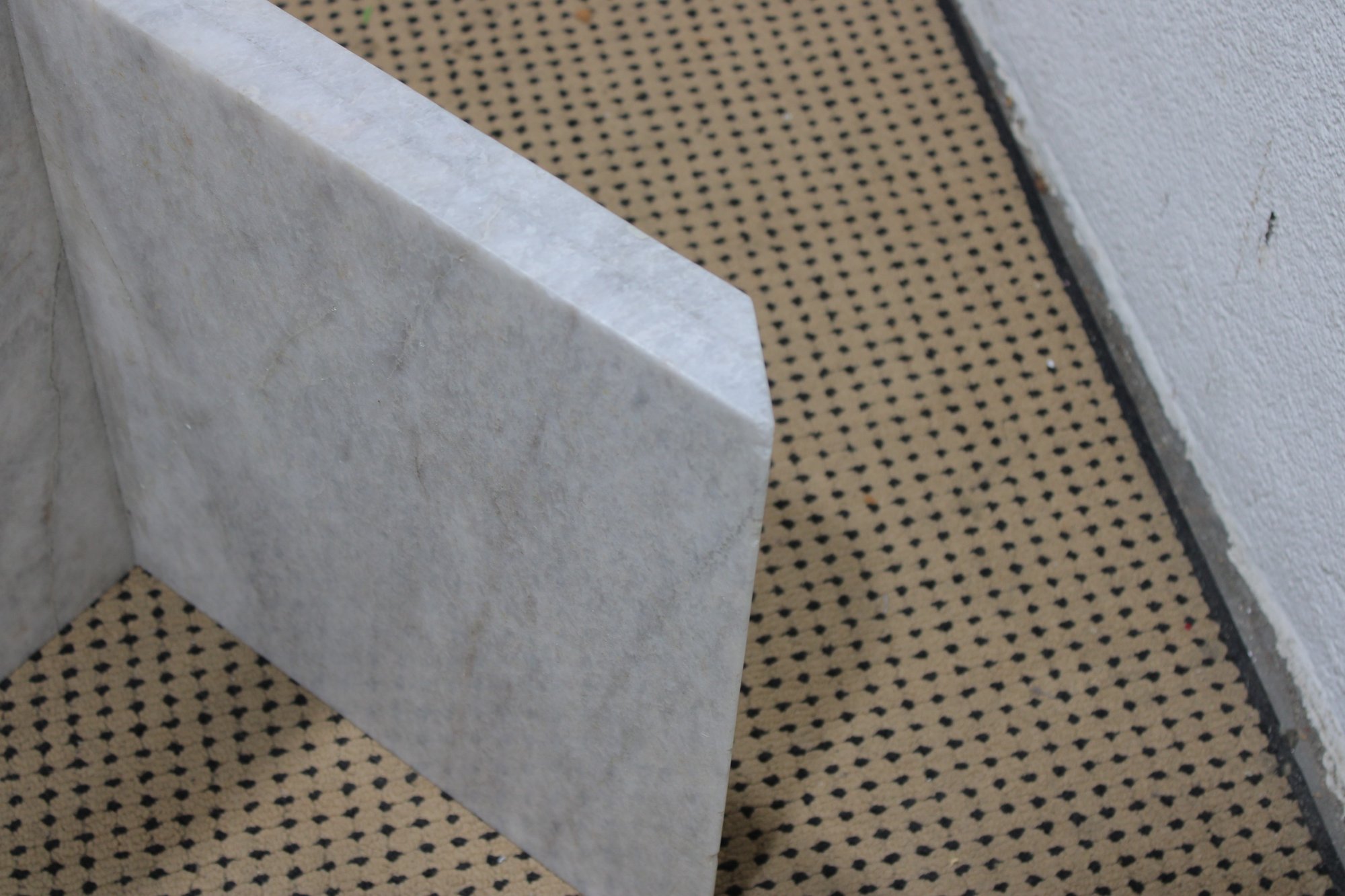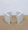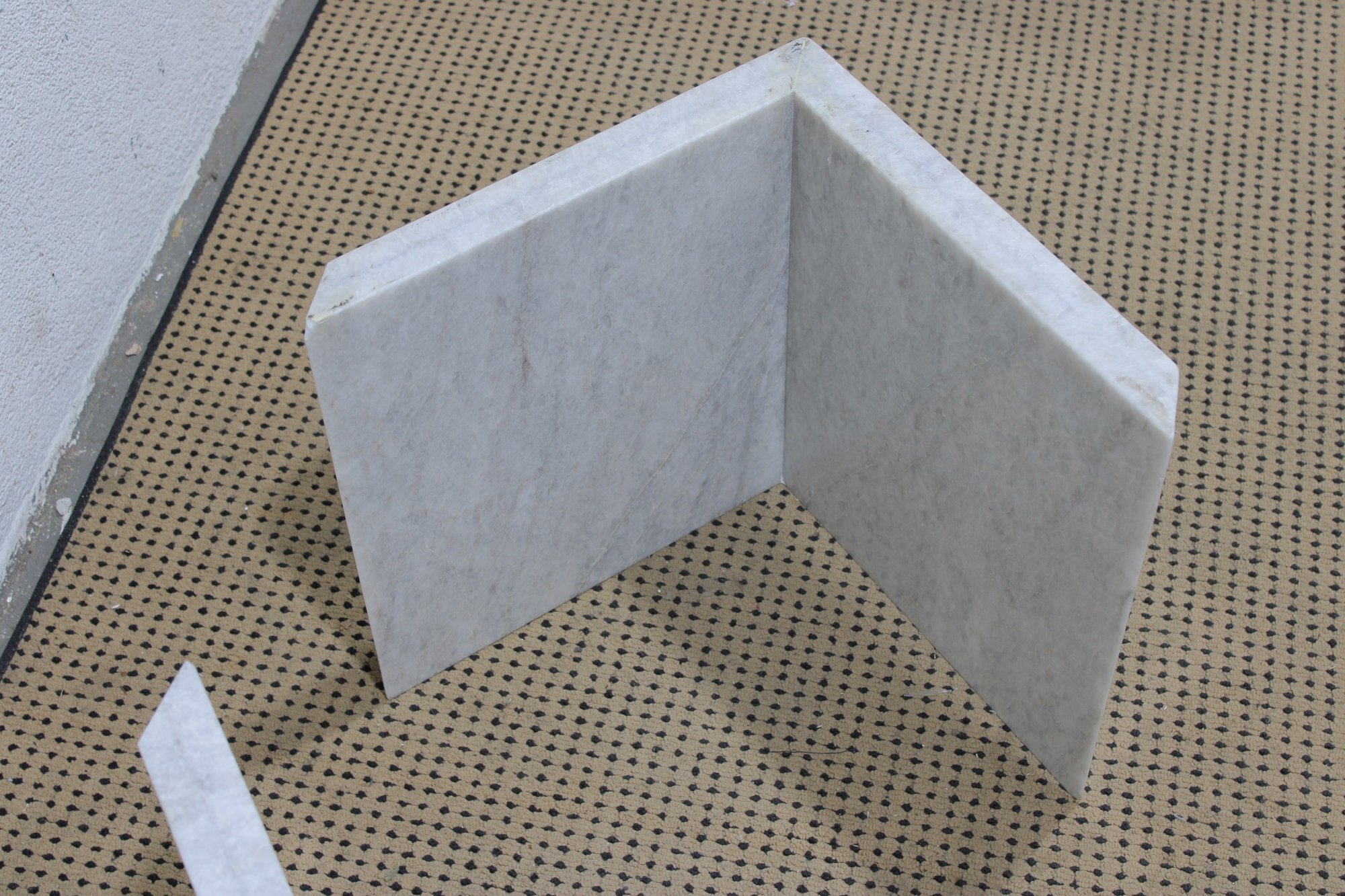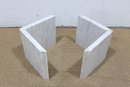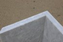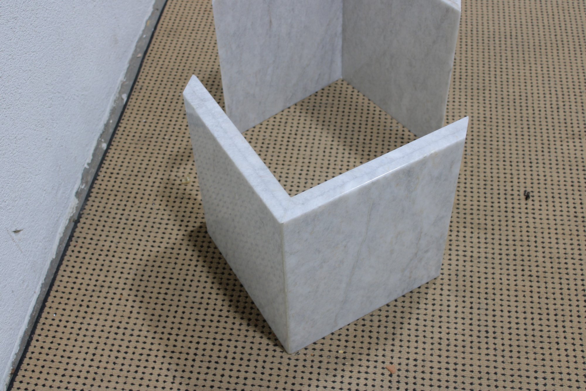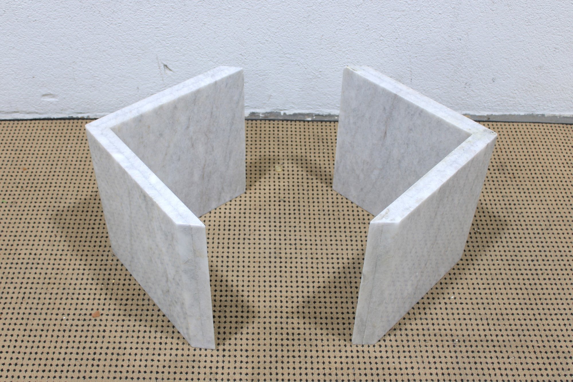 The base is crafted from thick marble panels arranged in a sculptural formation that beautifully supports a glass top (not pictured if removed for transport). The light marble coloration offers a sophisticated, neutral tone that complements a variety of décor styles.