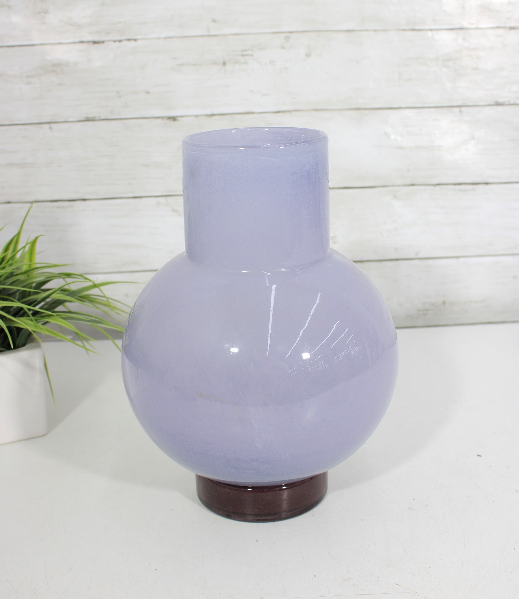 The vase is set on a contrasting darker base, adding visual depth and stability to the design. Its clean lines and calming color make it a versatile accent for modern, minimalist, or eclectic interiors.