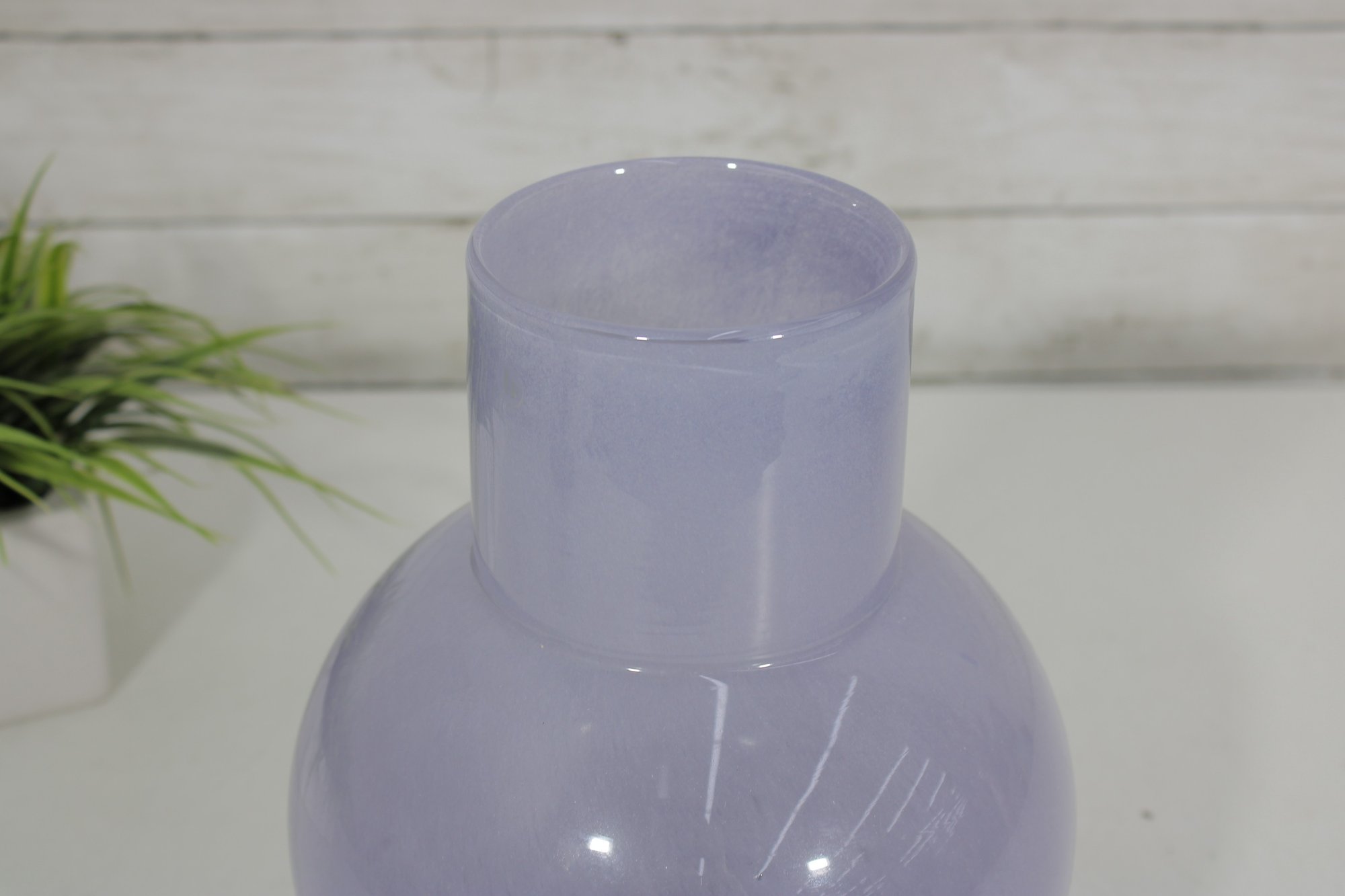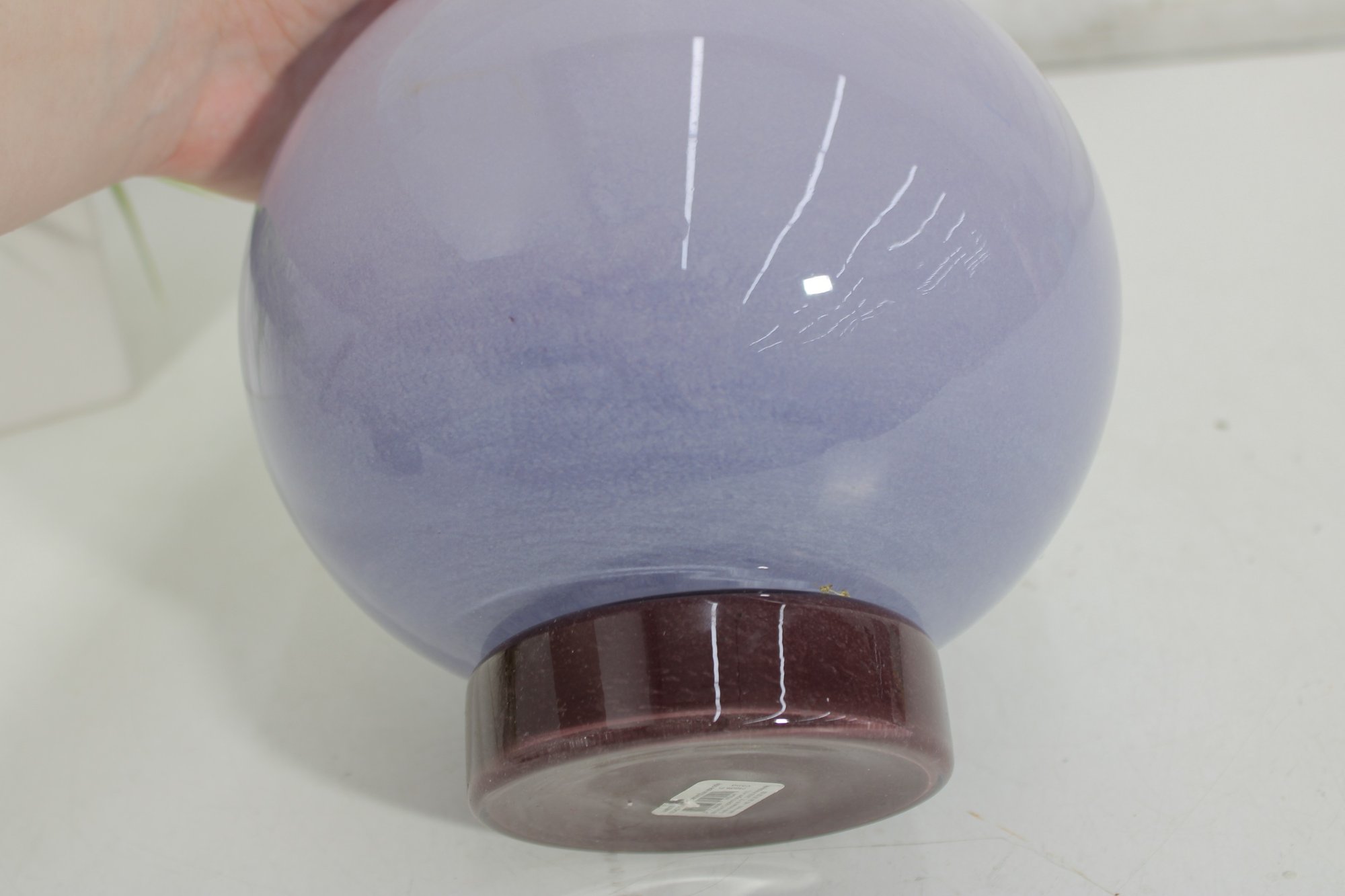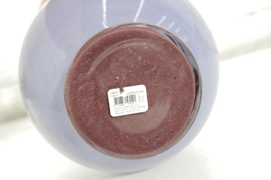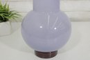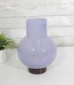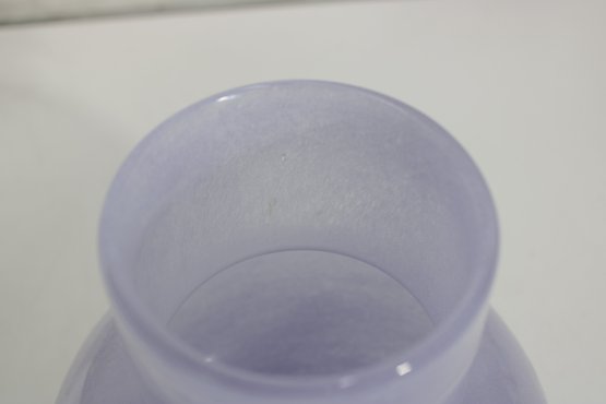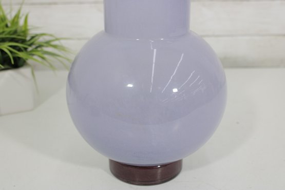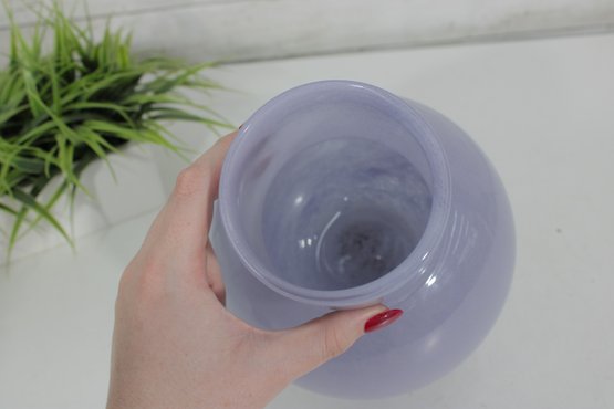 modern art glass vase featuring a soft lavender hue and a sculptural rounded body with a short cylindrical neck. The smooth, glossy finish and subtle internal variations in tone give the piece a refined and contemporary look.