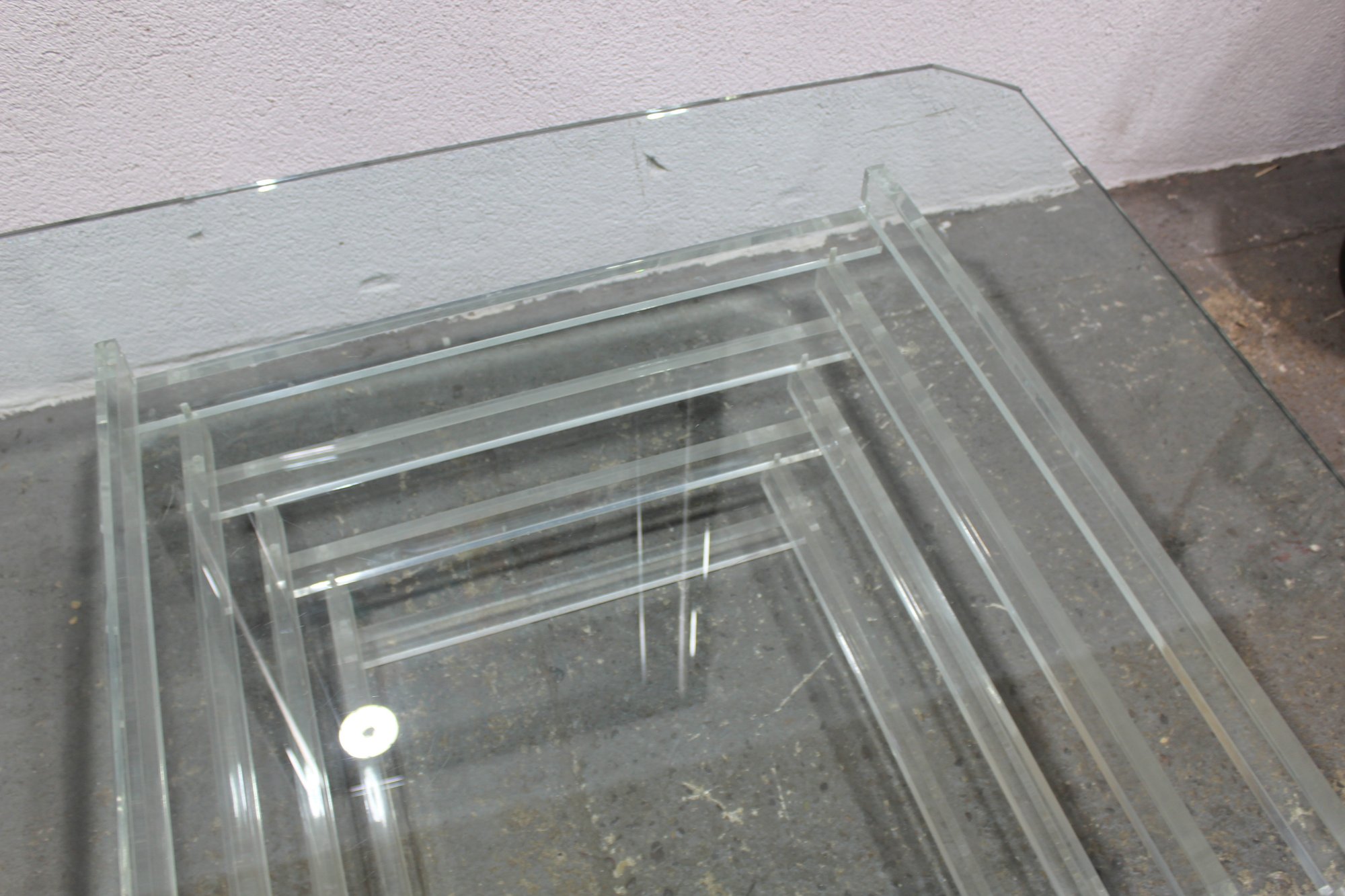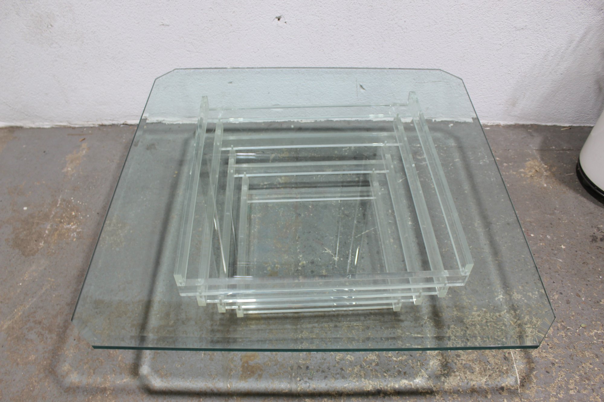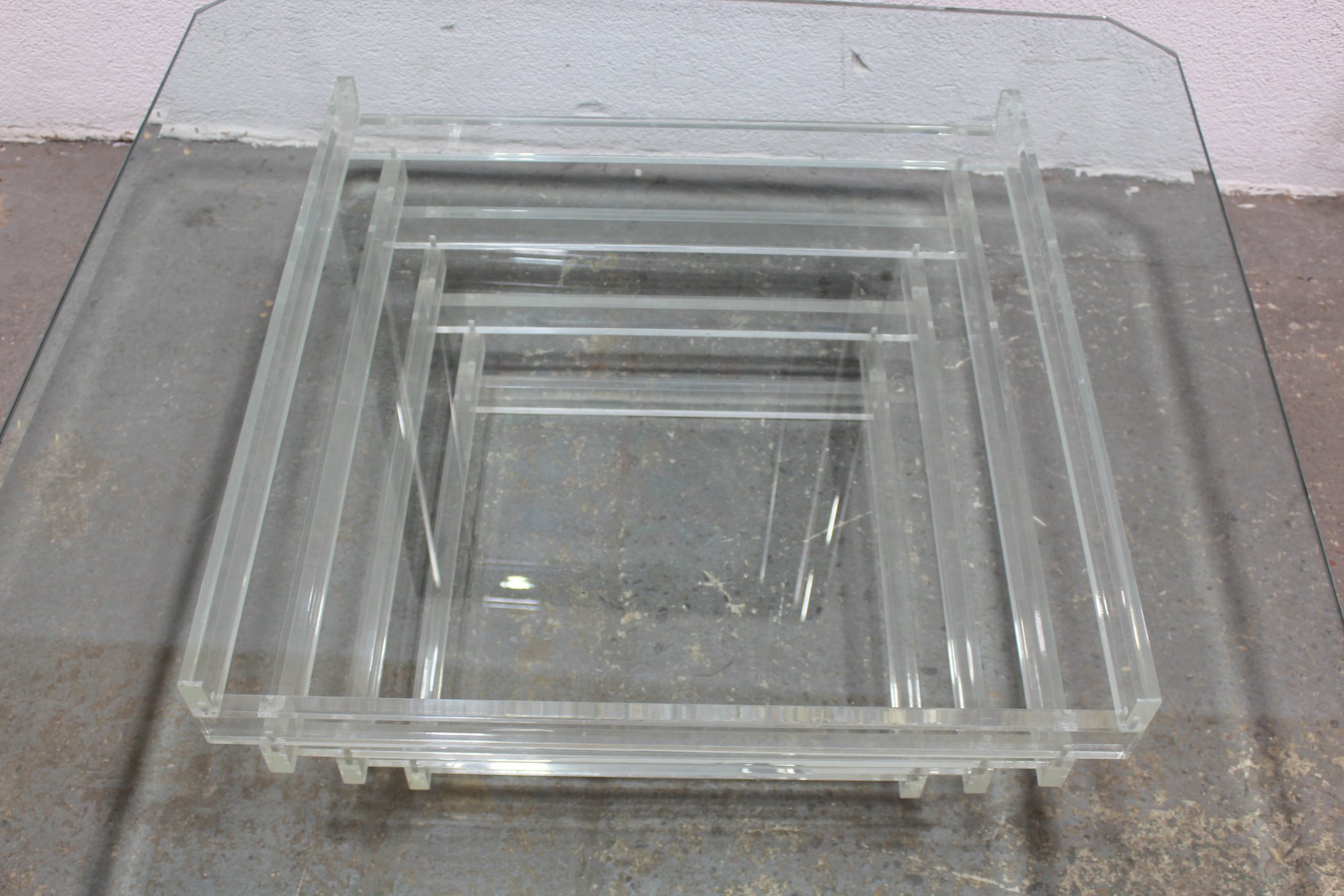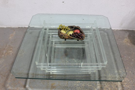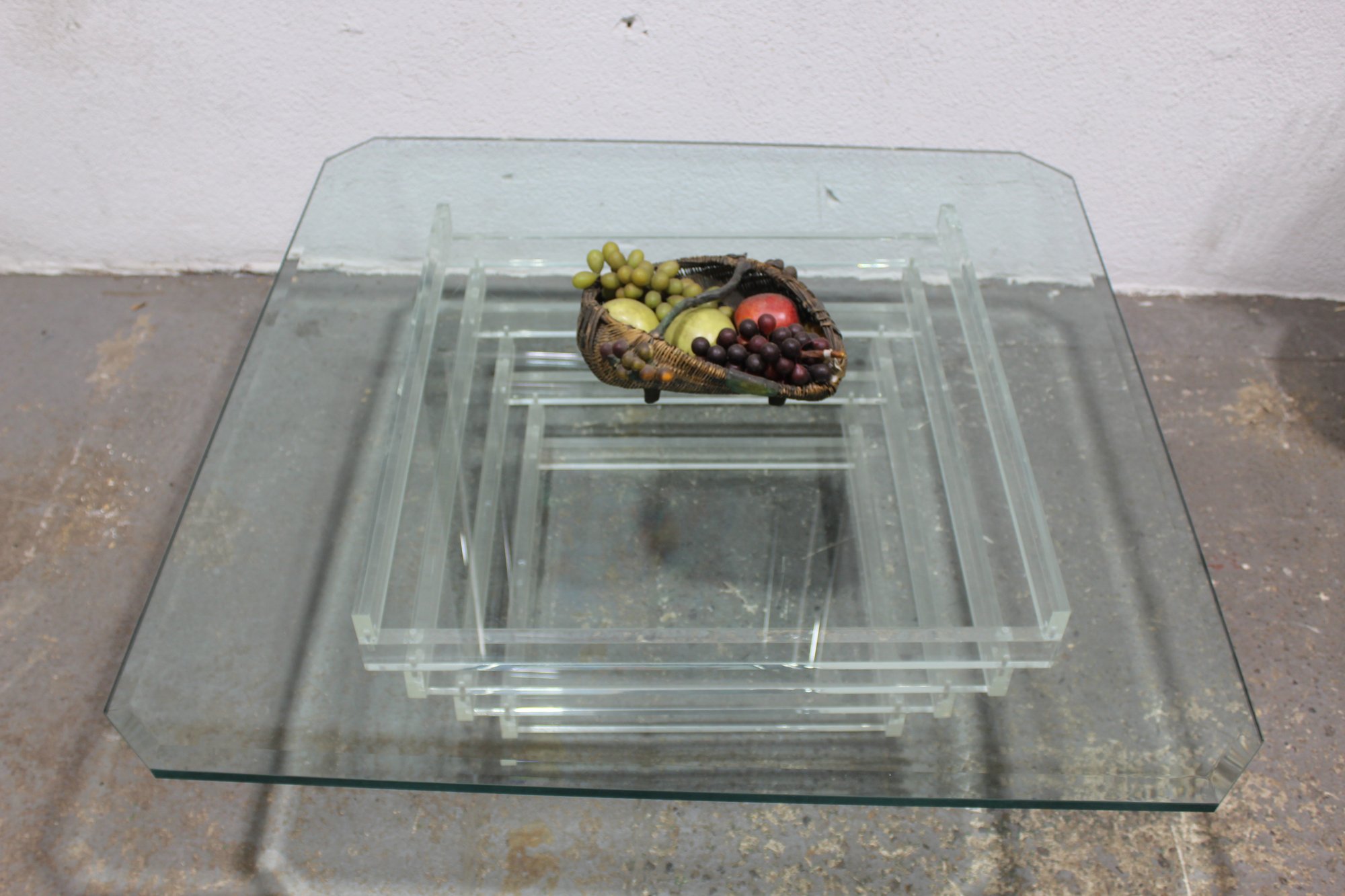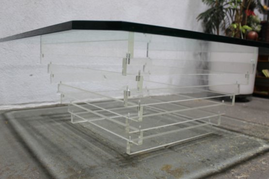 Striking modern coffee table featuring a clear Lucite geometric base topped with a thick square beveled glass surface. The tiered Lucite structure creates a sculptural, architectural form that reflects and refracts light beautifully, giving the piece an elegant floating effect.