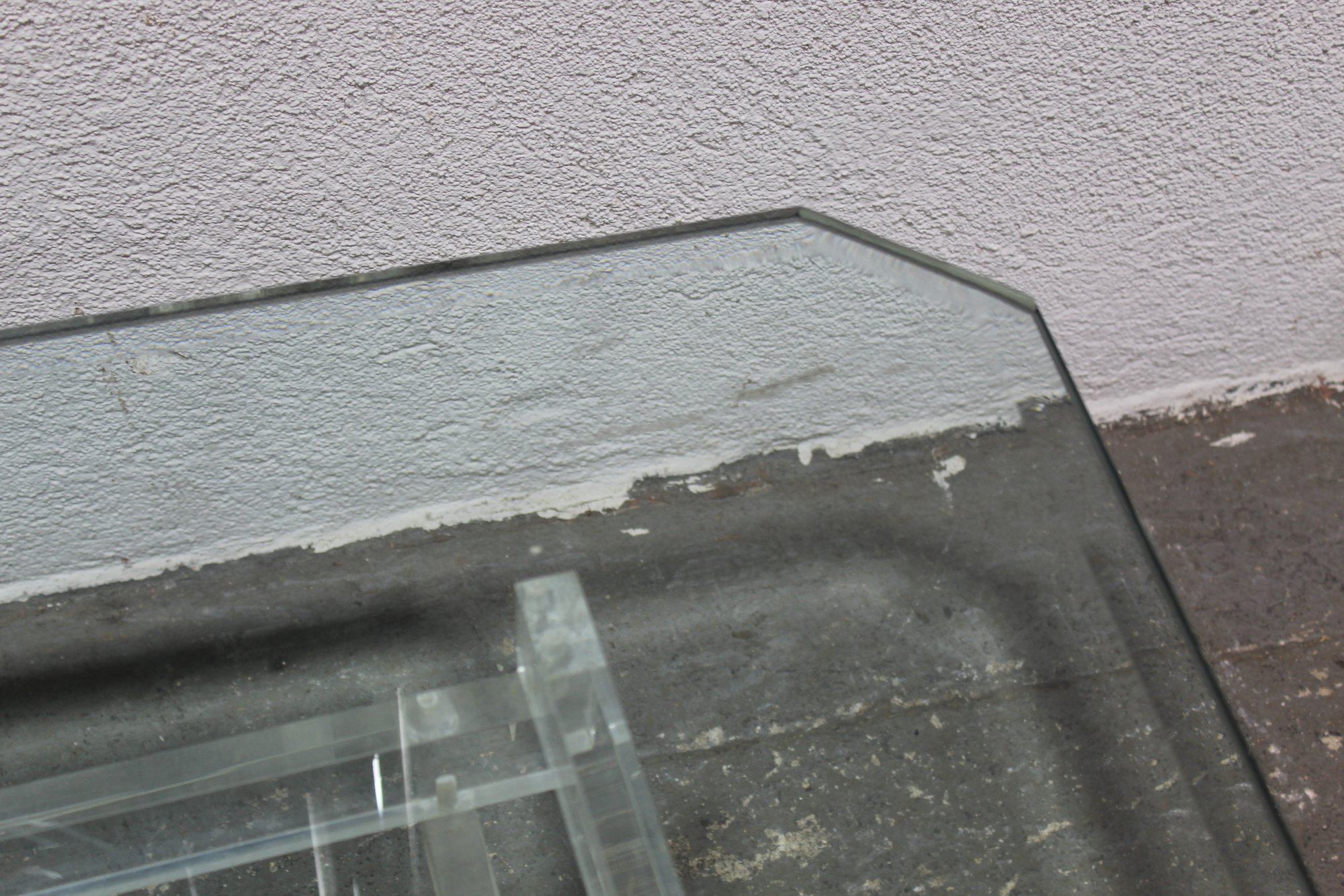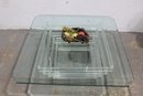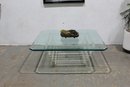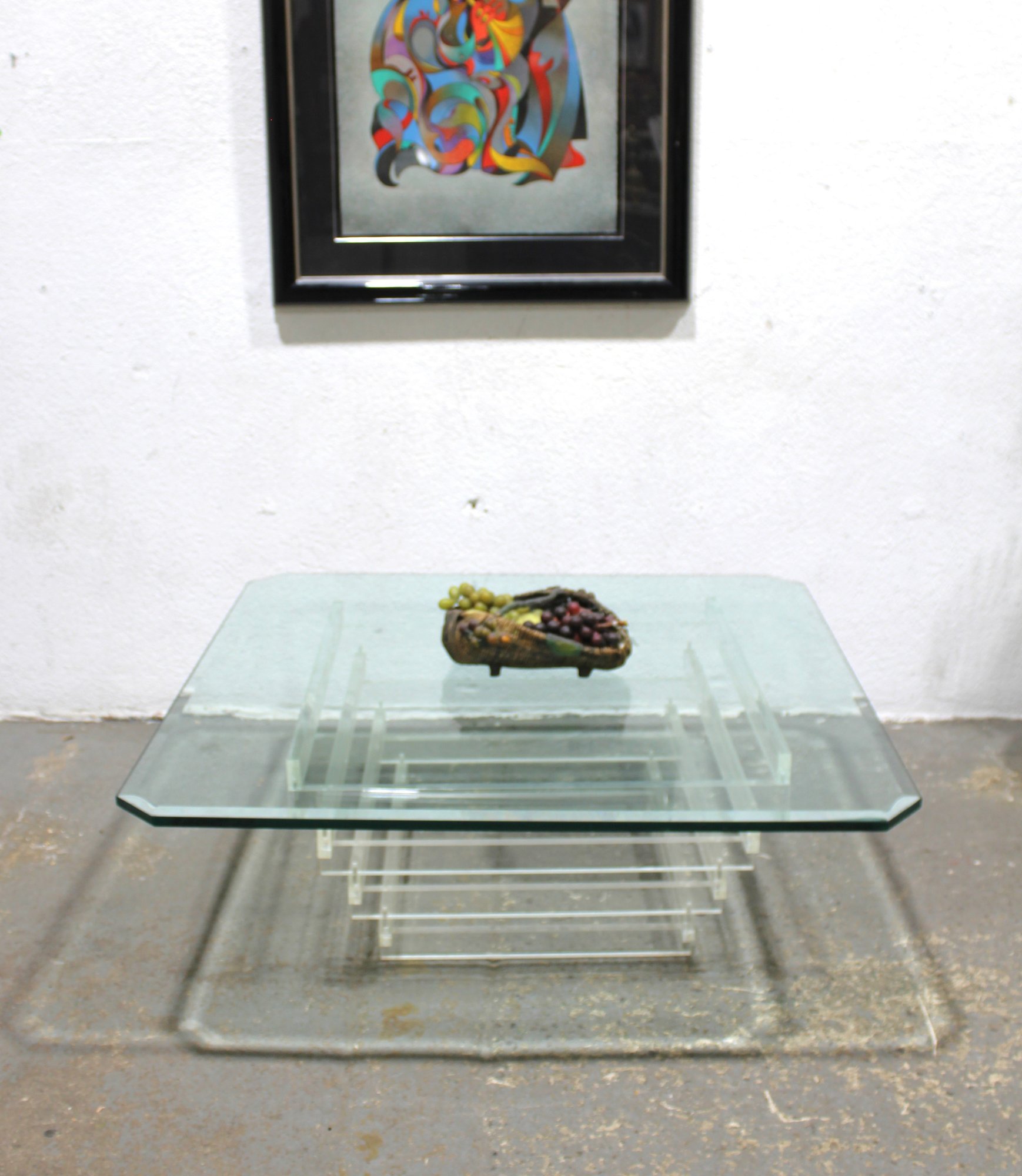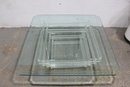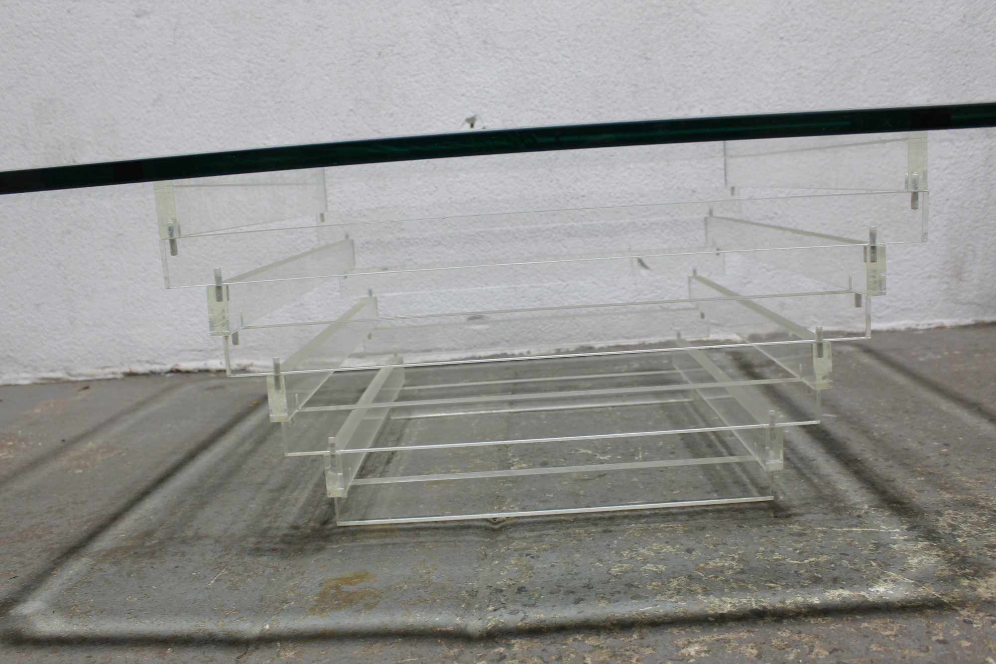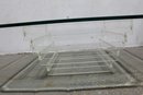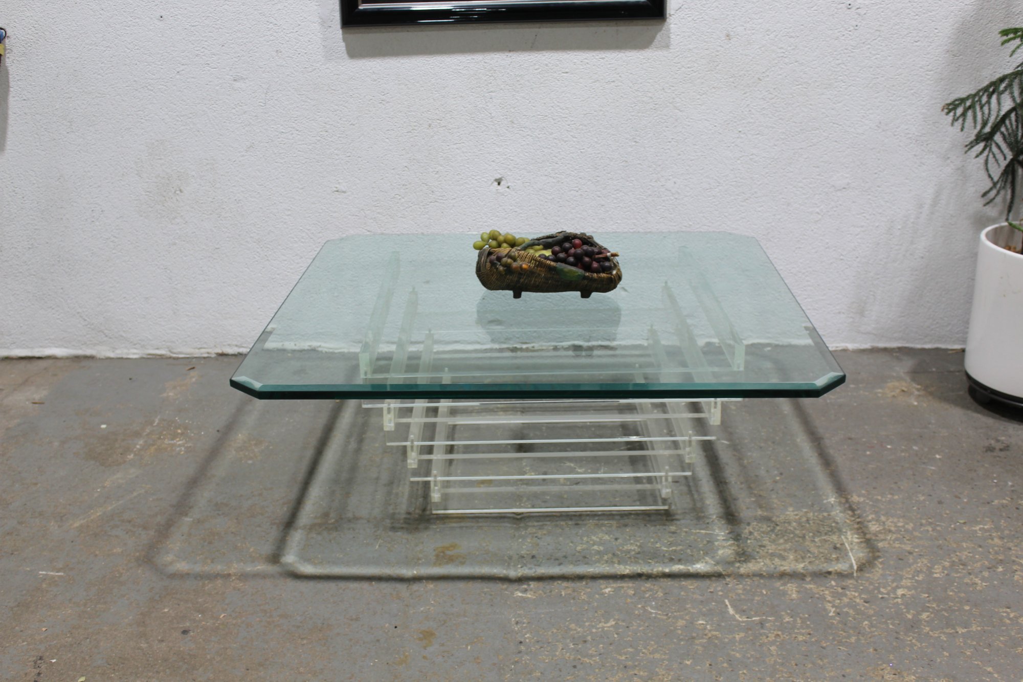 Striking modern coffee table featuring a clear Lucite geometric base topped with a thick square beveled glass surface. The tiered Lucite structure creates a sculptural, architectural form that reflects and refracts light beautifully, giving the piece an elegant floating effect.