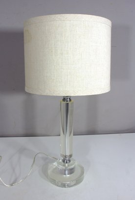 Sleek and modern, this 24-inch tall Lucite table lamp features a clear cylindrical base with chrome accents and a crisp white linen-style drum shade. The clean lines and minimalist materials make it a versatile piece that fits beautifully in contemporary, glam, or transitional interiors.
