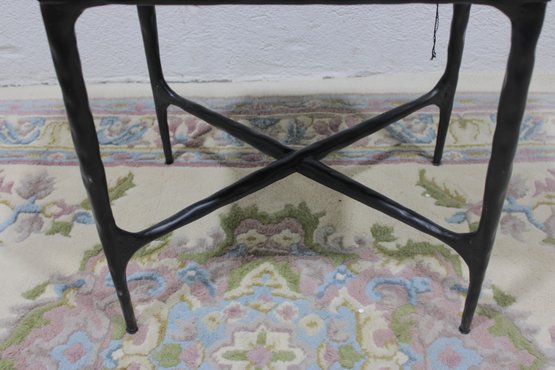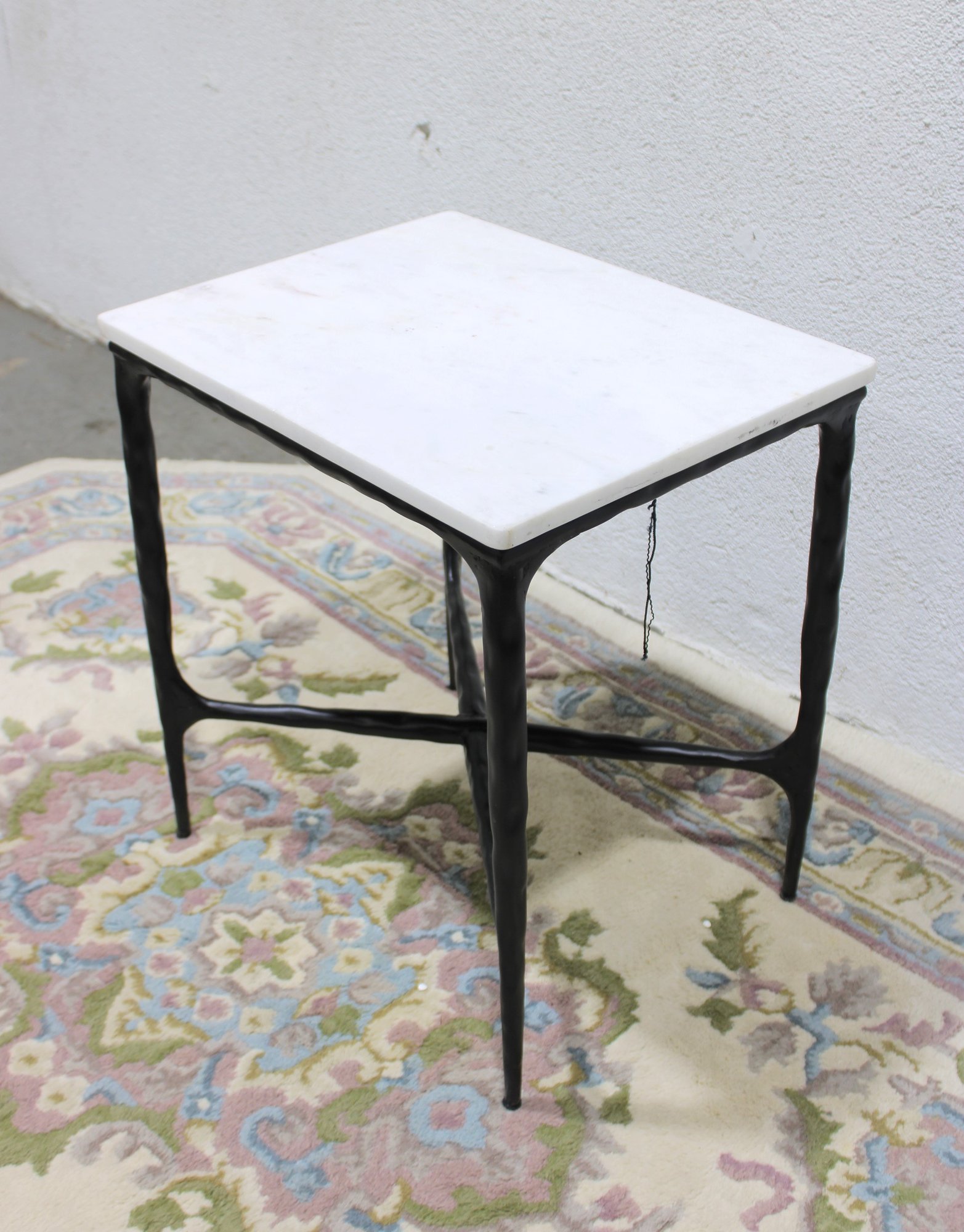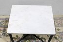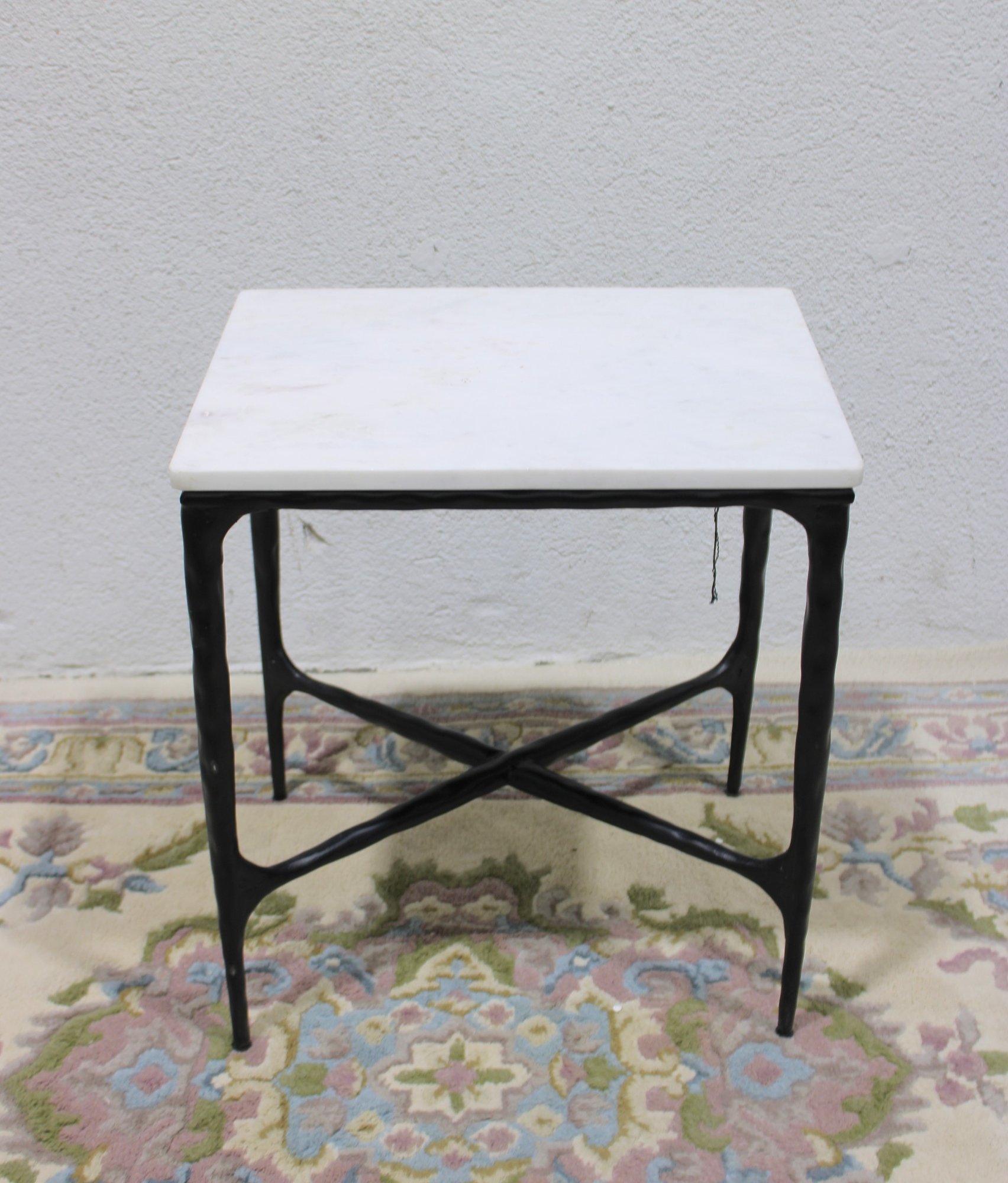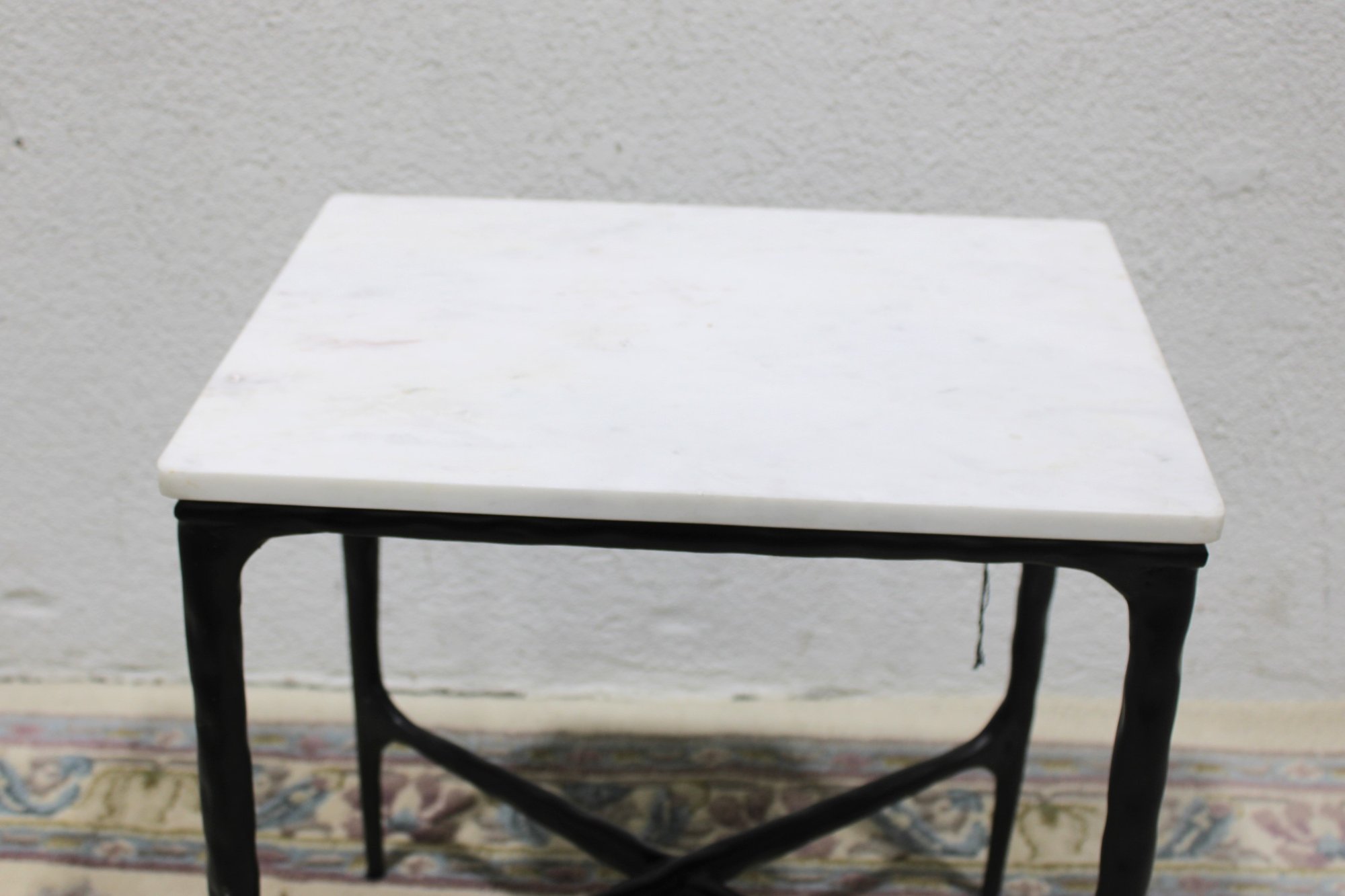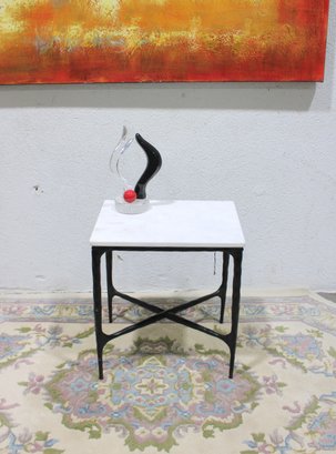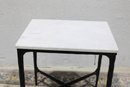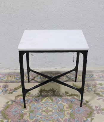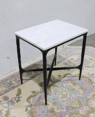 Modern accent side table featuring a rectangular white marble top set on a black metal base with X-form stretcher support. Clean lines and mixed materials give this piece a versatile look that works well in contemporary, industrial, or transitional interiors. Ideal for use as a side table, lamp table, or occasional table in a living room, bedroom, or office.