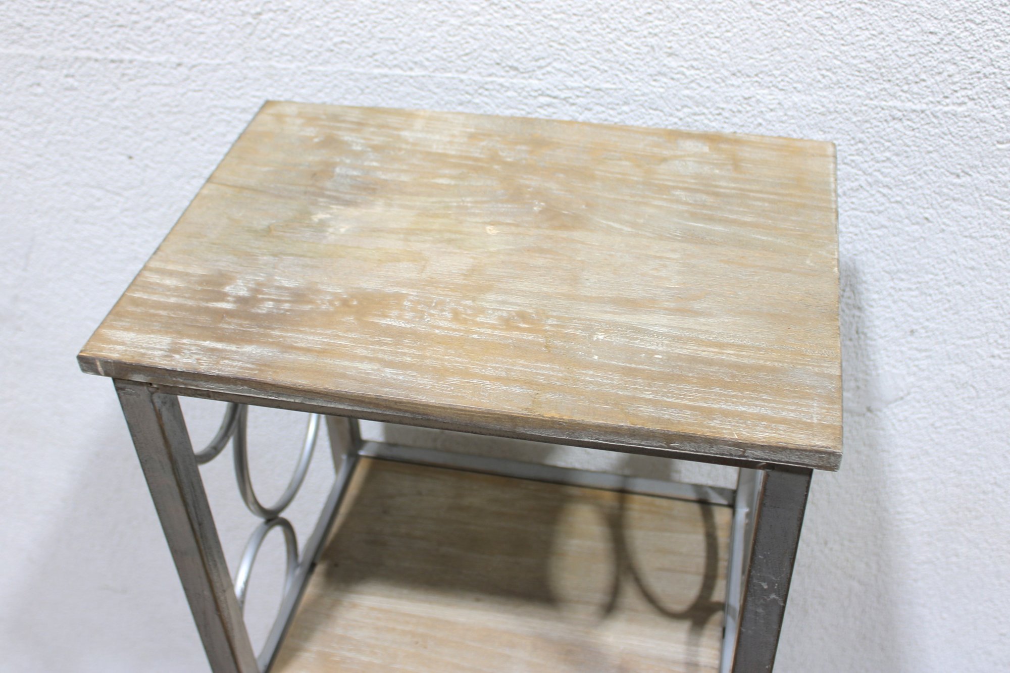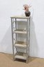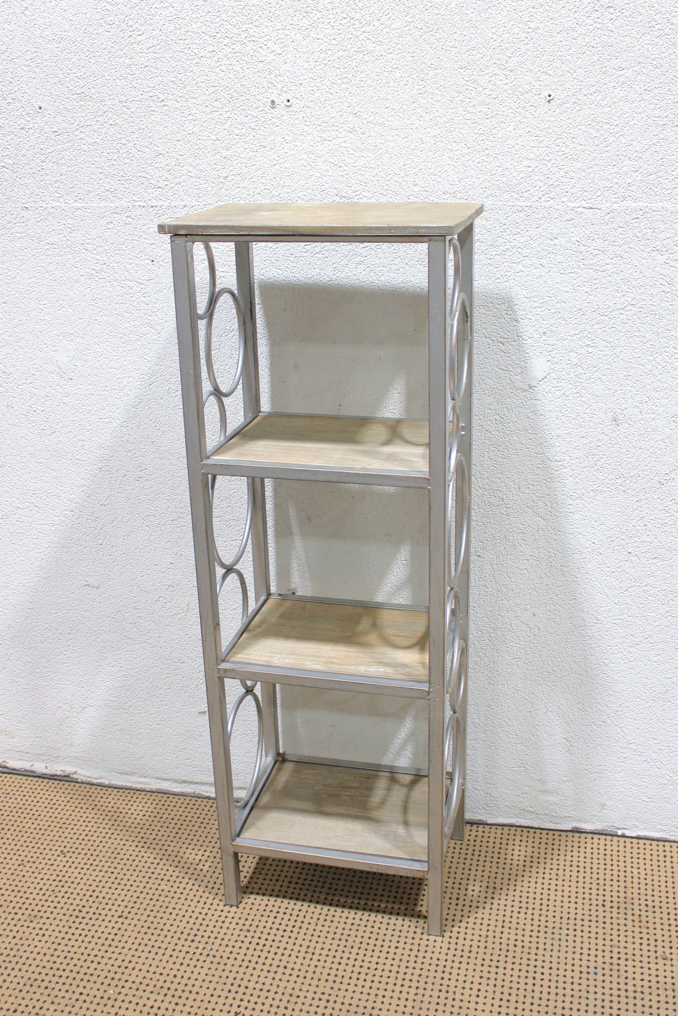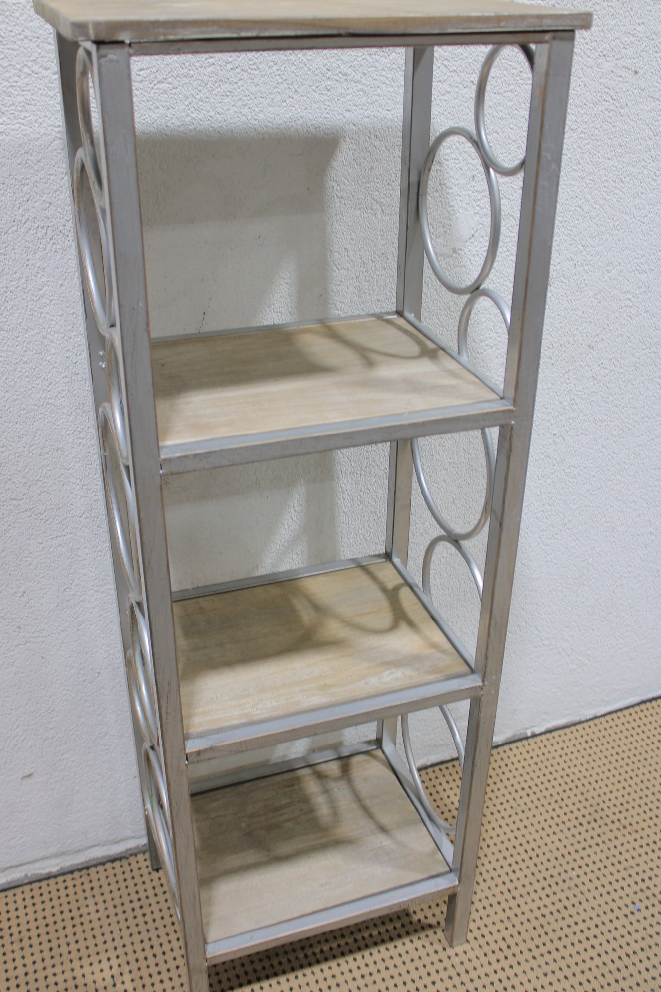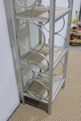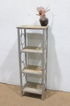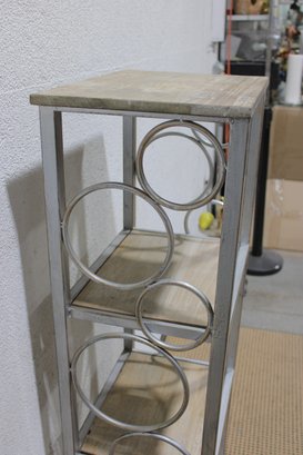 The open design with curved metal accents offers a contemporary look ideal for showcasing décor, plants, books, or collectibles in a living room, hallway, or bedroom. Neutral tones allow it to blend easily with modern, transitional, or minimalist interiors.