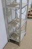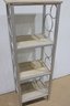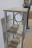 modern shelving stand featuring a sleek metal frame with glass shelves, measuring approximately 48" high x 17" wide x 12" deep. Its slim profile makes it perfect for small spaces while providing stylish vertical storage and display.