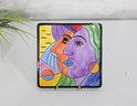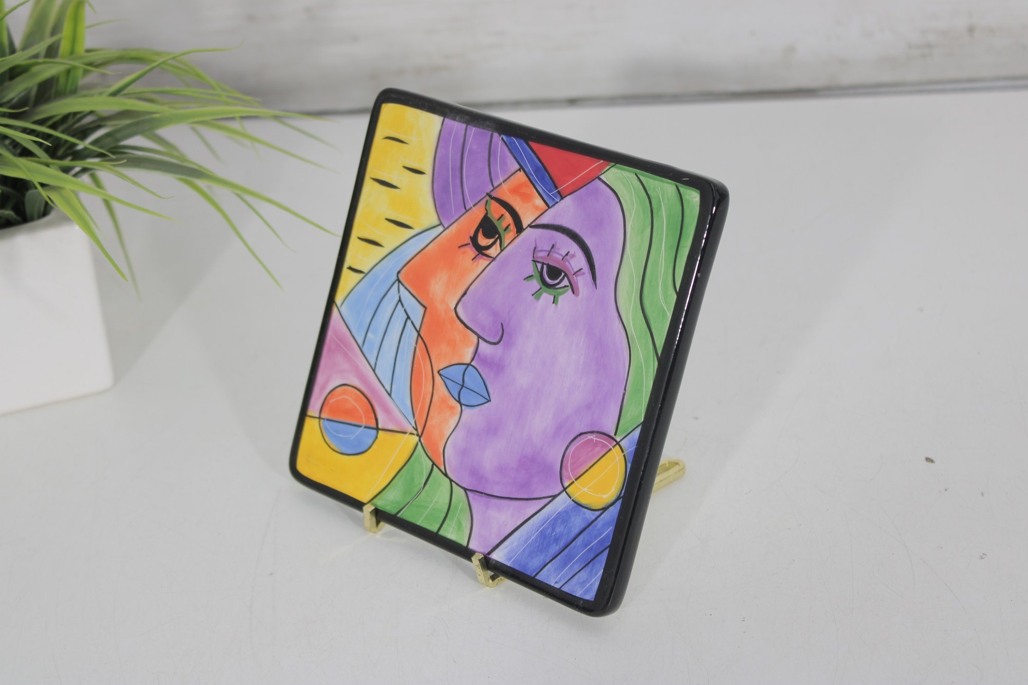 Vibrant modern ceramic art tile plaque featuring a bold, Picasso-inspired abstract face design. The colorful composition showcases expressive lines and geometric shapes in rich shades of purple, orange, yellow, blue, and green.